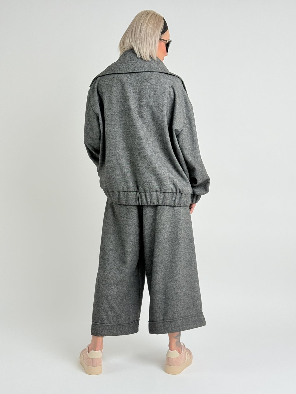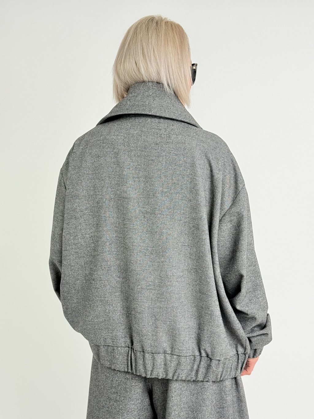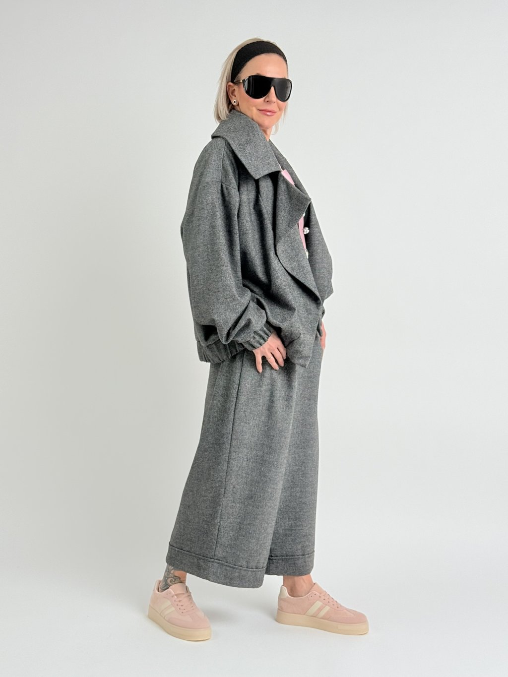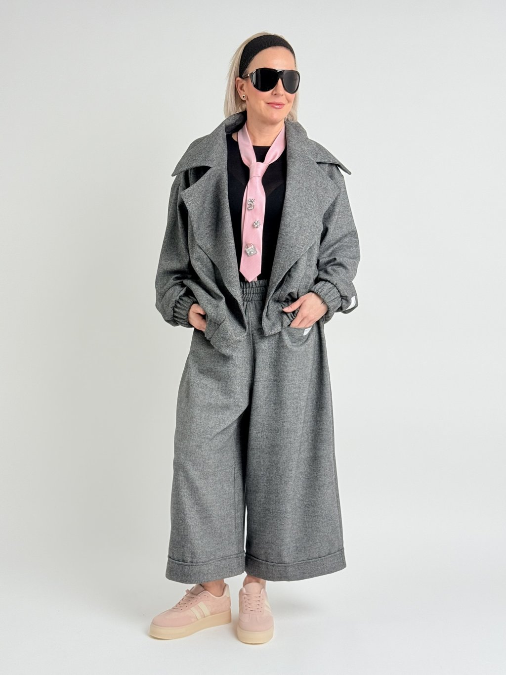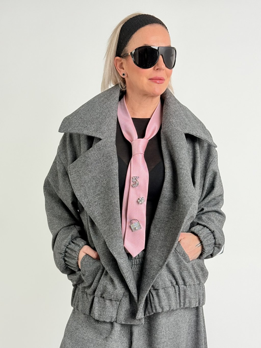 Luxusné sako s podšívkou, veľkými klopami, bez zapínania, s gumou na spodku a rukávoch a bočnými všitými vreckami. Doplnené o nohavice THESE.