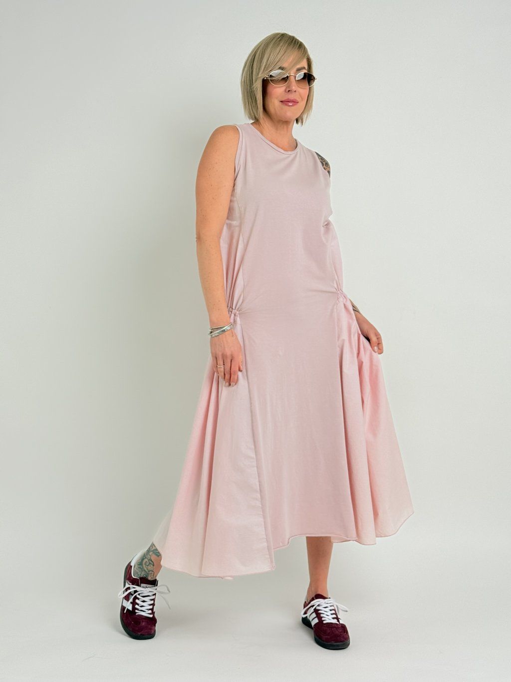 Šaty bez rukávov v kombinácii bavlneného úpletu a bavlny, s vyšším výstrihom, strihom do a a možnosťou úpravy šírky na bokoch.