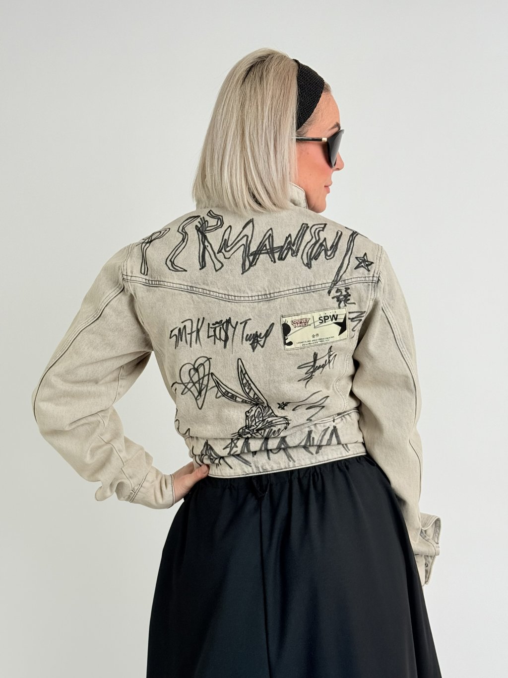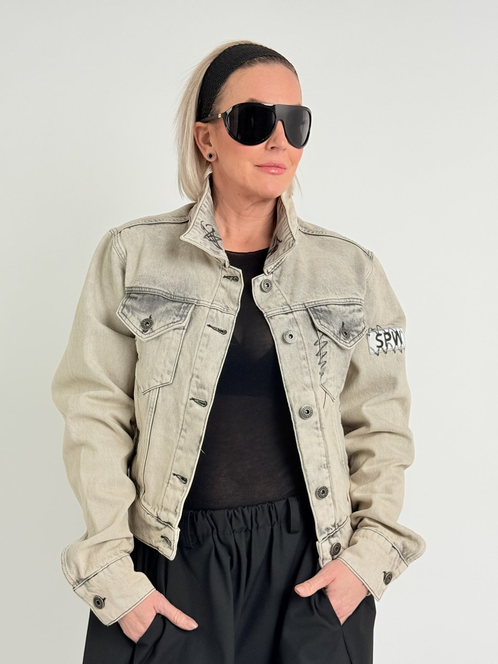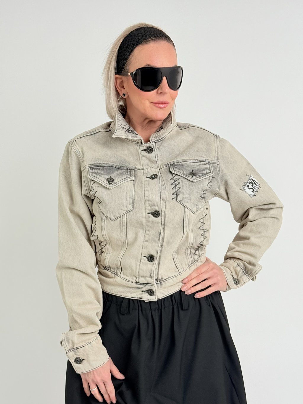 Luxusná džínsová bunda v béžovej farbe so sivou potlačou, so záplatou na chrbte, vyšším pásom a veľmi dlhými rukávmi.