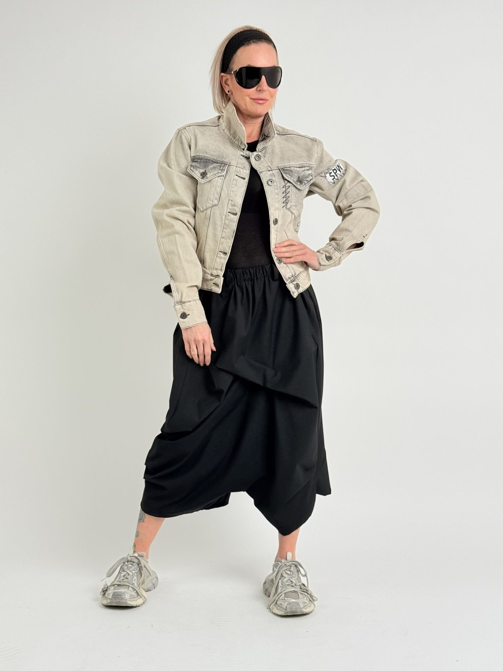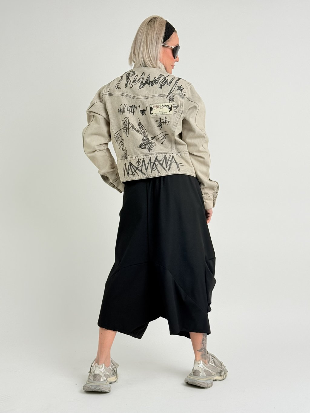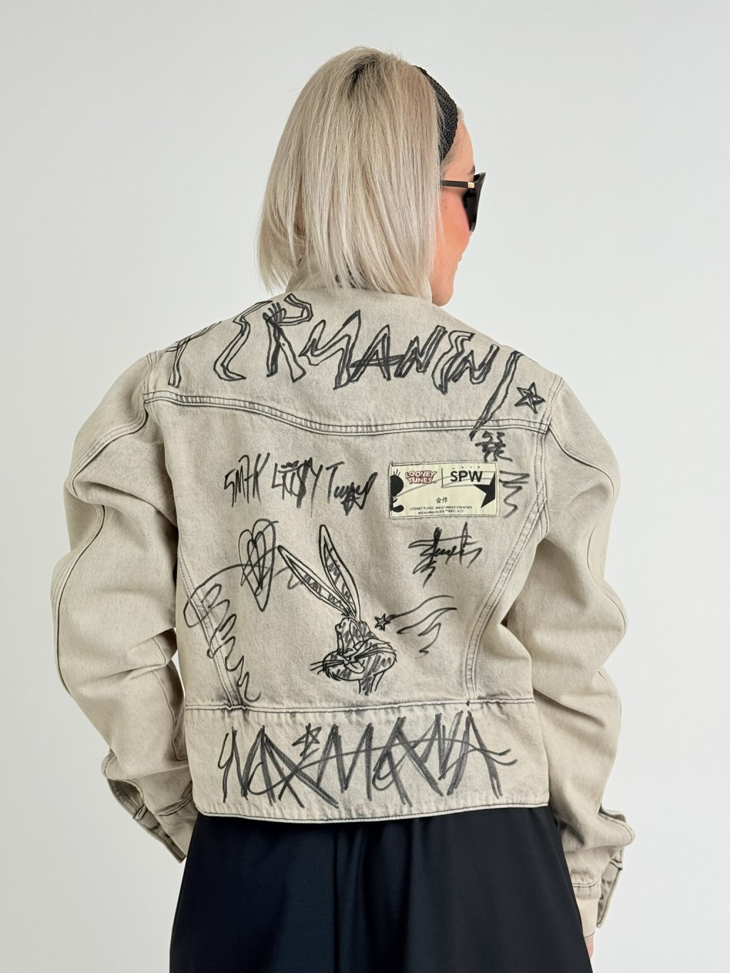 Luxusná džínsová bunda v béžovej farbe so sivou potlačou, so záplatou na chrbte, vyšším pásom a veľmi dlhými rukávmi.