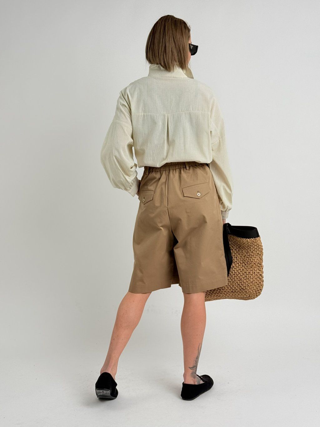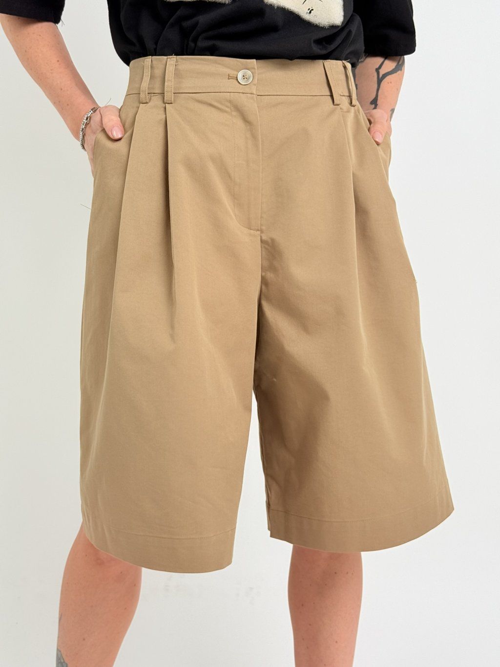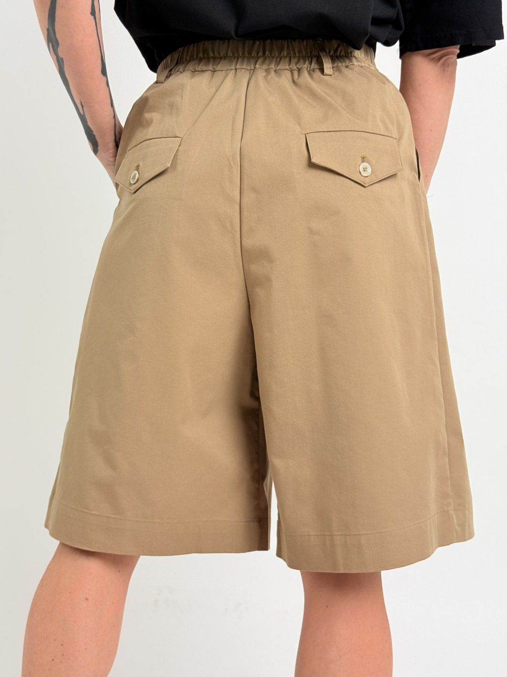 Bermudy v zadnej časti pásu sú elastické a majú vrecká s chlopňami a gombíkom, v prednej časti sú tiež vrecká, patentky a pútka na opasok.MIERKA!!!!