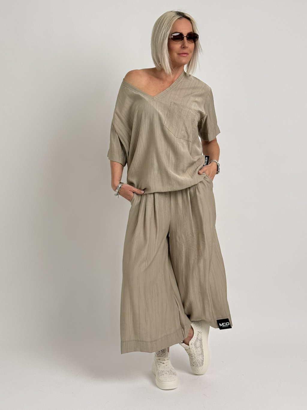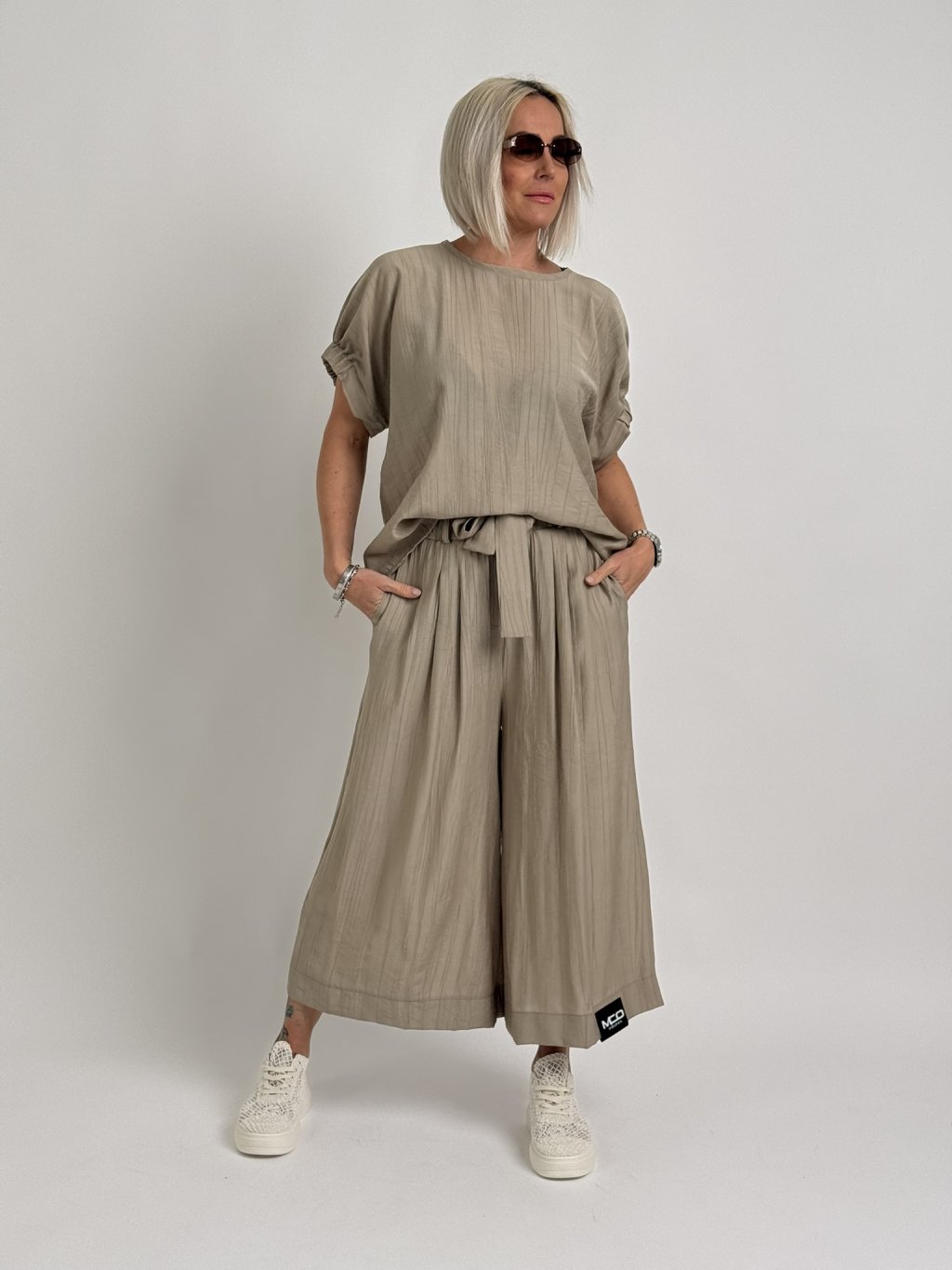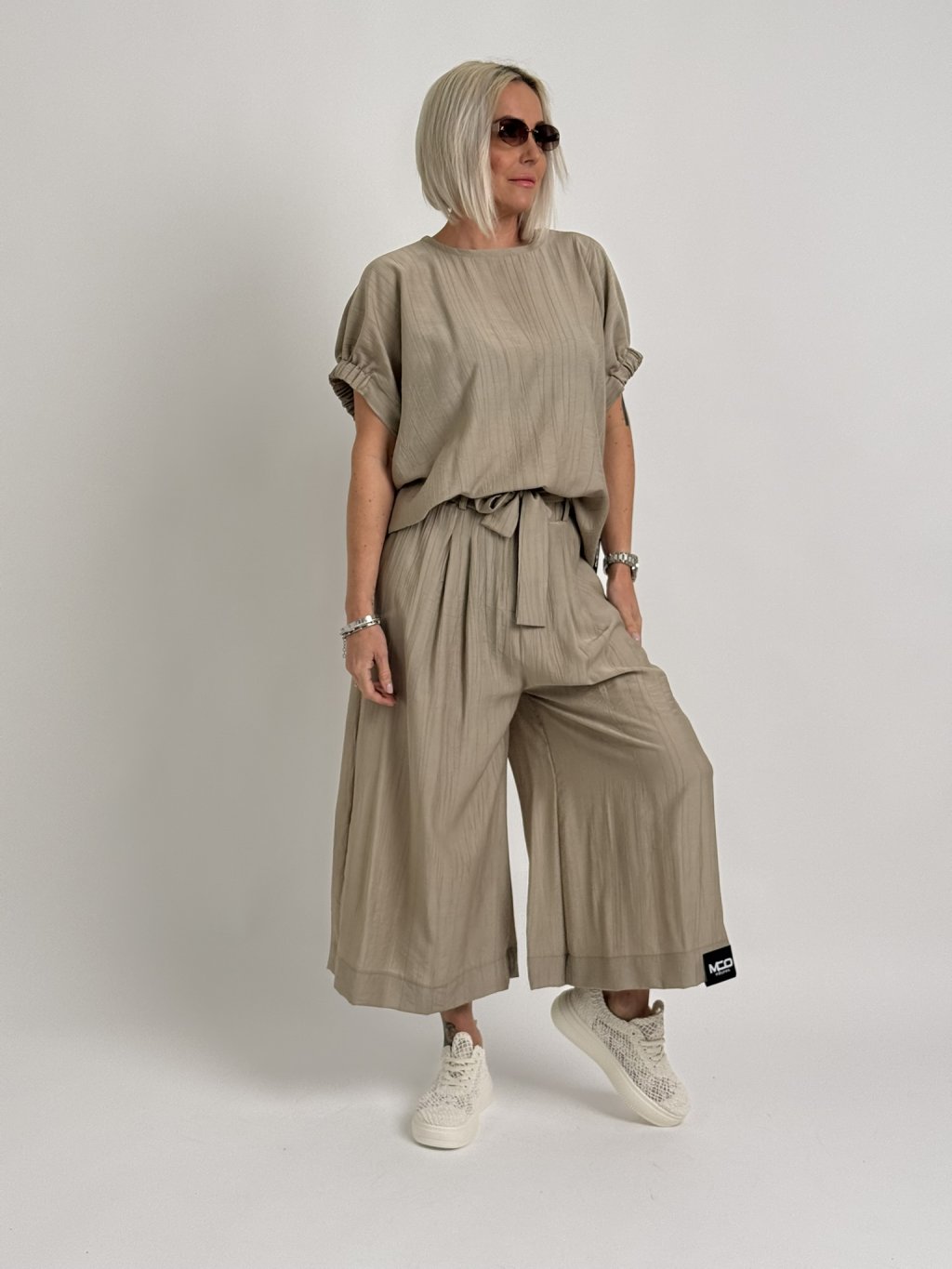 Dokonalé, široké 7/8 nohavice, elastický pás a opasok s motýlikom. Krásny, ľahký, takmer nemačkavý materiál.