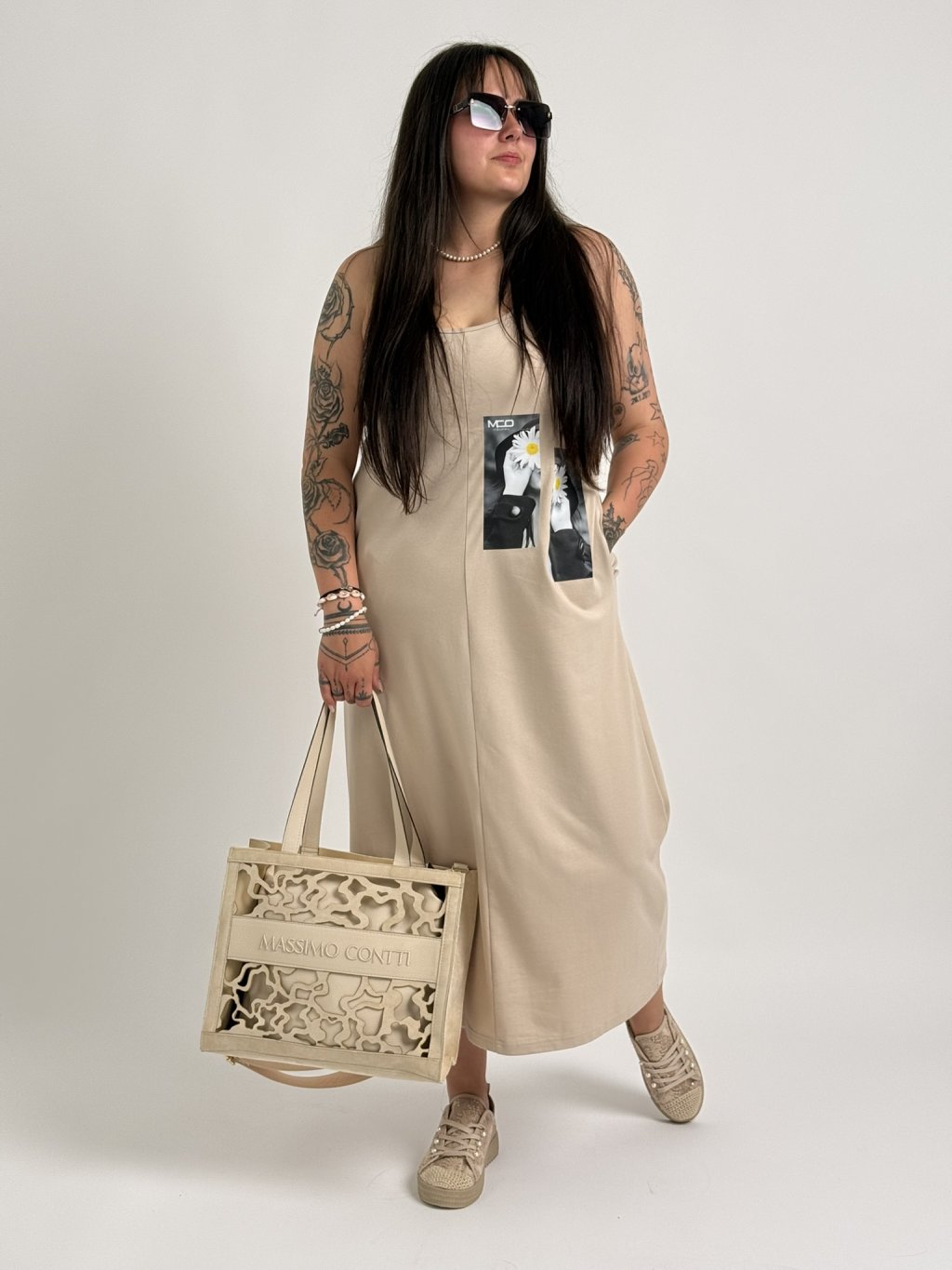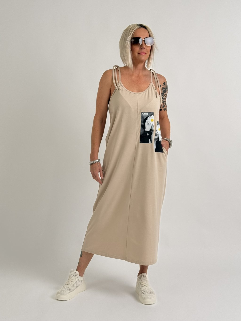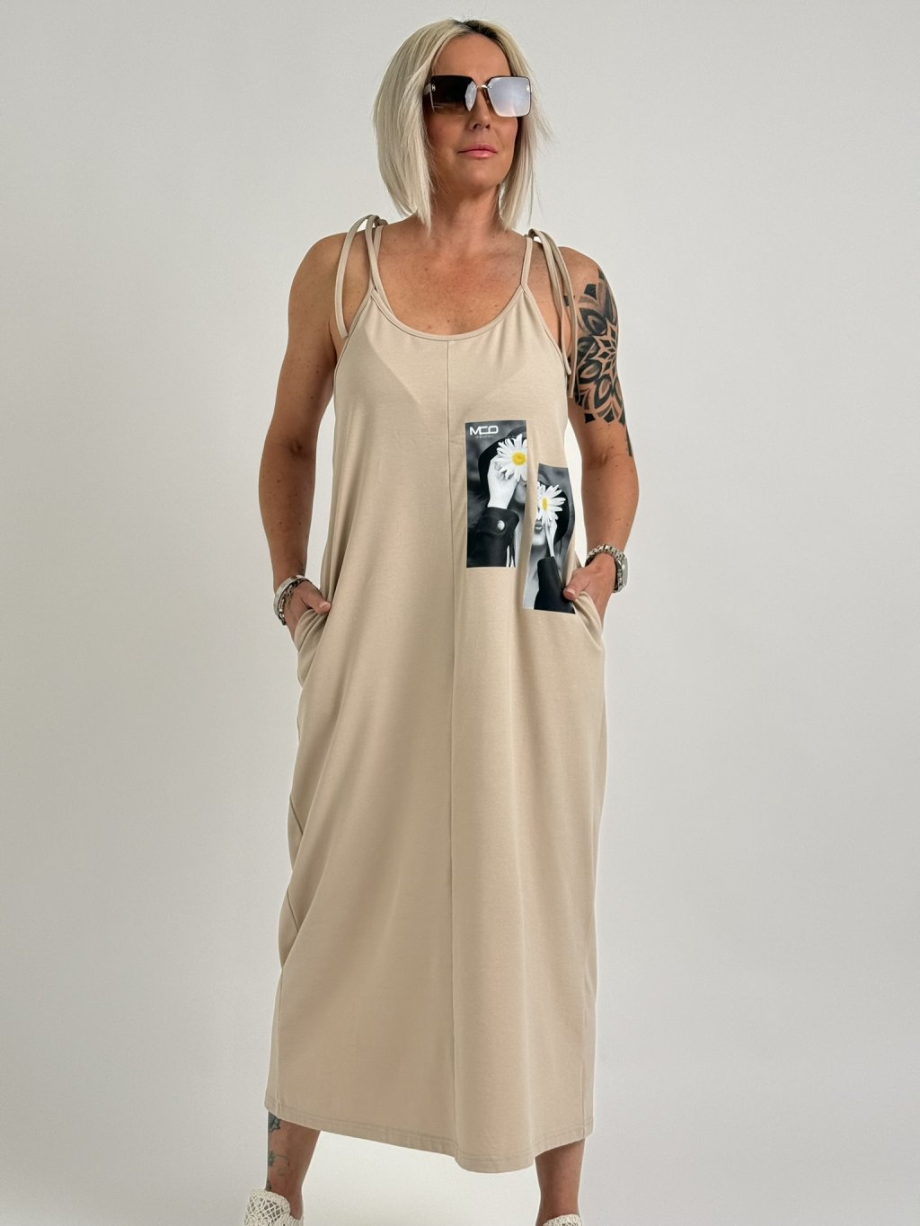Jednoduché bavlnené šaty bez ramienok s potlačou na prednej strane.