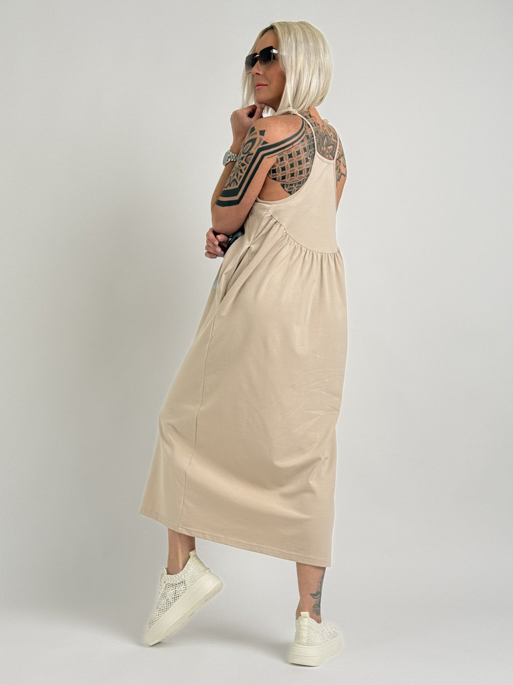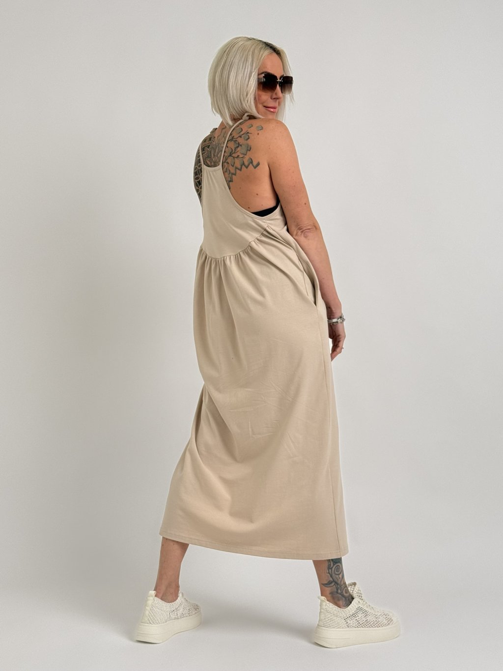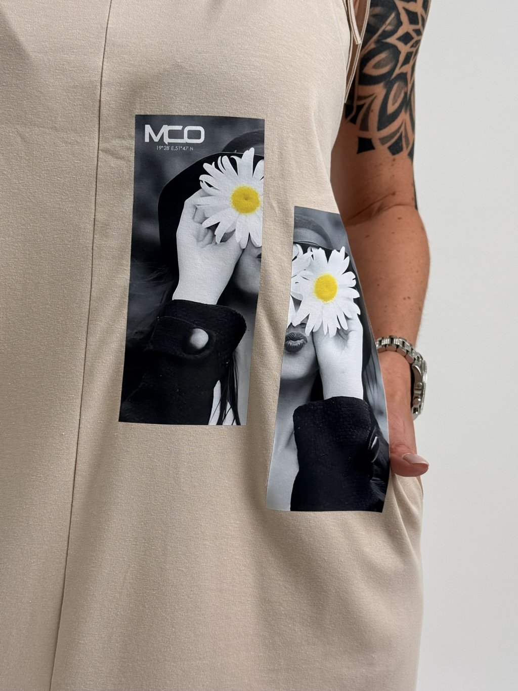 Jednoduché bavlnené šaty bez ramienok s potlačou na prednej strane.