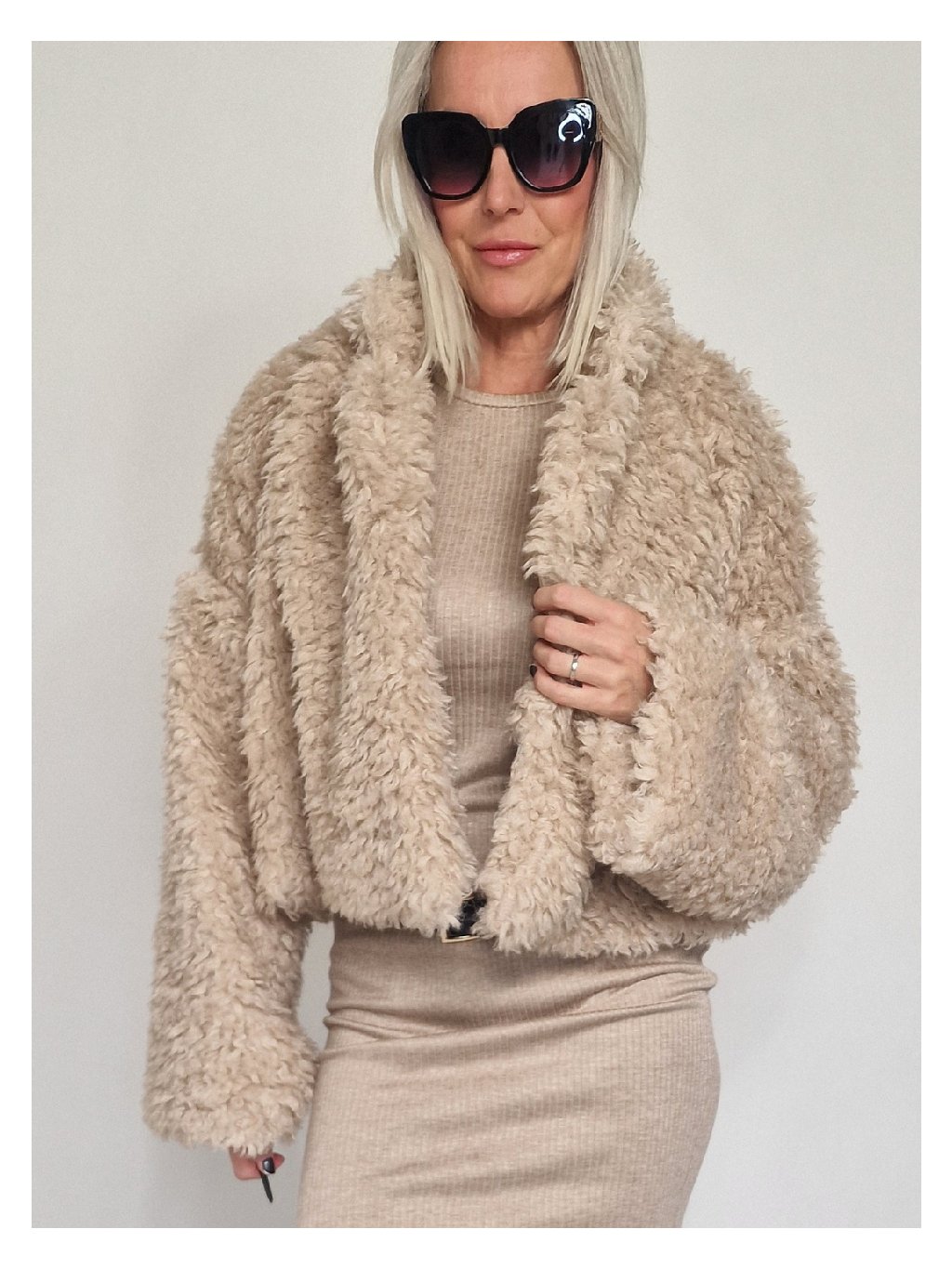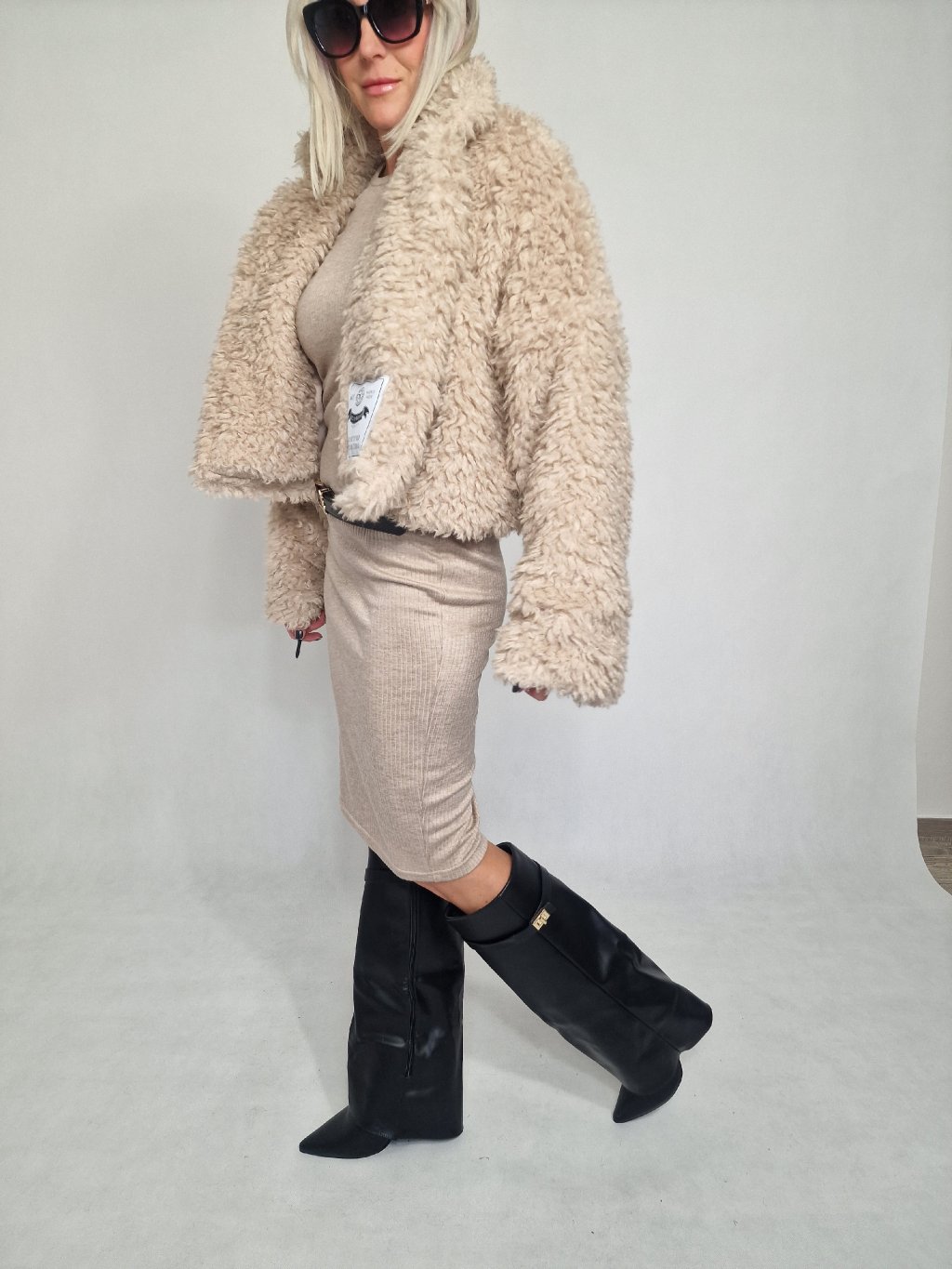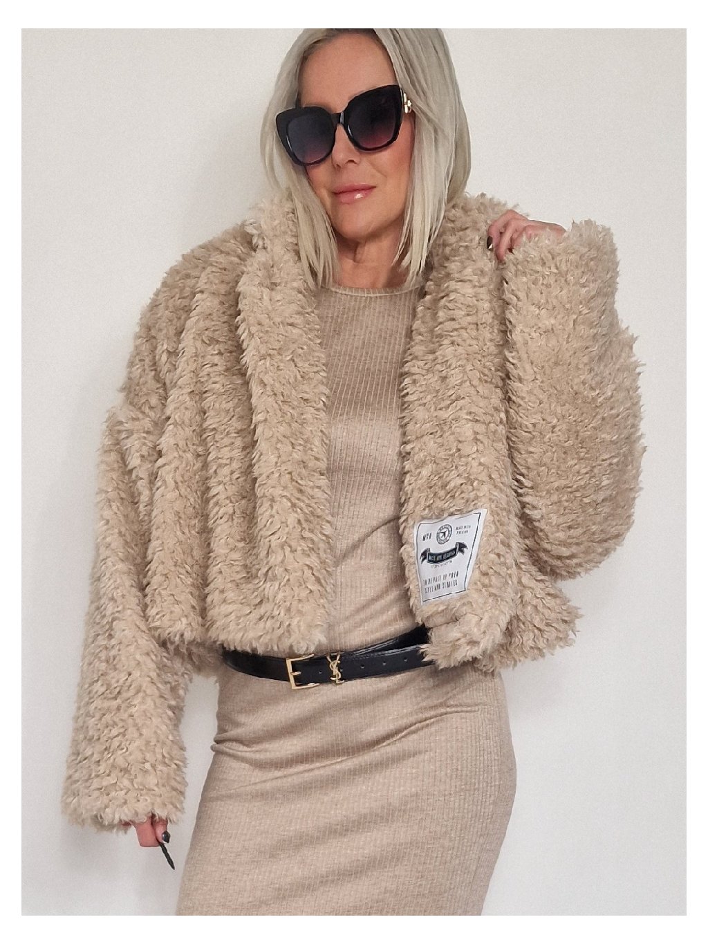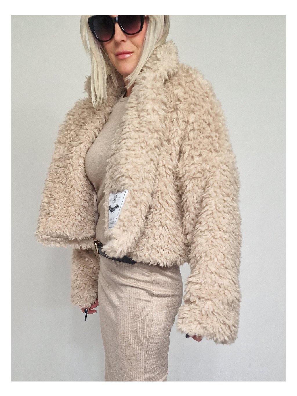 Skvelý krátky kožuch bez zapínania, s veľkou nášivkou na prednej strane. Krásne doplní každý outfit.