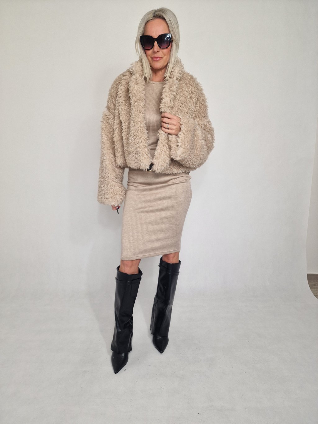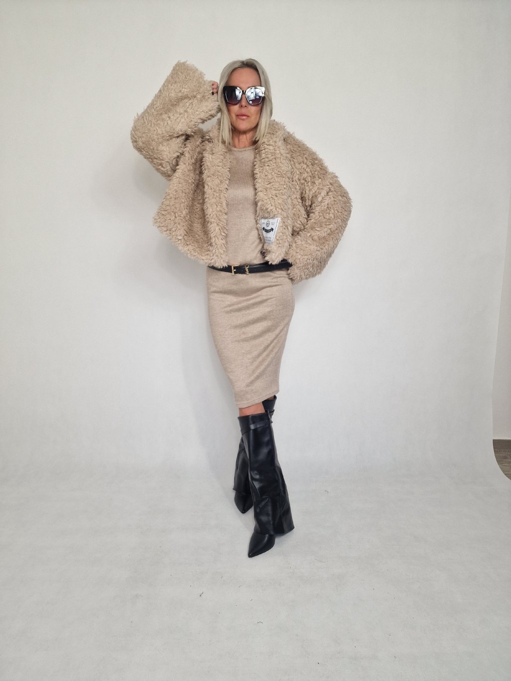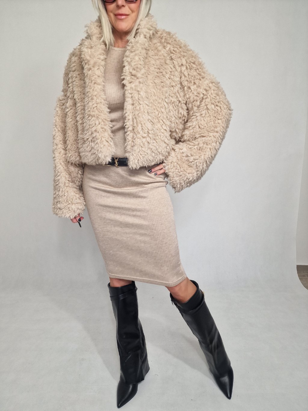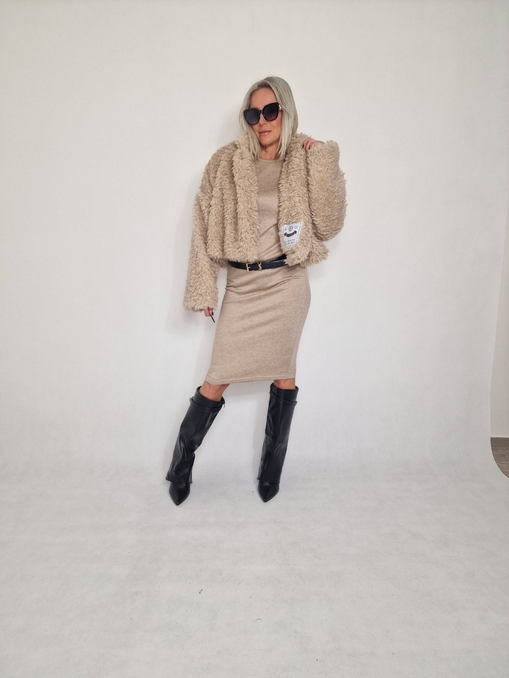 Skvelý krátky kožuch bez zapínania, s veľkou nášivkou na prednej strane. Krásne doplní každý outfit.