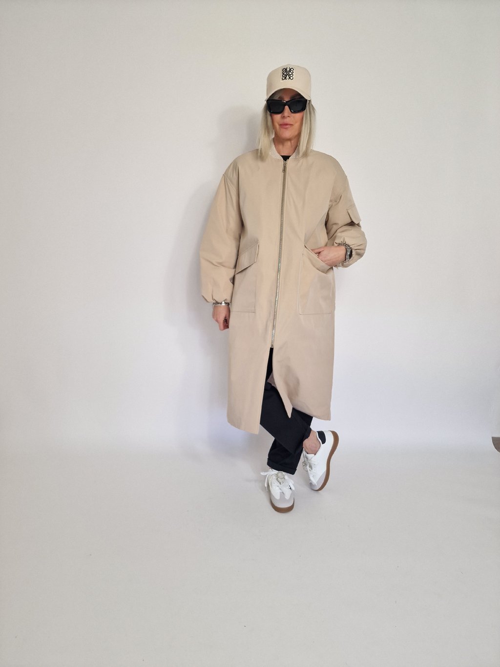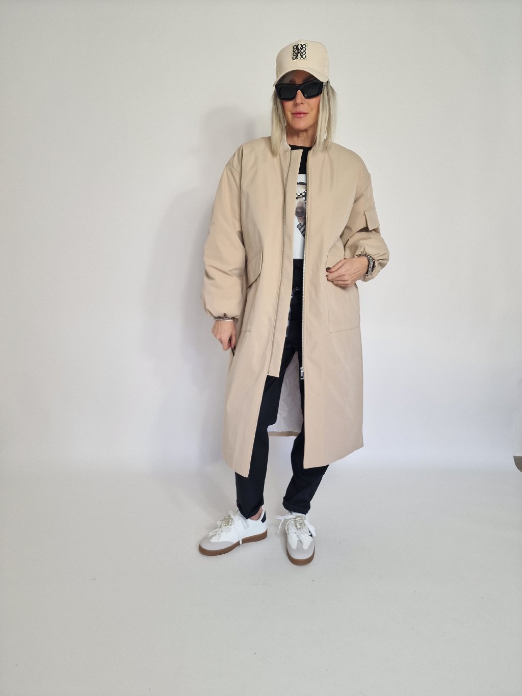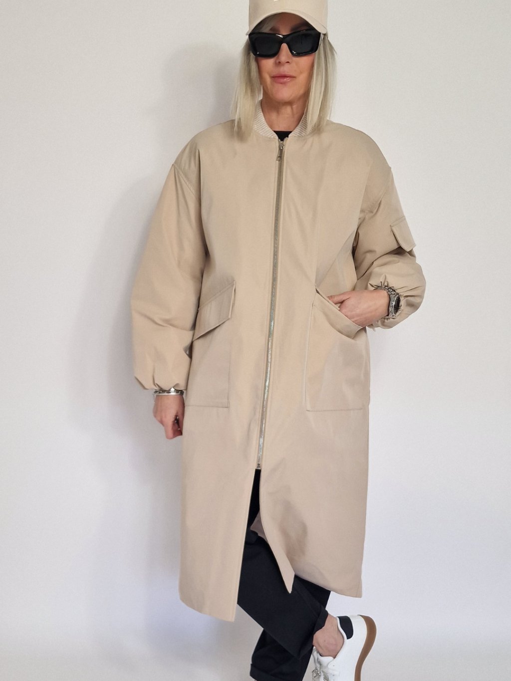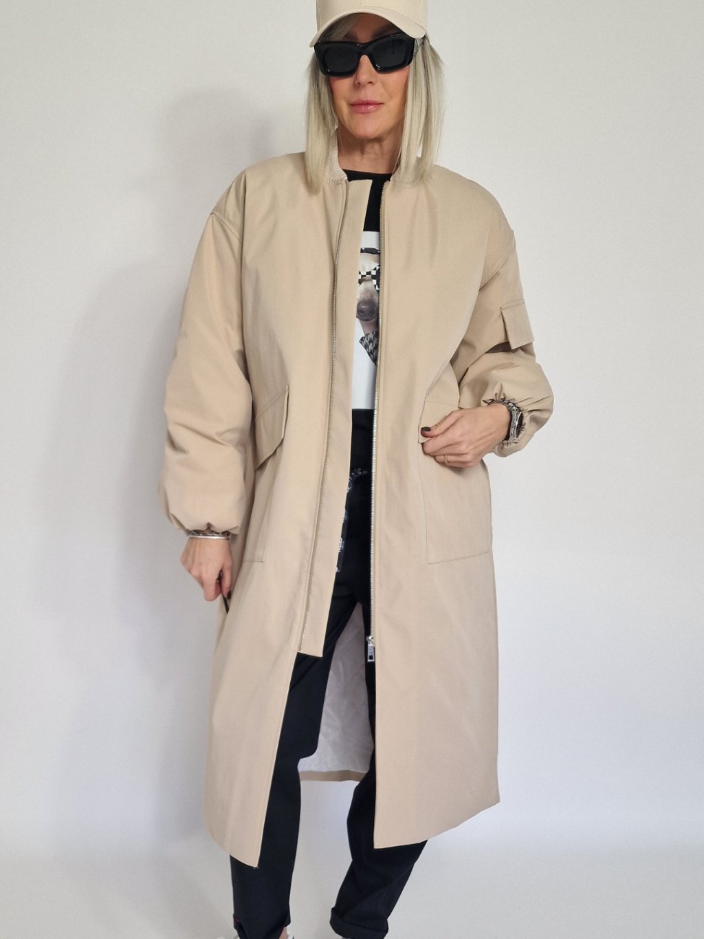 Skvelý bomber kabát s prešívanou podšívkou, zapínaním na zips, rukávmi ukončenými gumou, nášivkou vo výstrihu a veľkými vreckami s nášivkami.