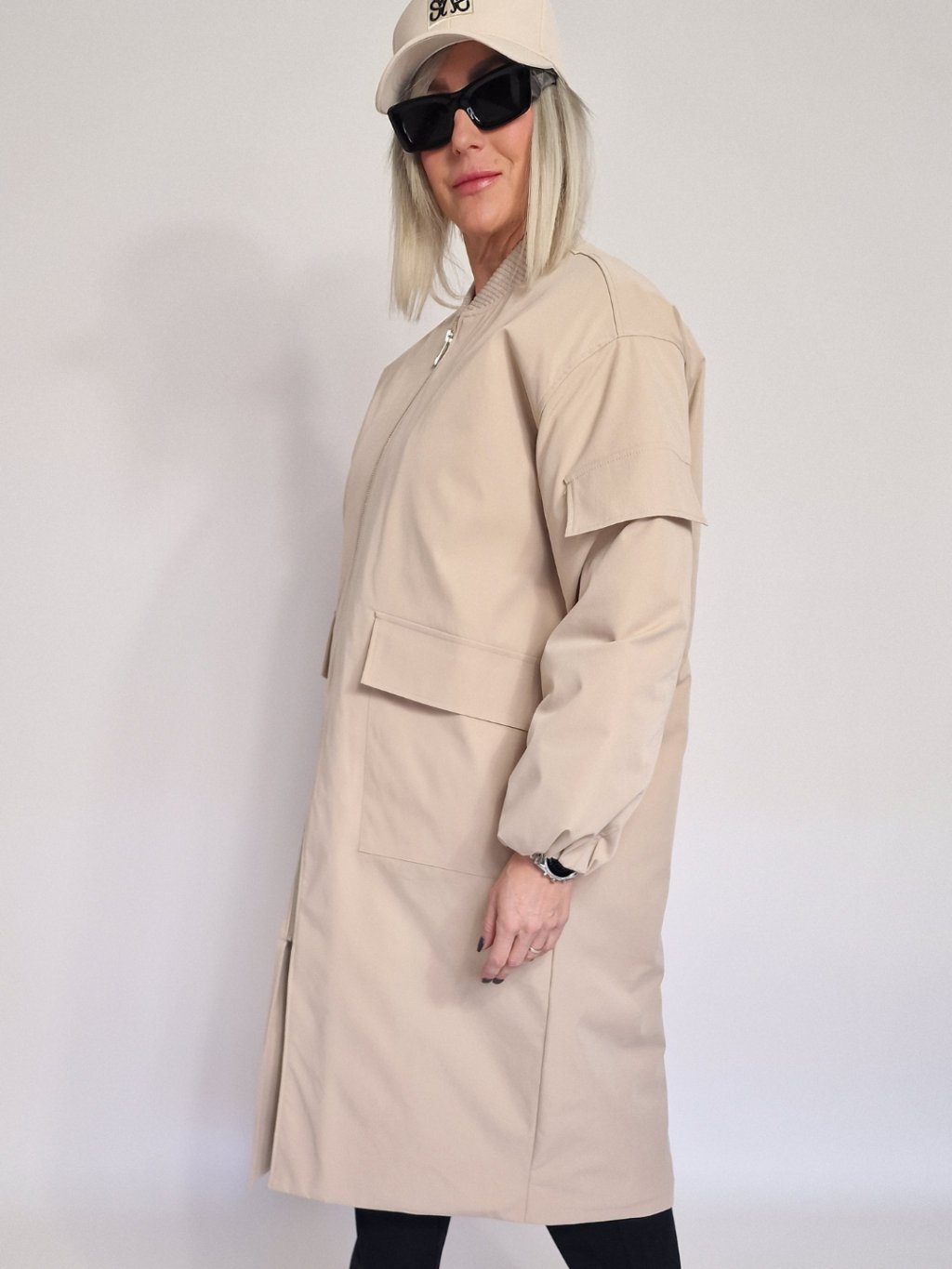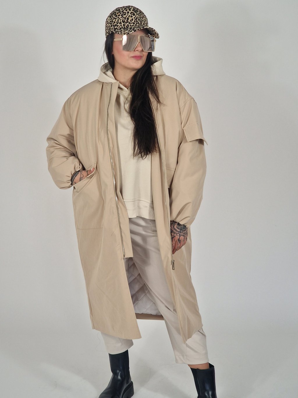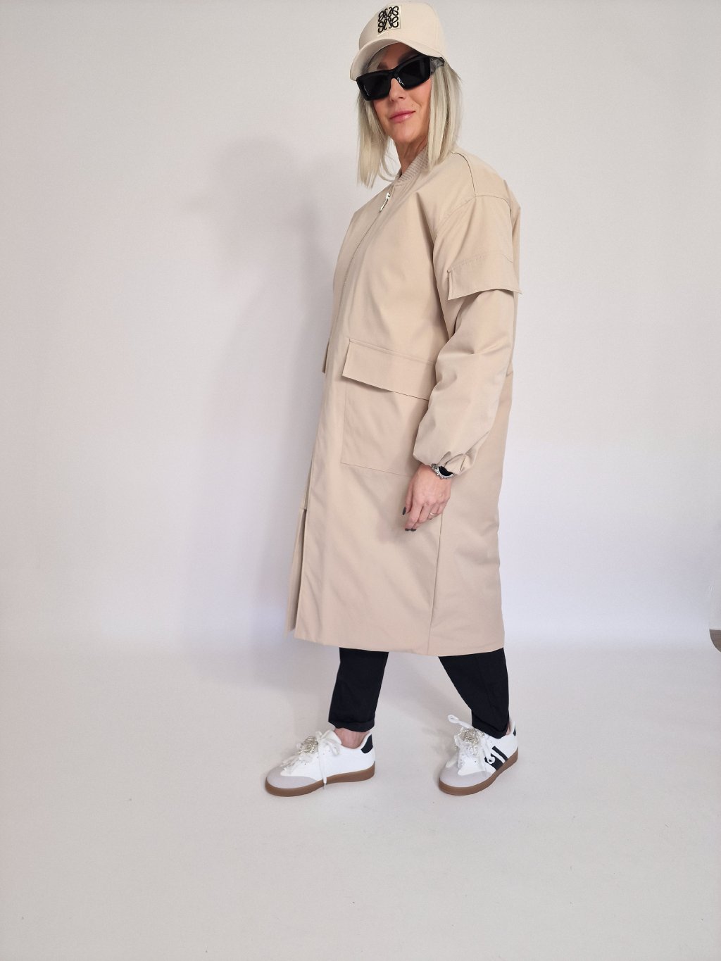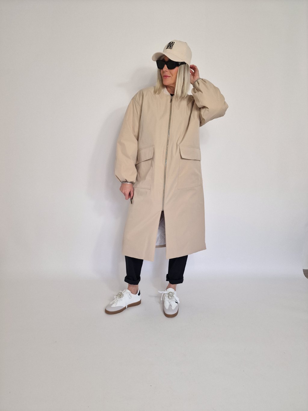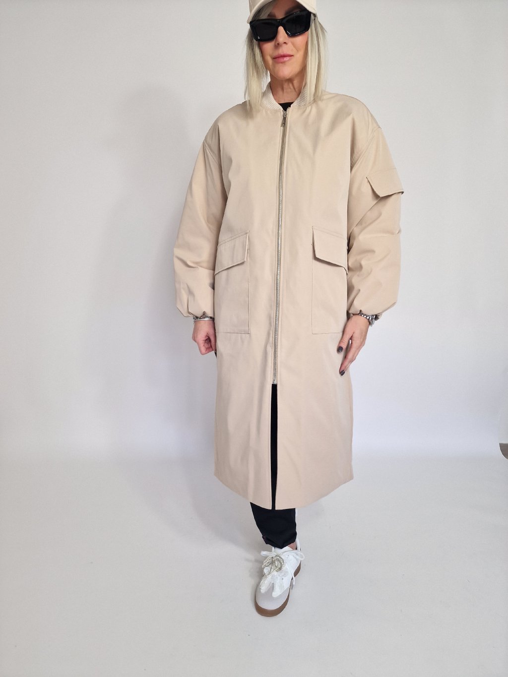 Skvelý bomber kabát s prešívanou podšívkou, zapínaním na zips, rukávmi ukončenými gumou, nášivkou vo výstrihu a veľkými vreckami s nášivkami.