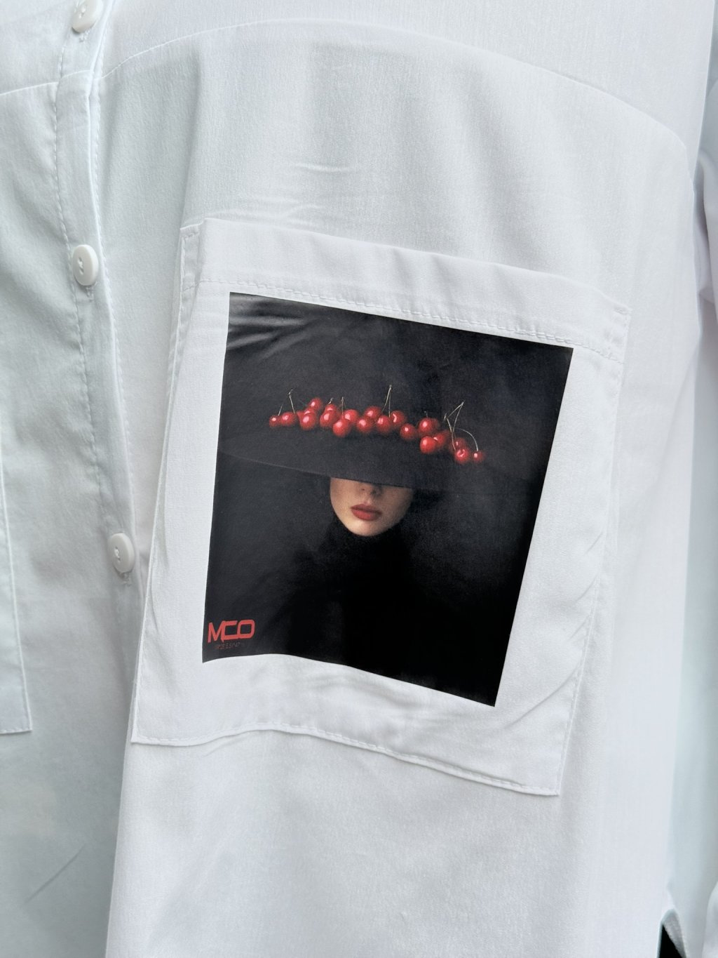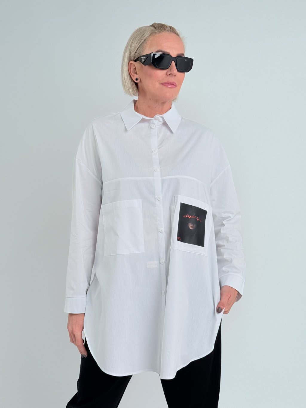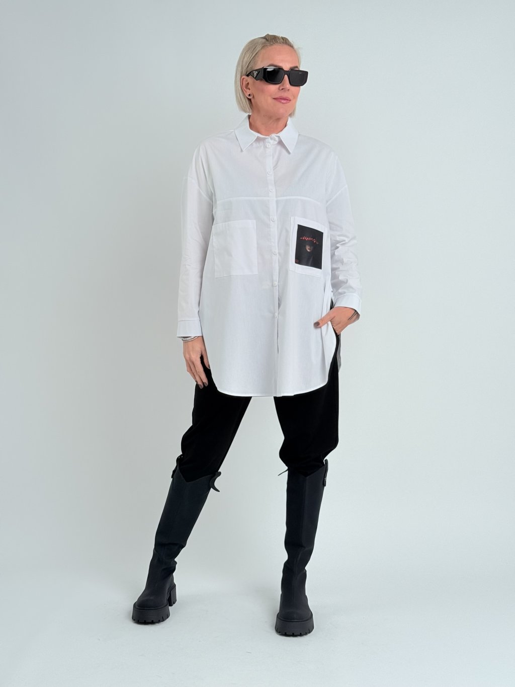 Skvelé tričko s potlačou na vrecku a bočnými rozparky.