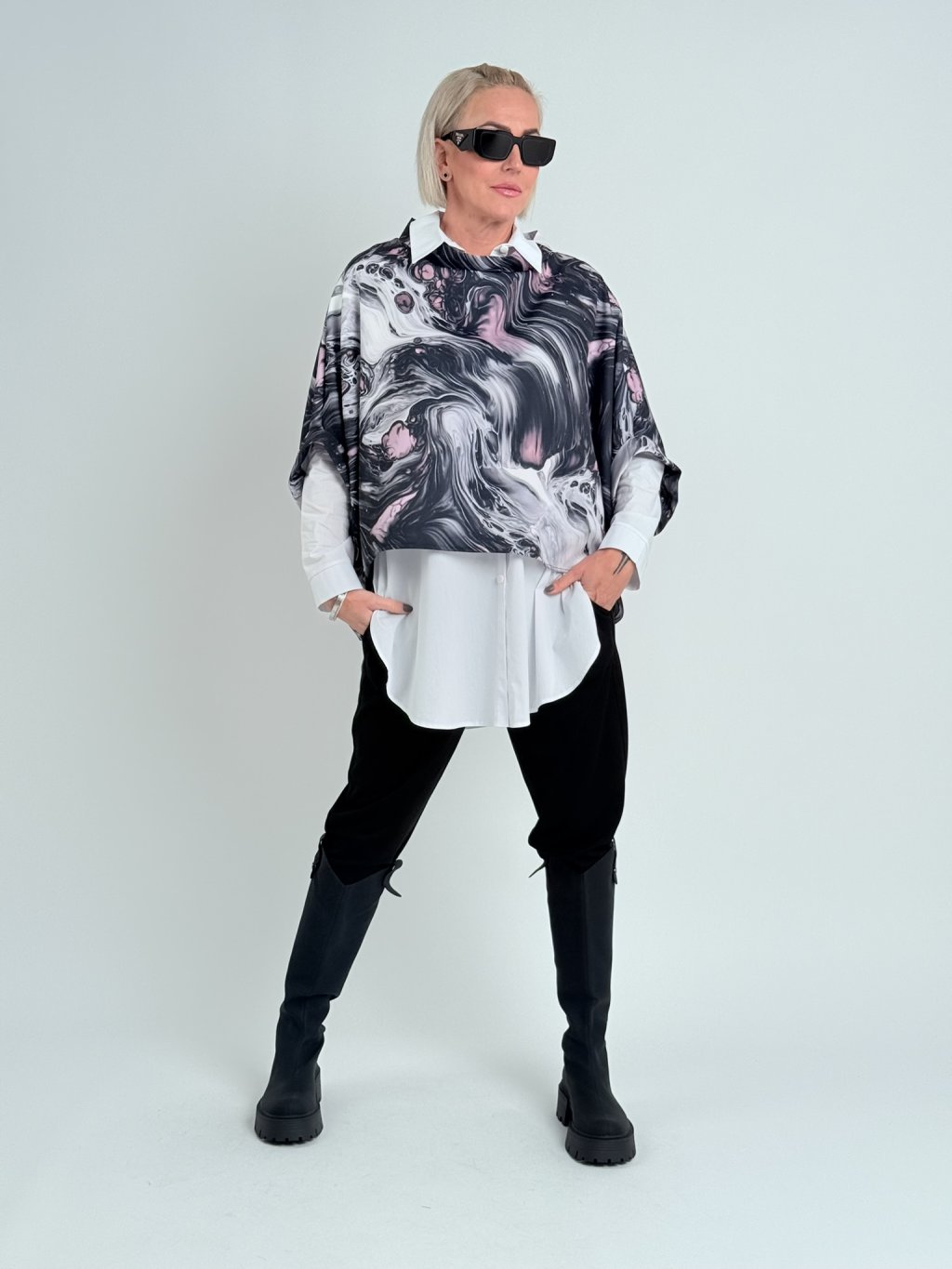 One Size, vhodná pre veľkosti S-XL ( šírka hrudníka 62 cm, dĺžka 83 cm, dĺžka rukáva 72 cm)