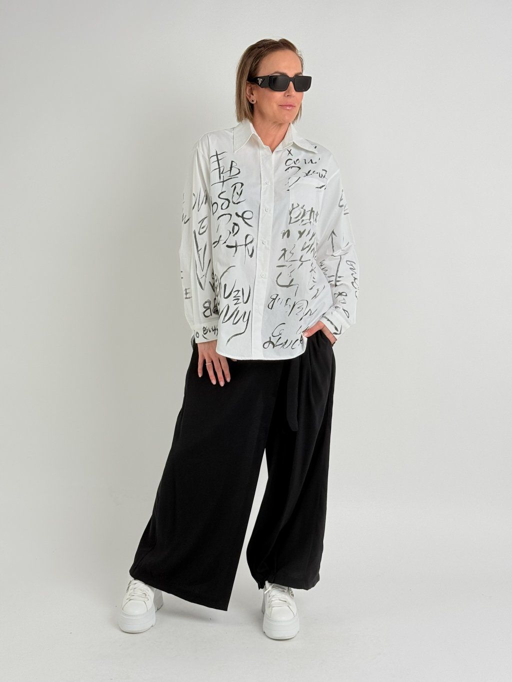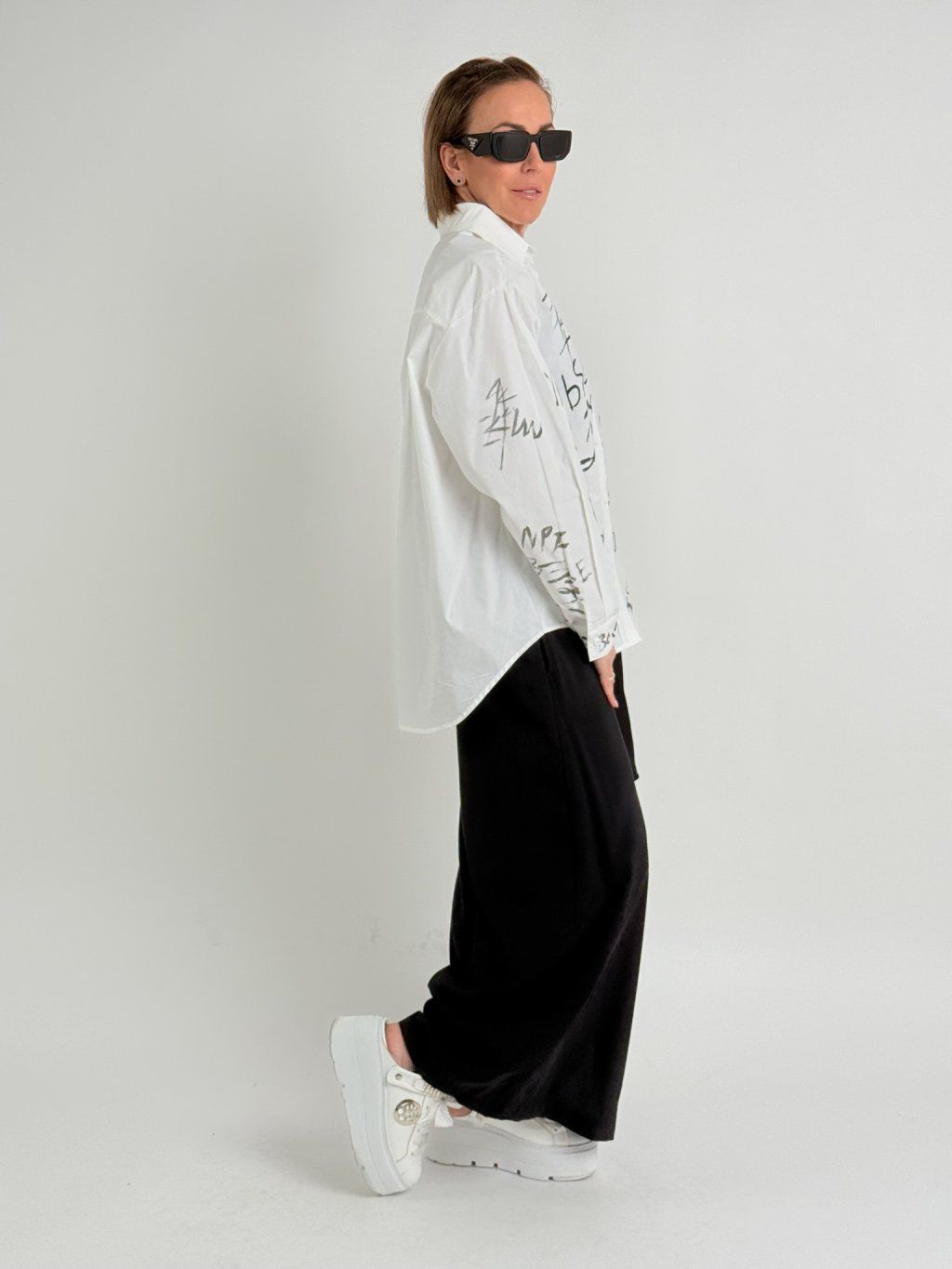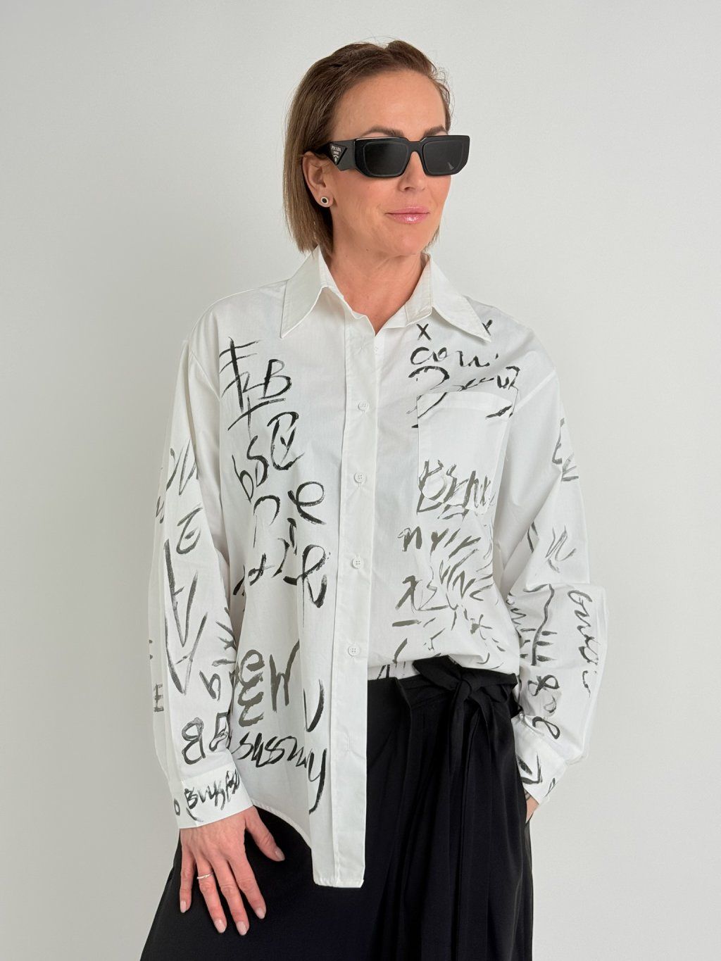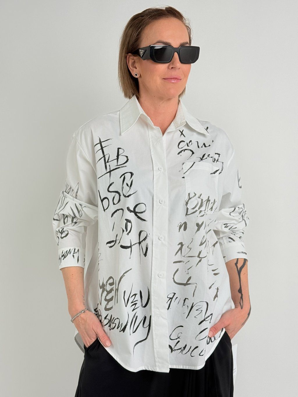 Krásna košeľa nadrozmernej veľkosti s čiernou a sivou potlačou na prednej strane, predĺženým chrbtom, golierom a zapínaním na gombíky.