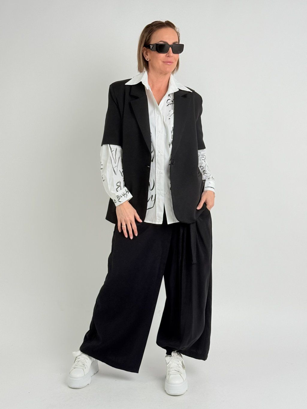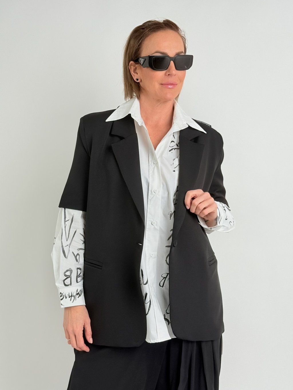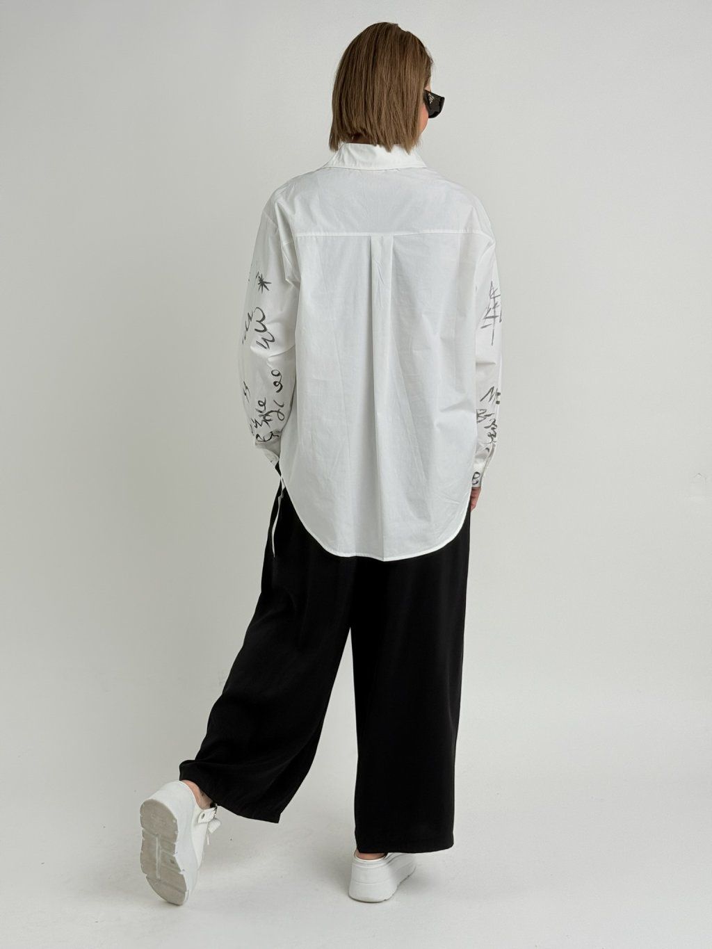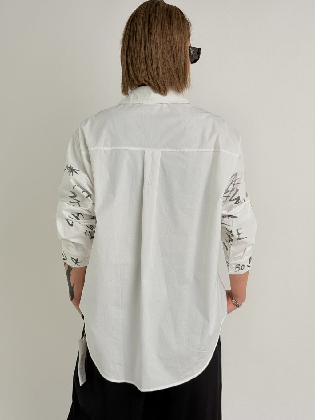 Krásna košeľa nadrozmernej veľkosti s čiernou a sivou potlačou na prednej strane, predĺženým chrbtom, golierom a zapínaním na gombíky.