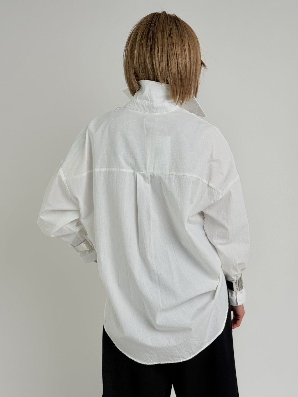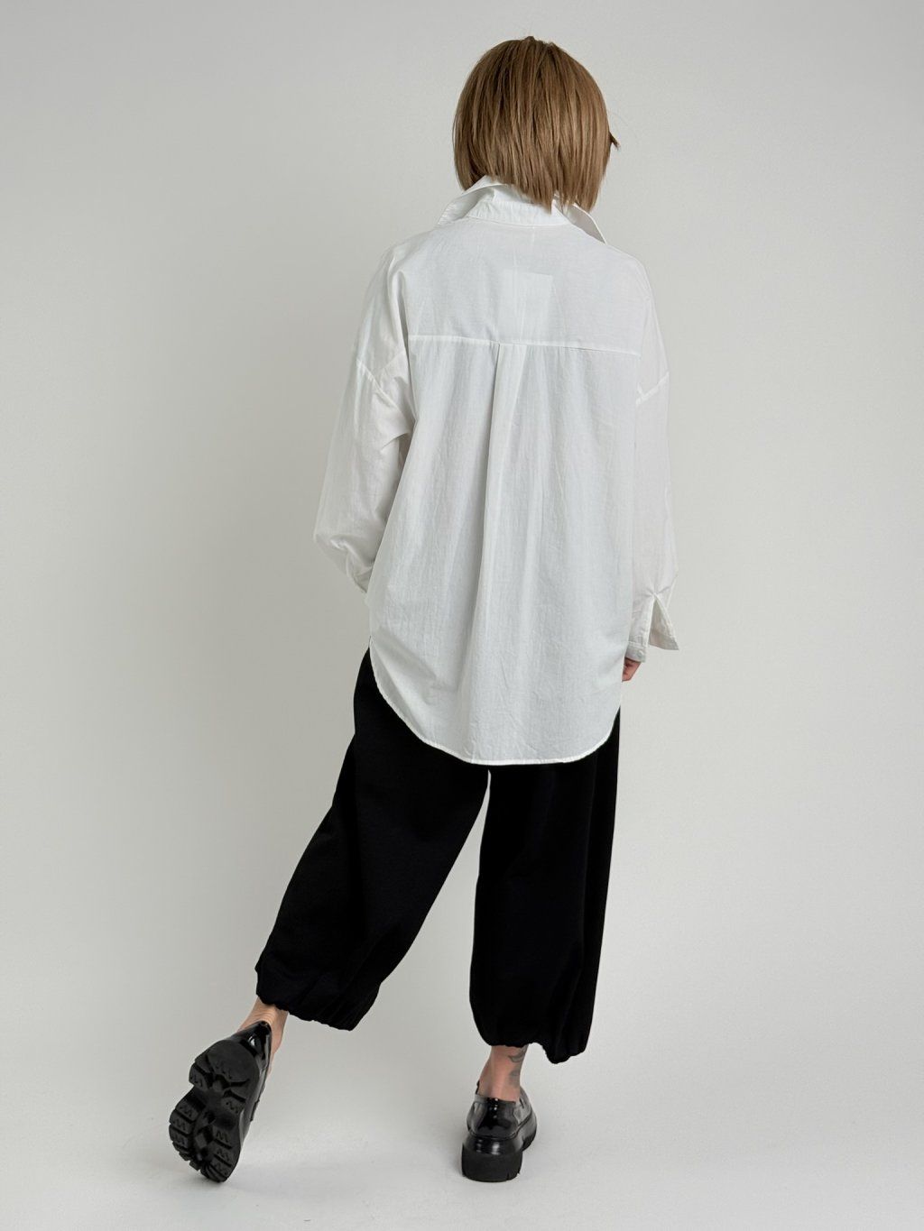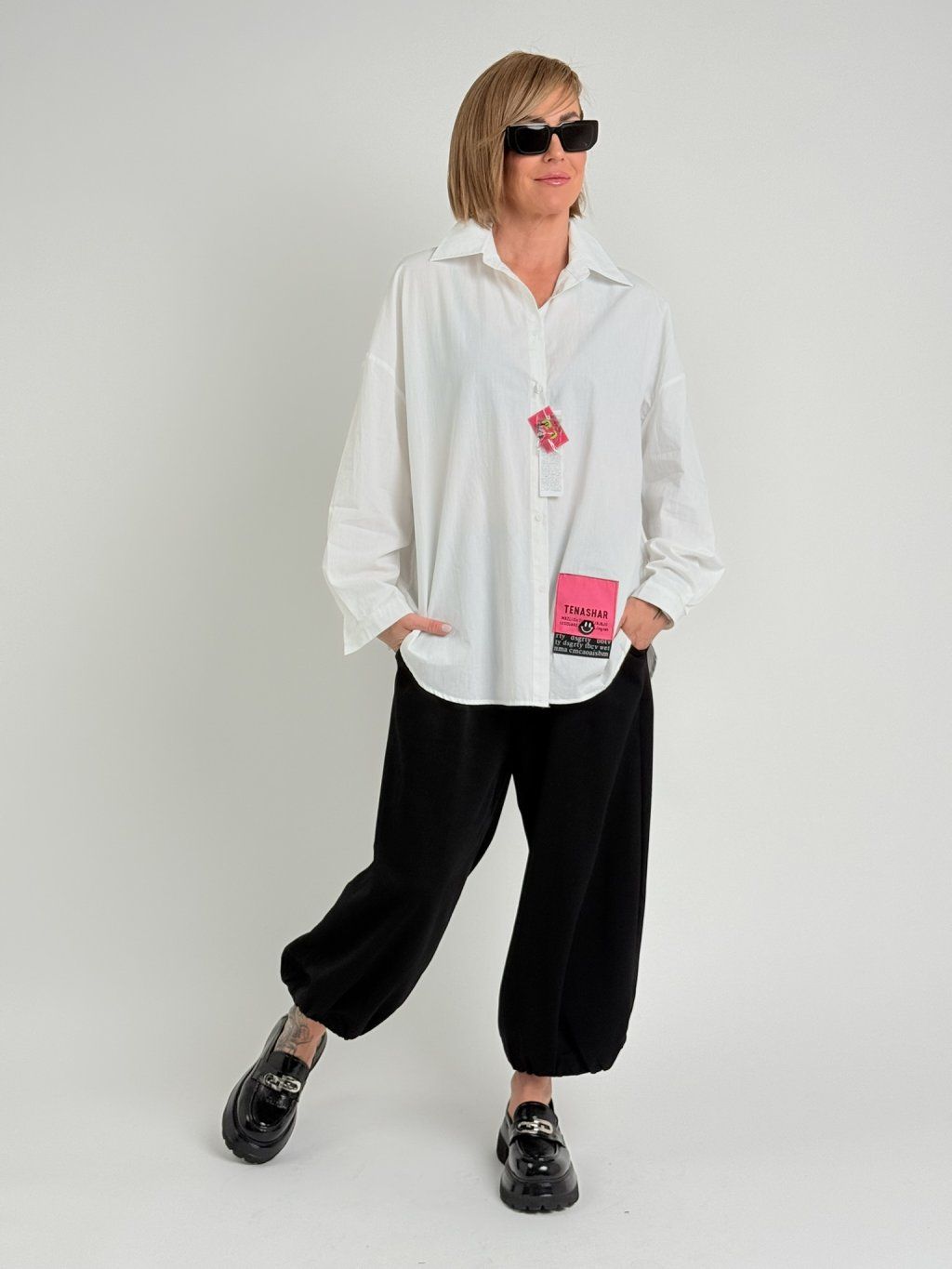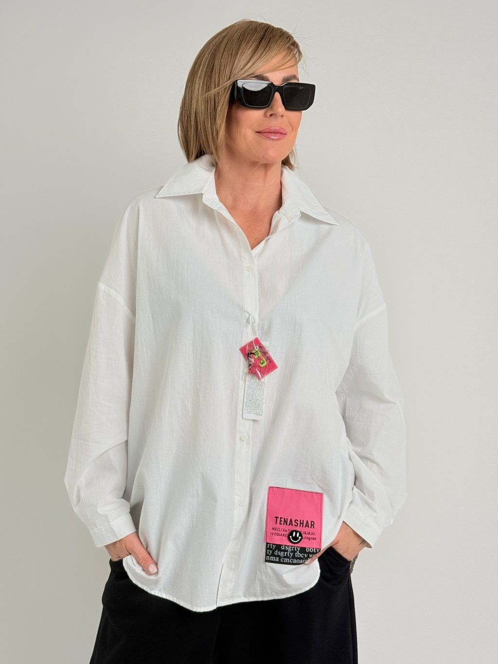 Krásna košeľa nadrozmernej veľkosti s predĺženým chrbtom, golierom a zapínaním na gombíky a ružovým vreckom na spodnom okraji.