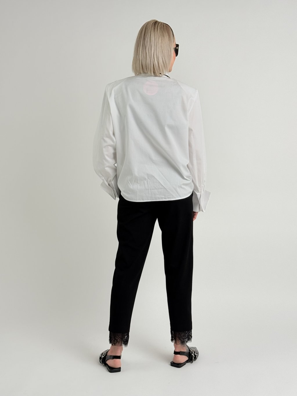Luxusná, klasická biela košeľa s malými ramennými vypchávkami, širokými zrolovanými manžetami a čiernou kravatou.