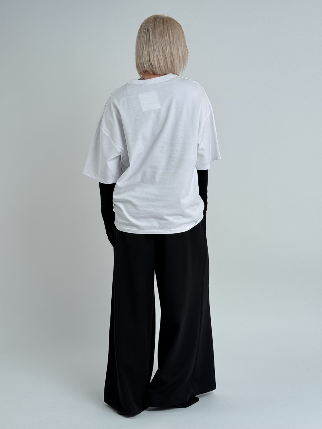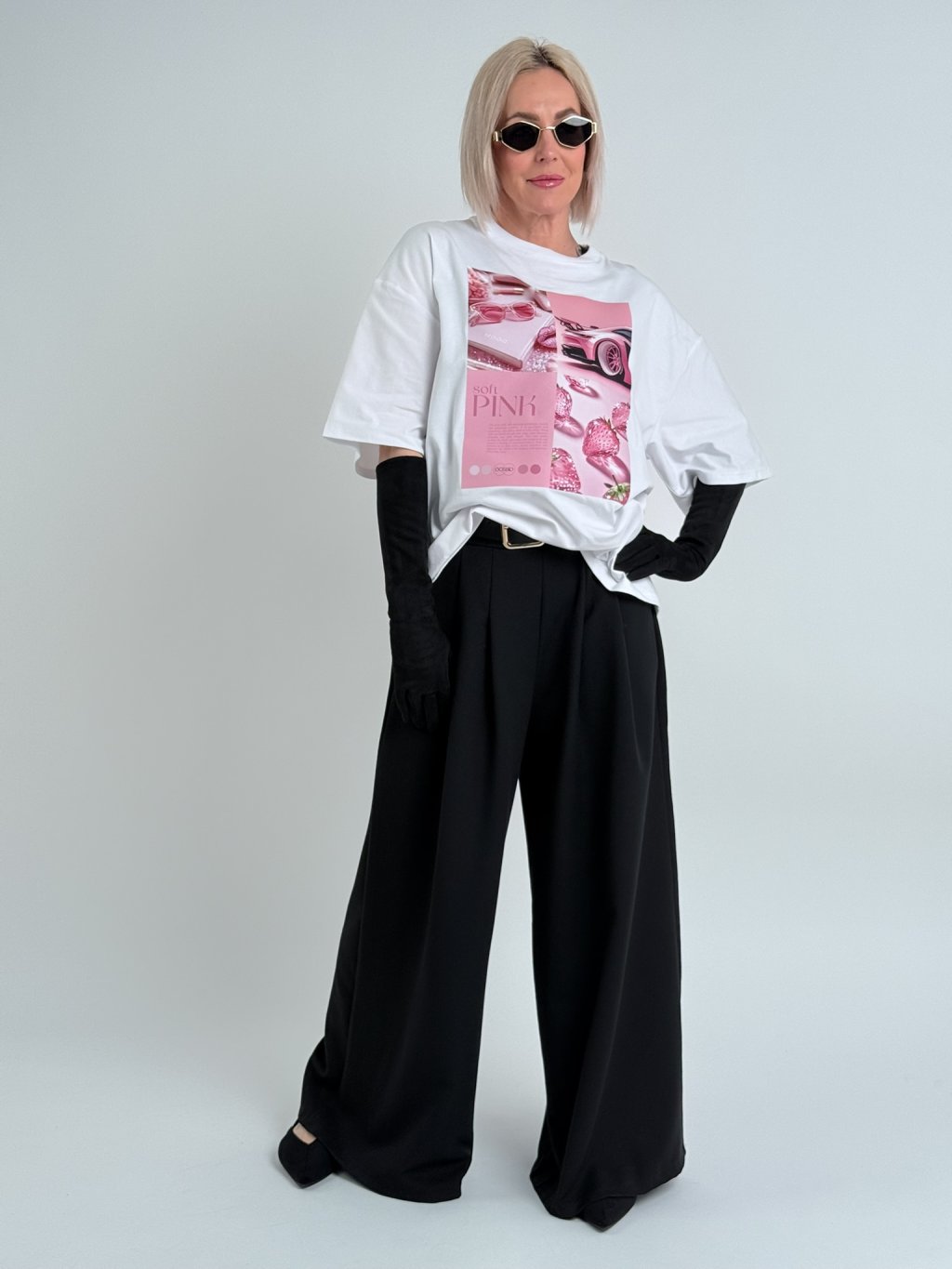 Voľnejšie tričko s okrúhlym výstrihom, rukávmi v dĺžke po lakte a potlačou na prednej strane.