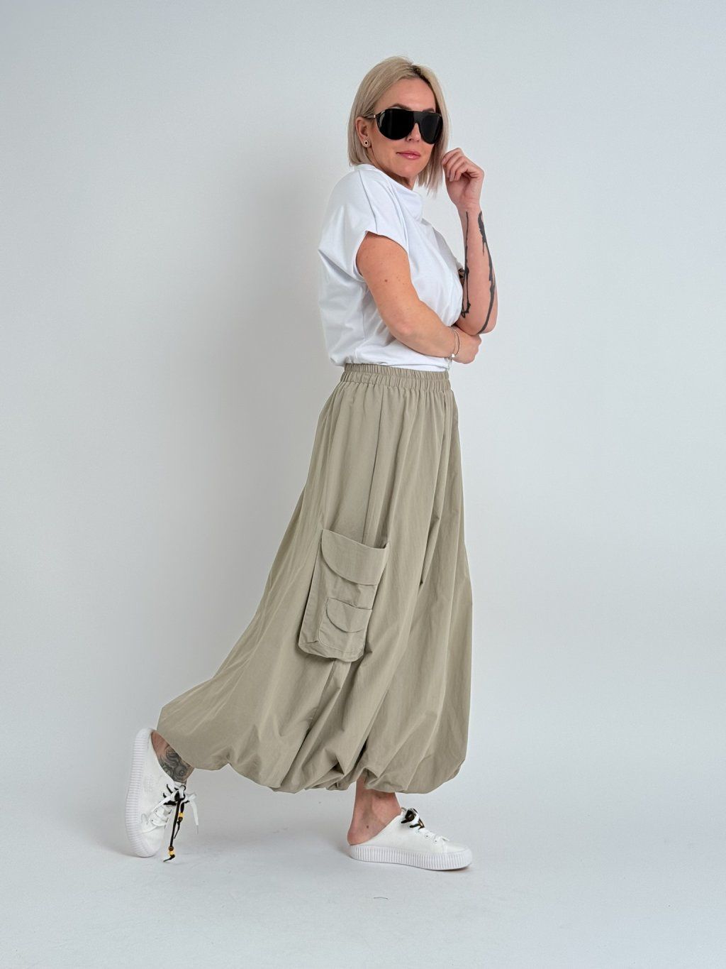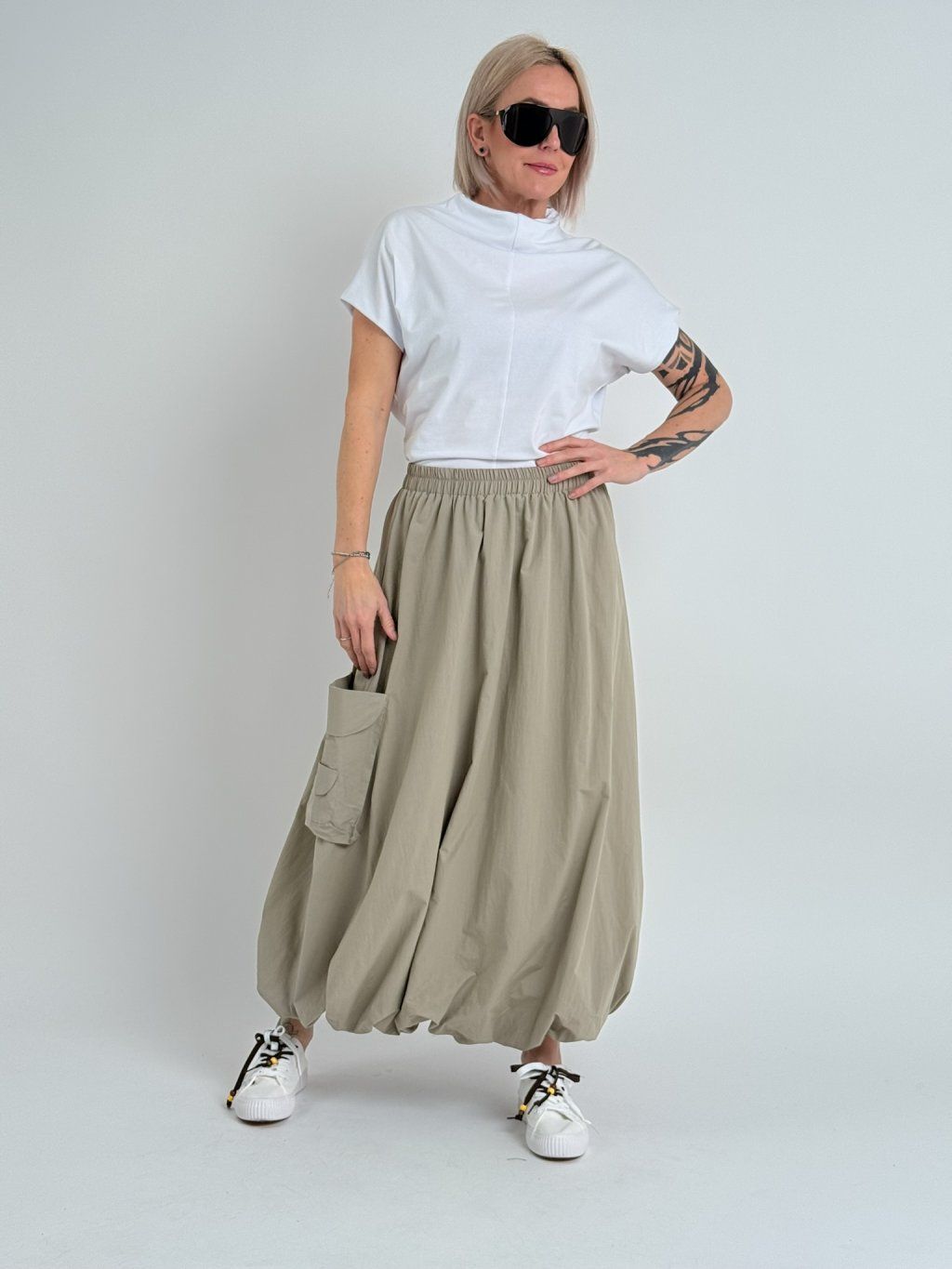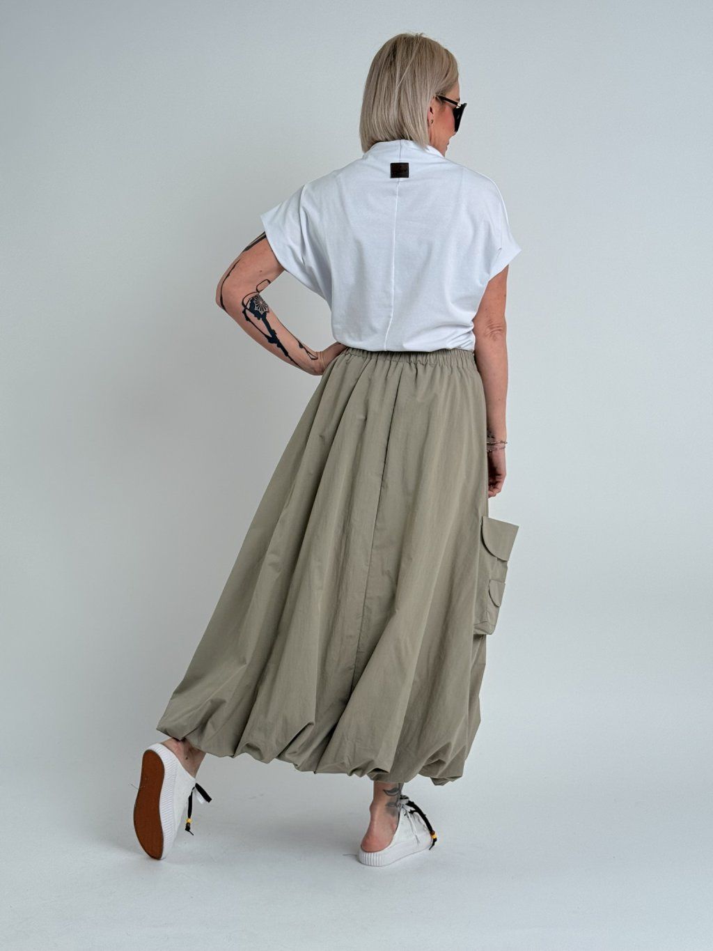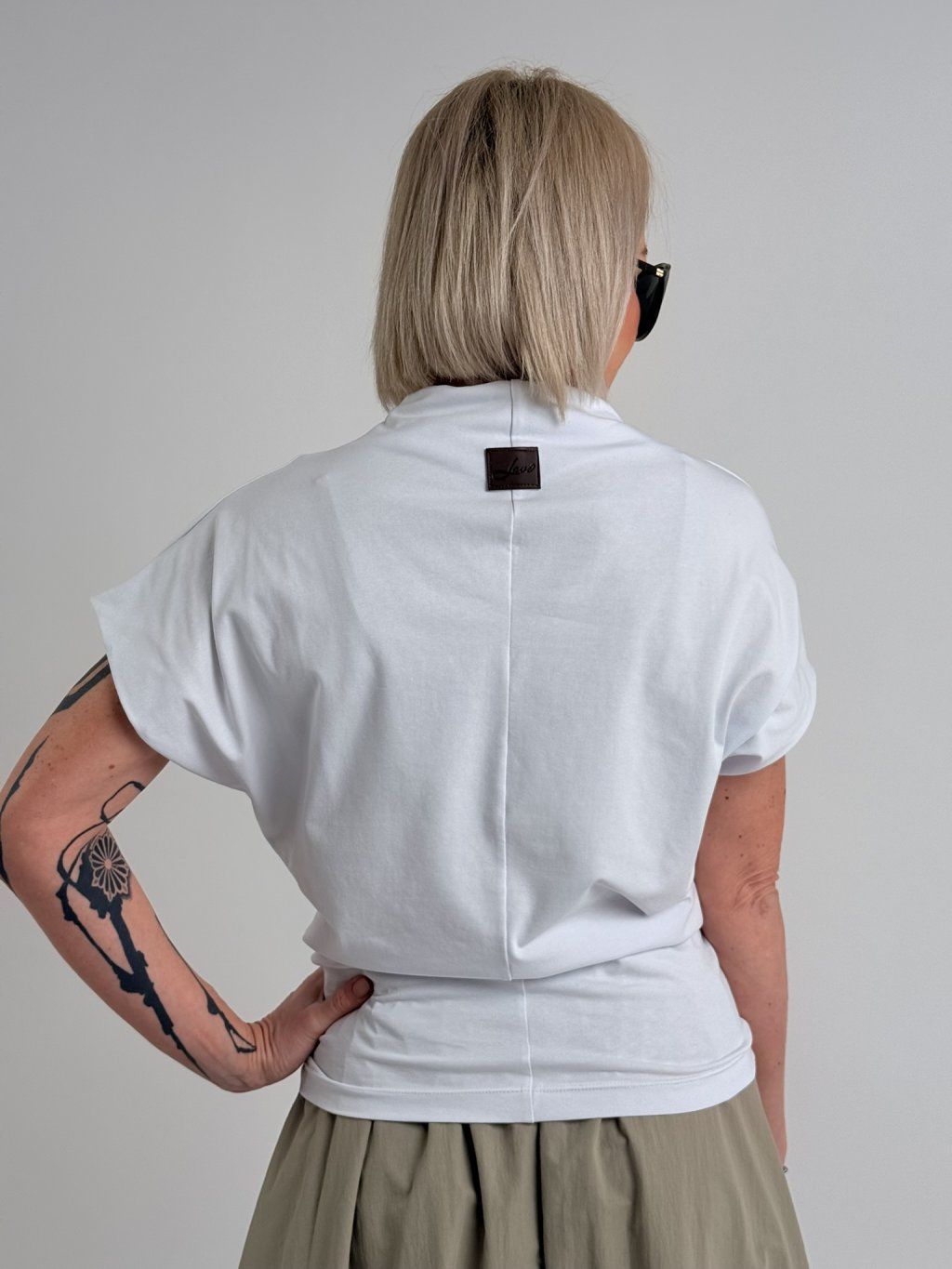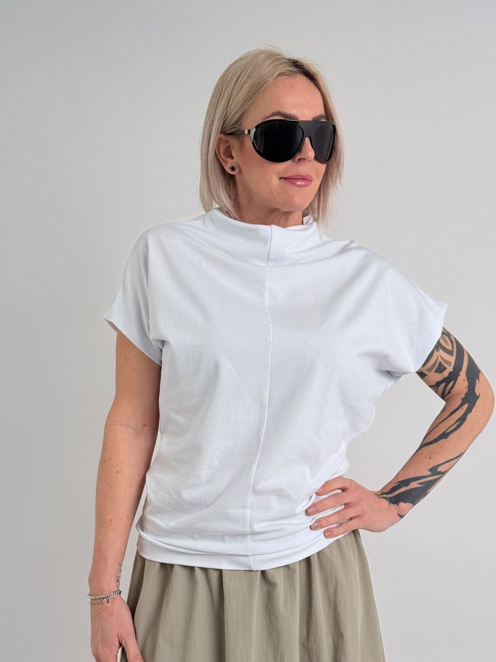 Jednoduché, pohodlné, mierne elastické tričko so spadnutými rukávmi a stojatým golierom.