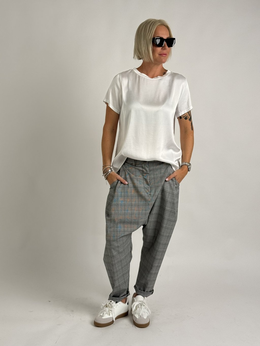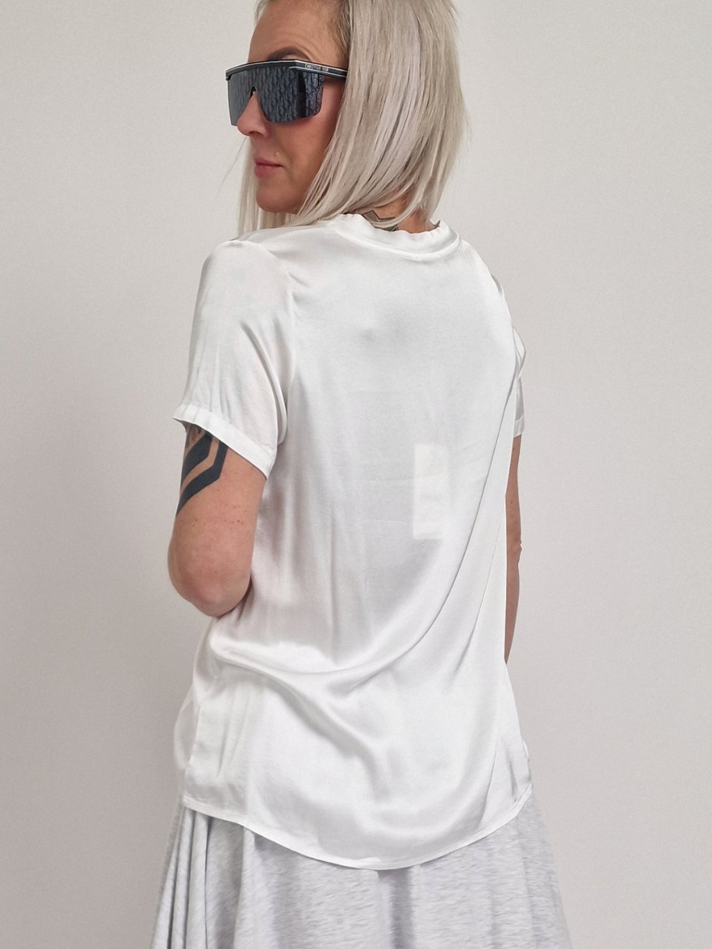 Jednoduchá, saténová, elastická blúzka s krátkymi rukávmi a okrúhlym výstrihom. Skvele sa hodí ku nohaviciam, sukniam a džínsom.
