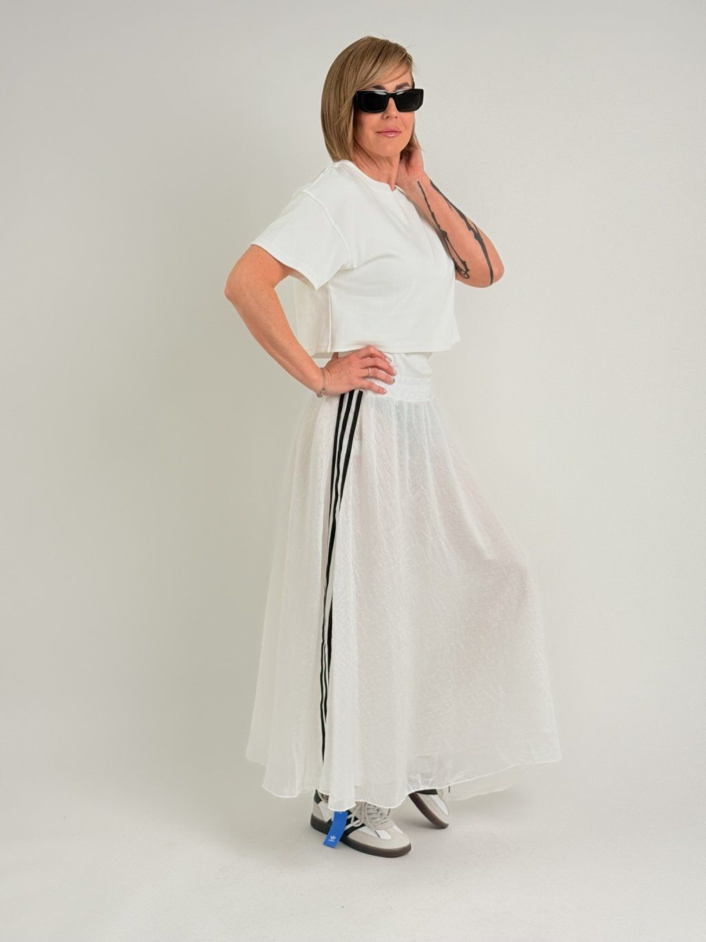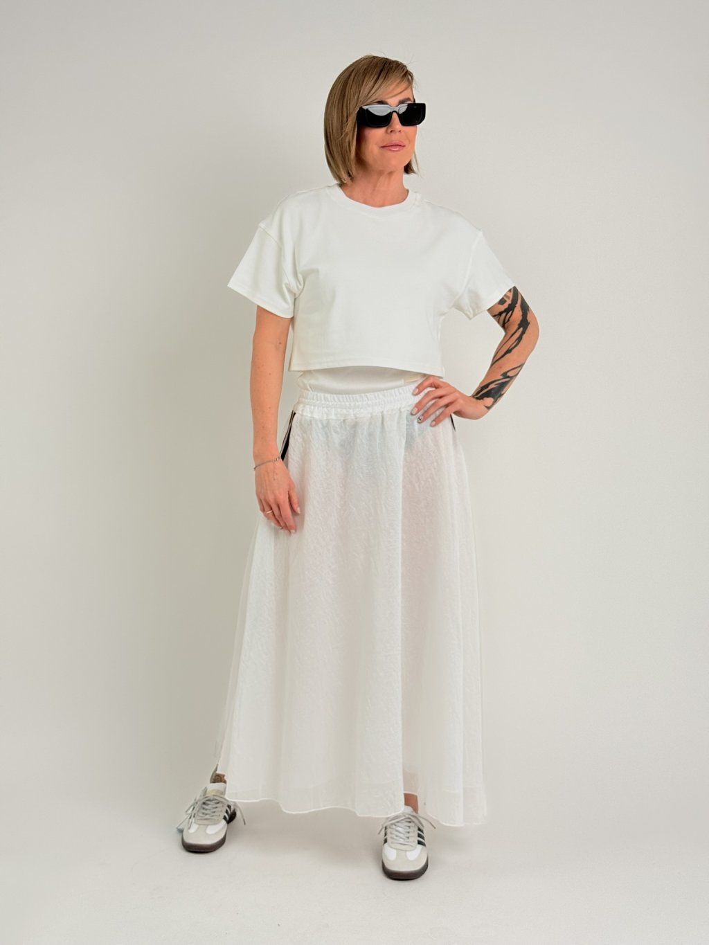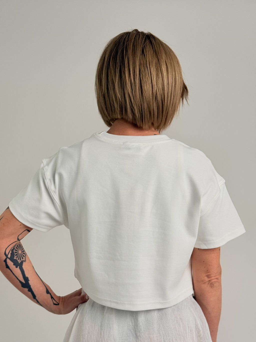 Základné tričko kratšej dĺžky s krátkymi rukávmi a okrúhlym výstrihom.