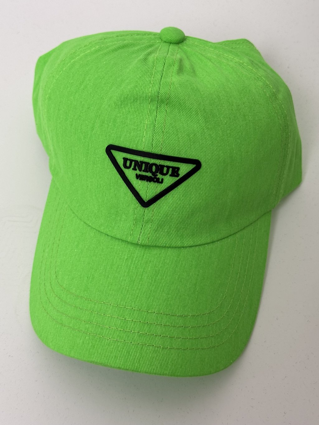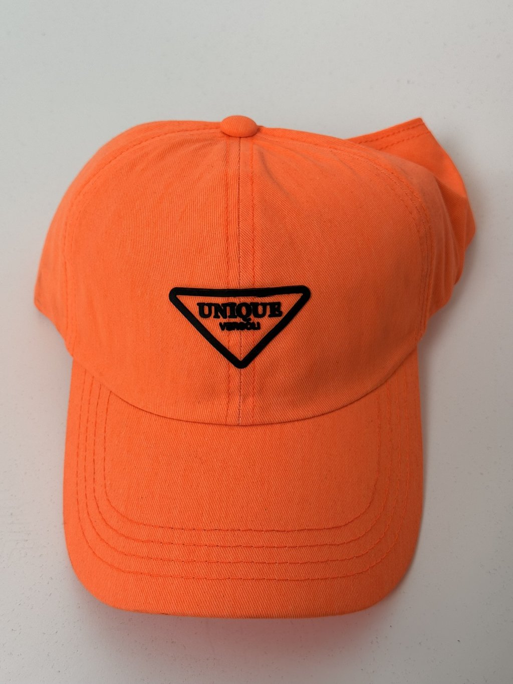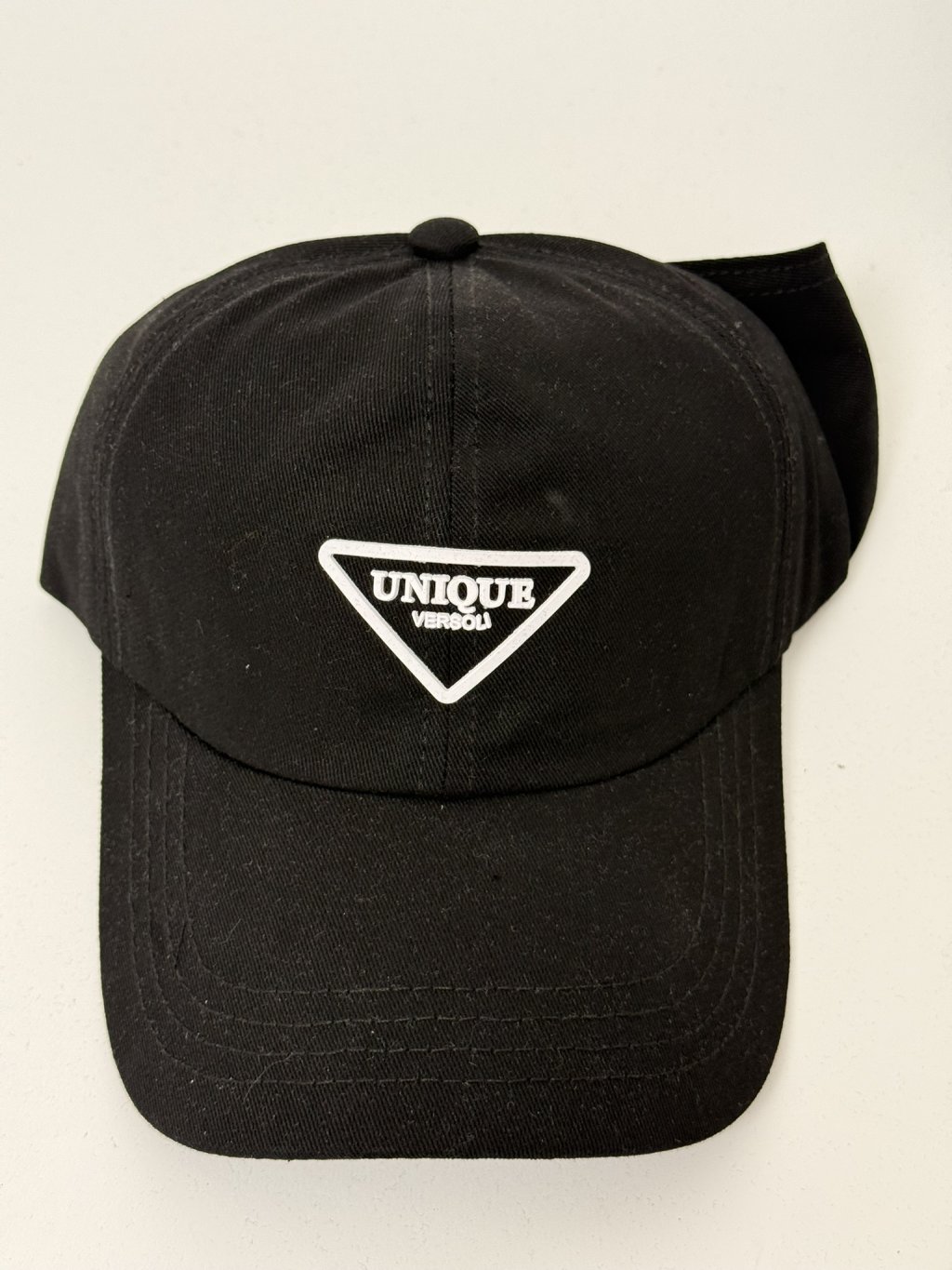 Krásna čiapka s reguláciou obvodu a čiernou výšivkou na prednej strane.