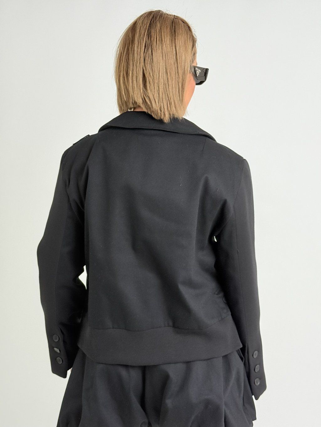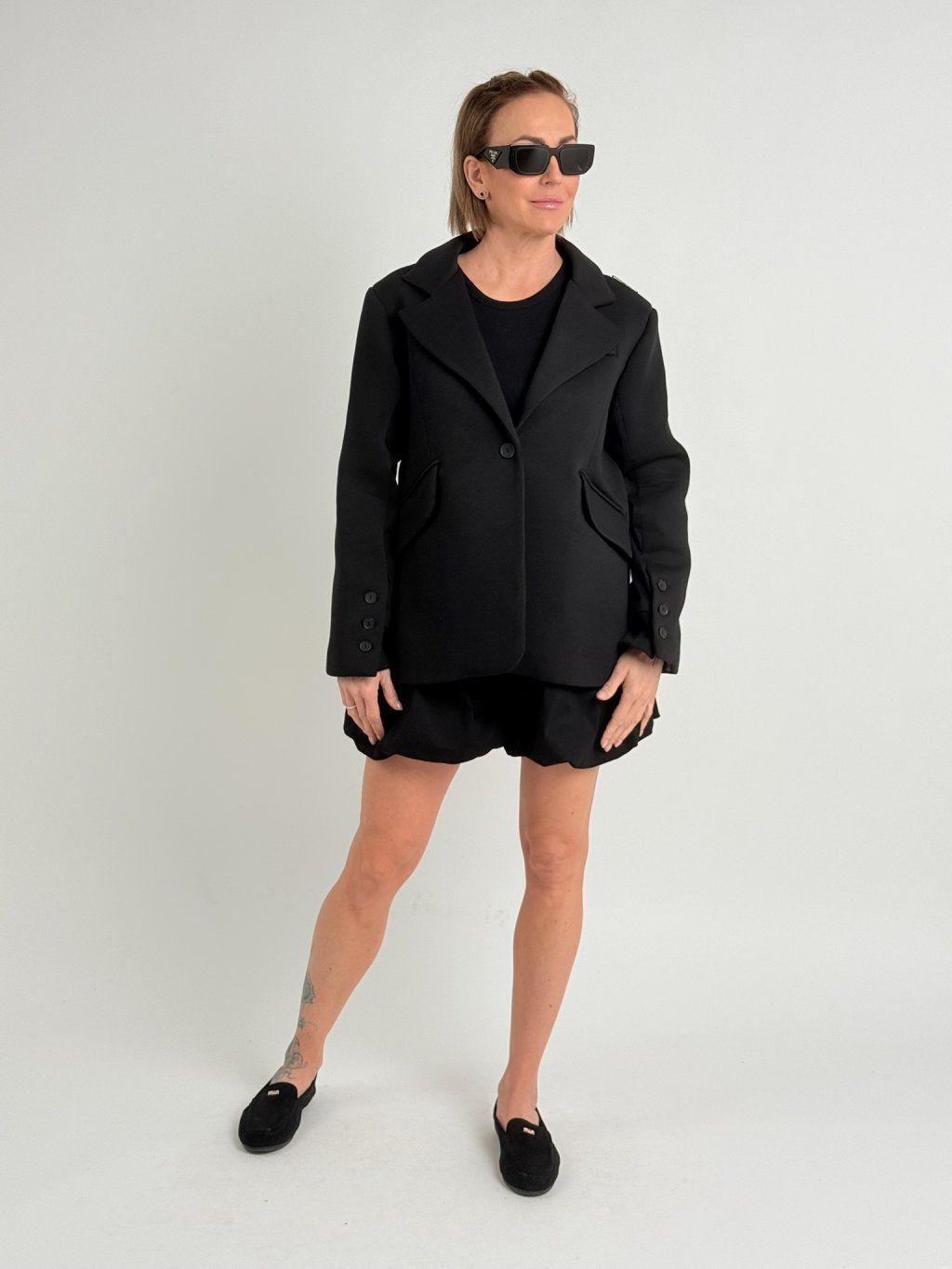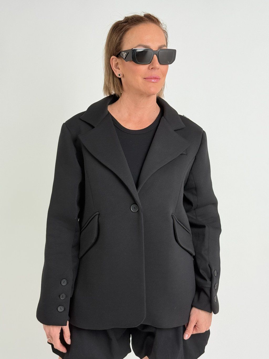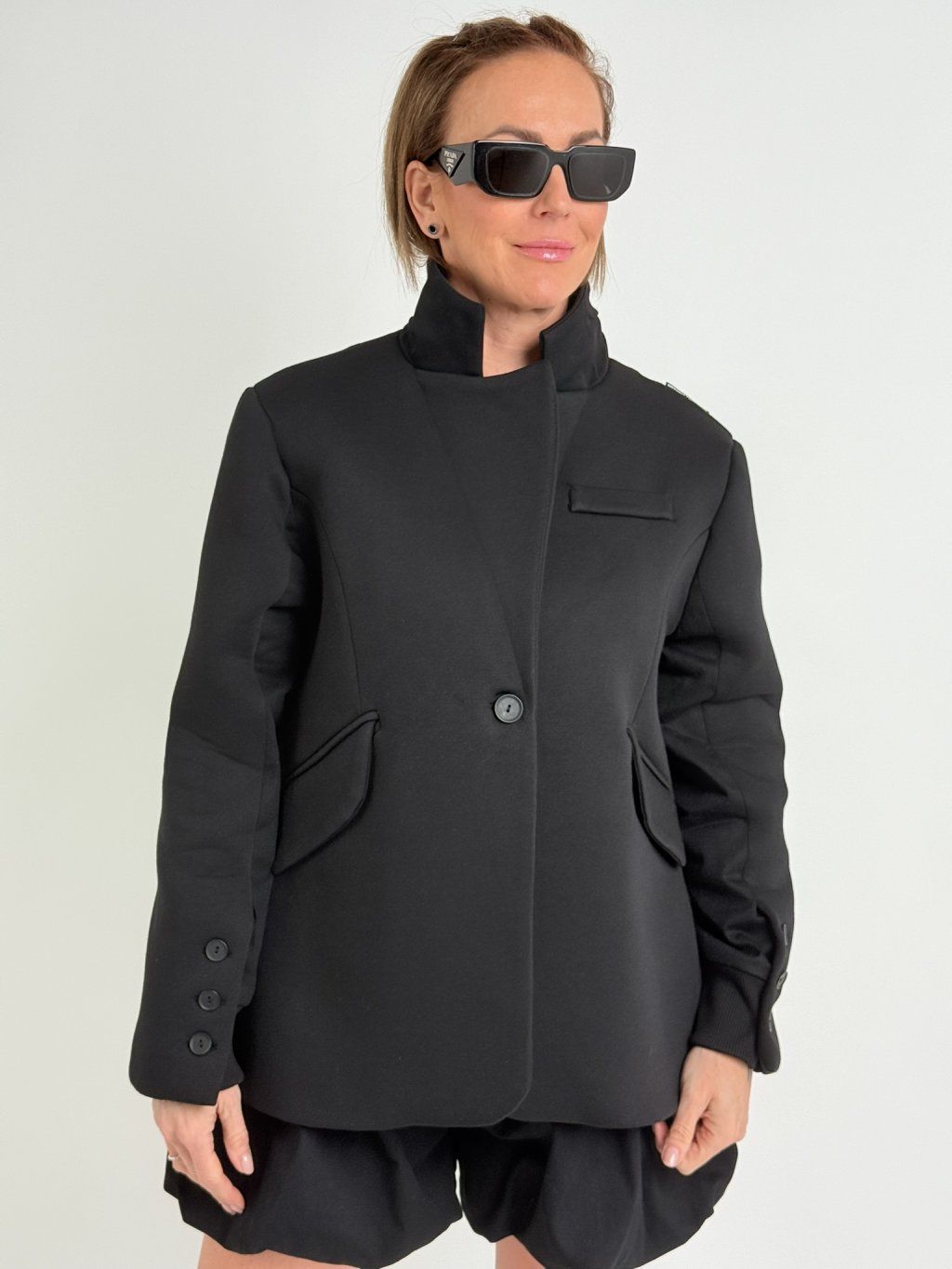 Luxusná nadrozmerná bunda s podšívkou, v kombinácii úpletu a džínsoviny, s dlhými rukávmi ukončenými tromi gombíkmi a rozparky na bokoch bundy, ktoré sa dajú zmenšiť zapnutím jedného gombíka.