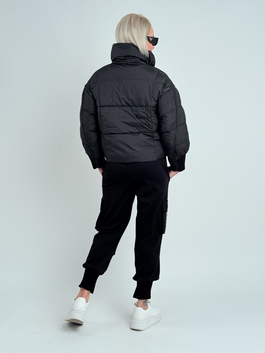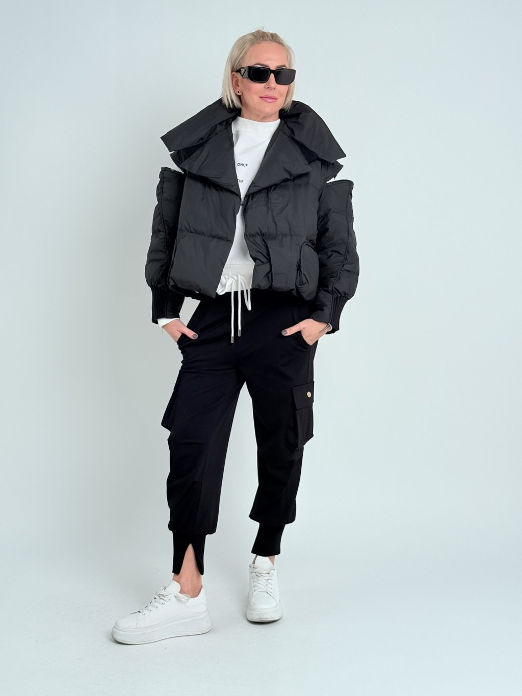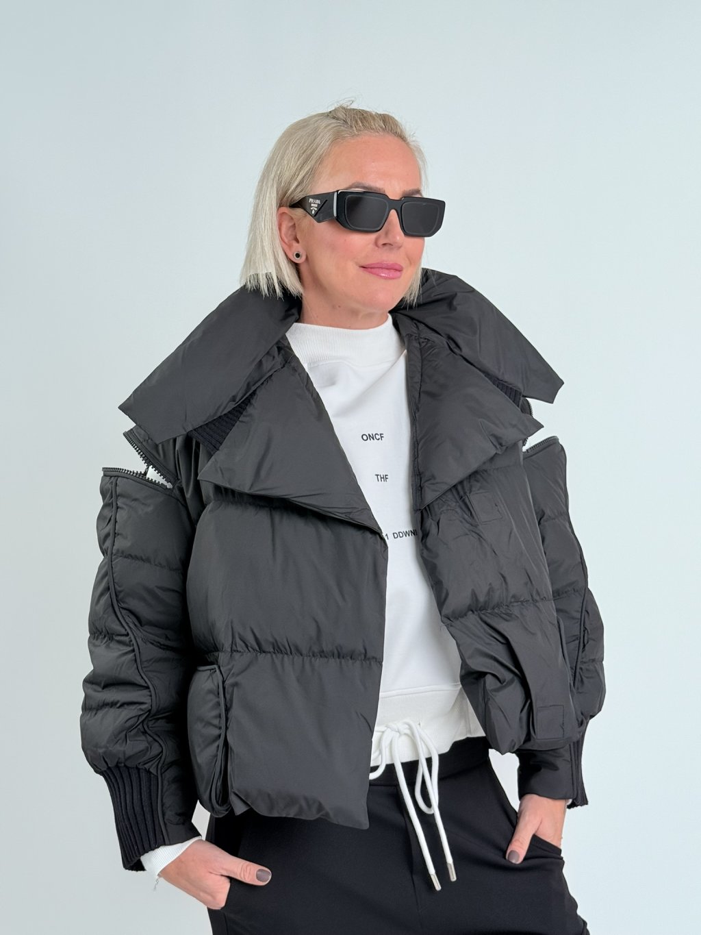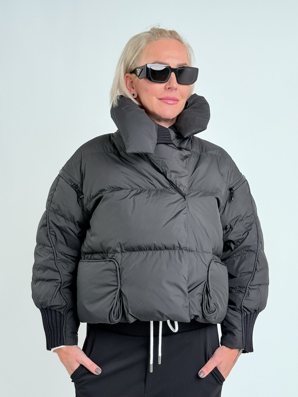 Chladivá, páperová, ľahká, prešívaná bunda s všitými väčšími vreckami a poklopcom, ktorý sa dá vďaka magnetickému zapínaniu premeniť na bundu s vysokým stojáčikom.