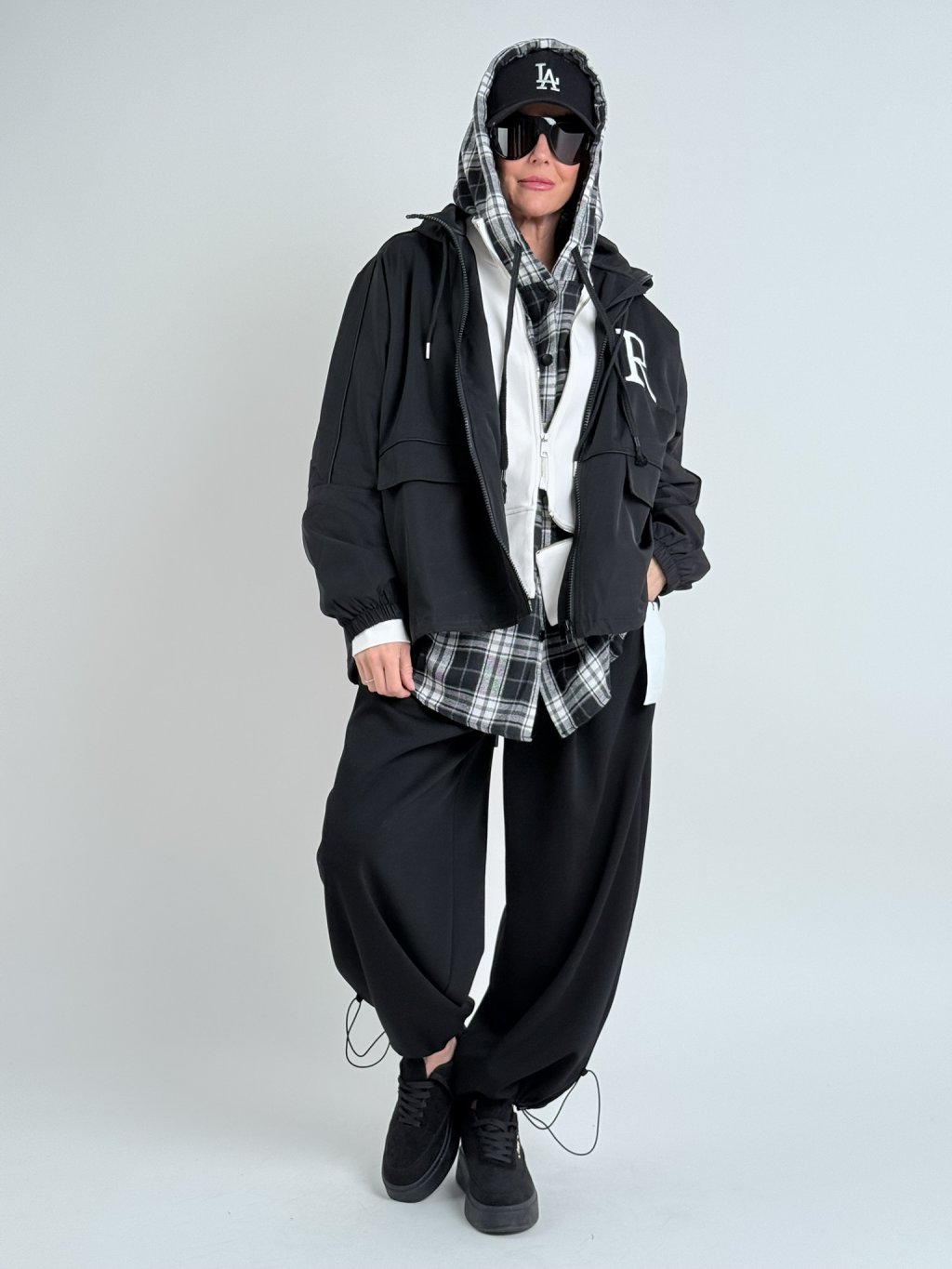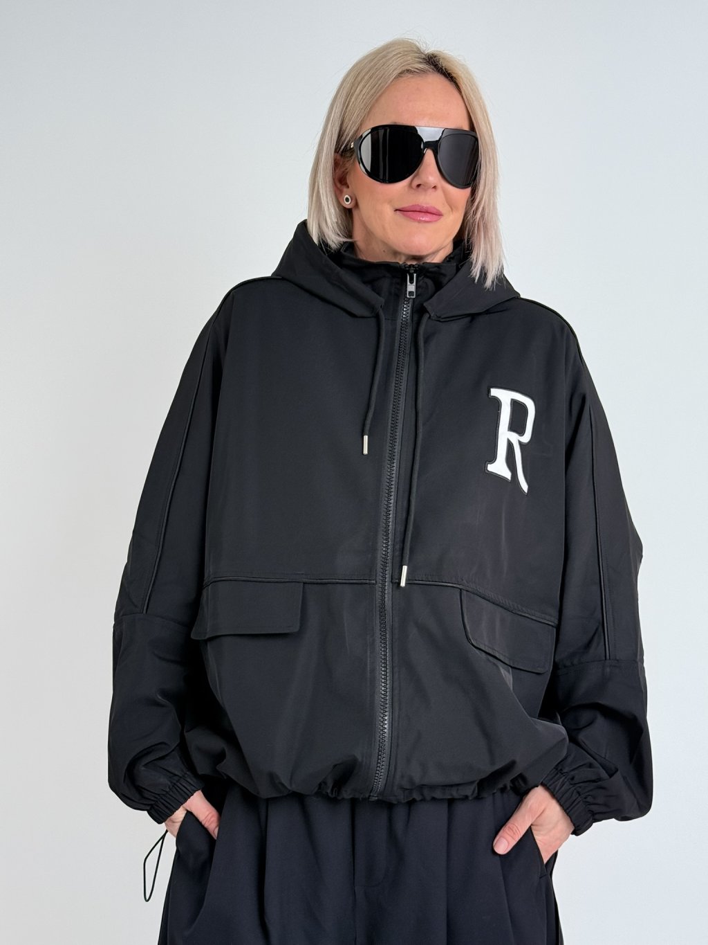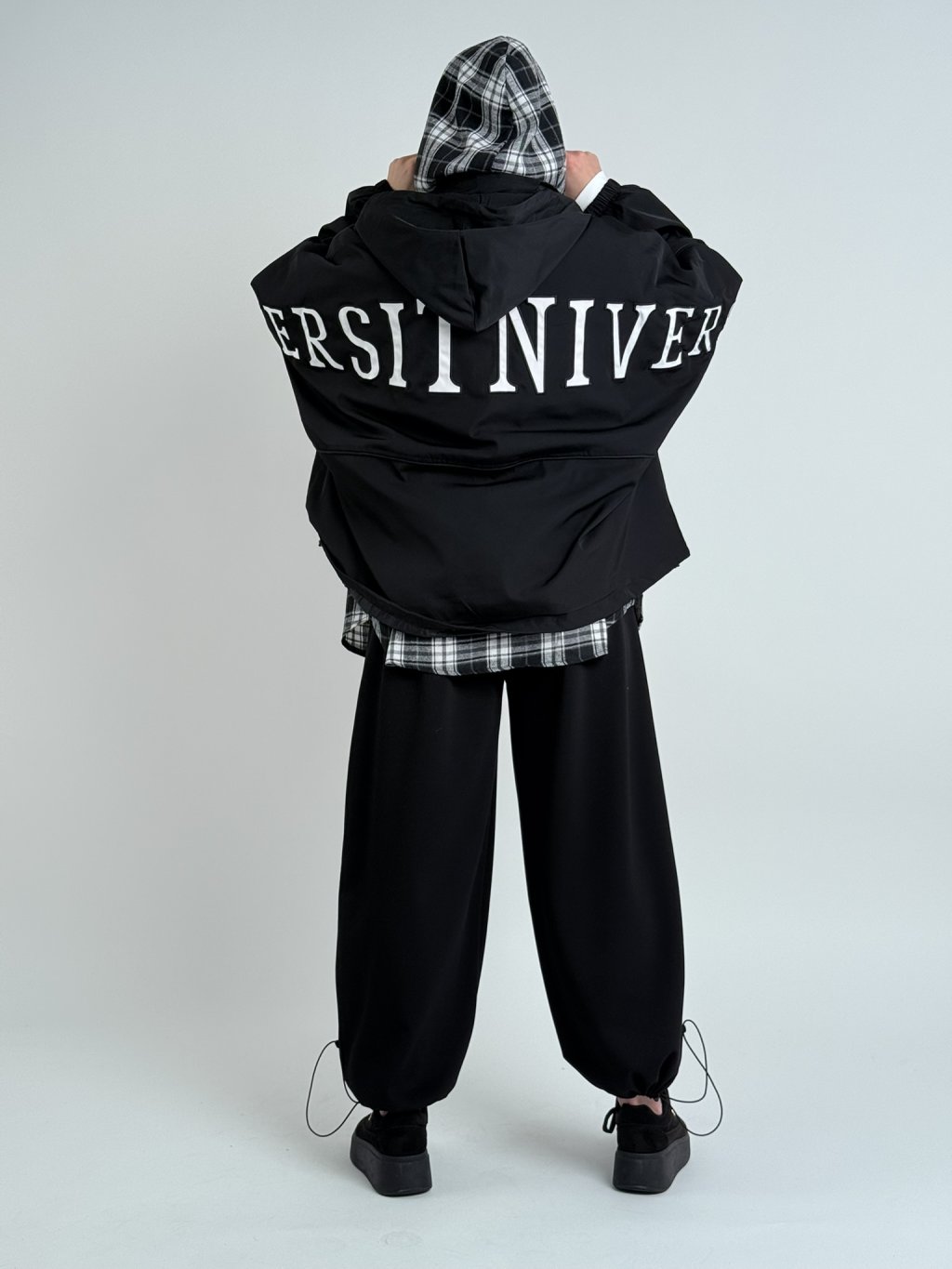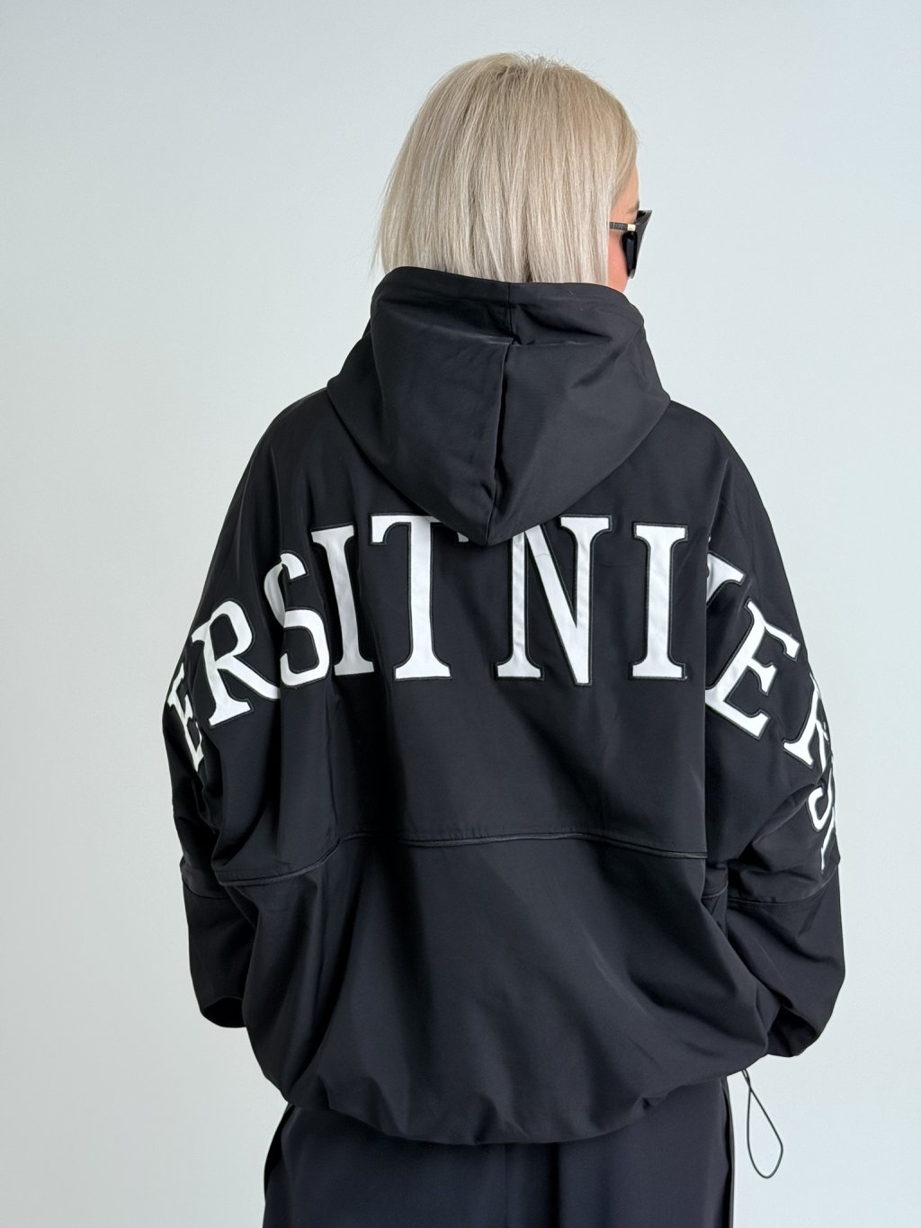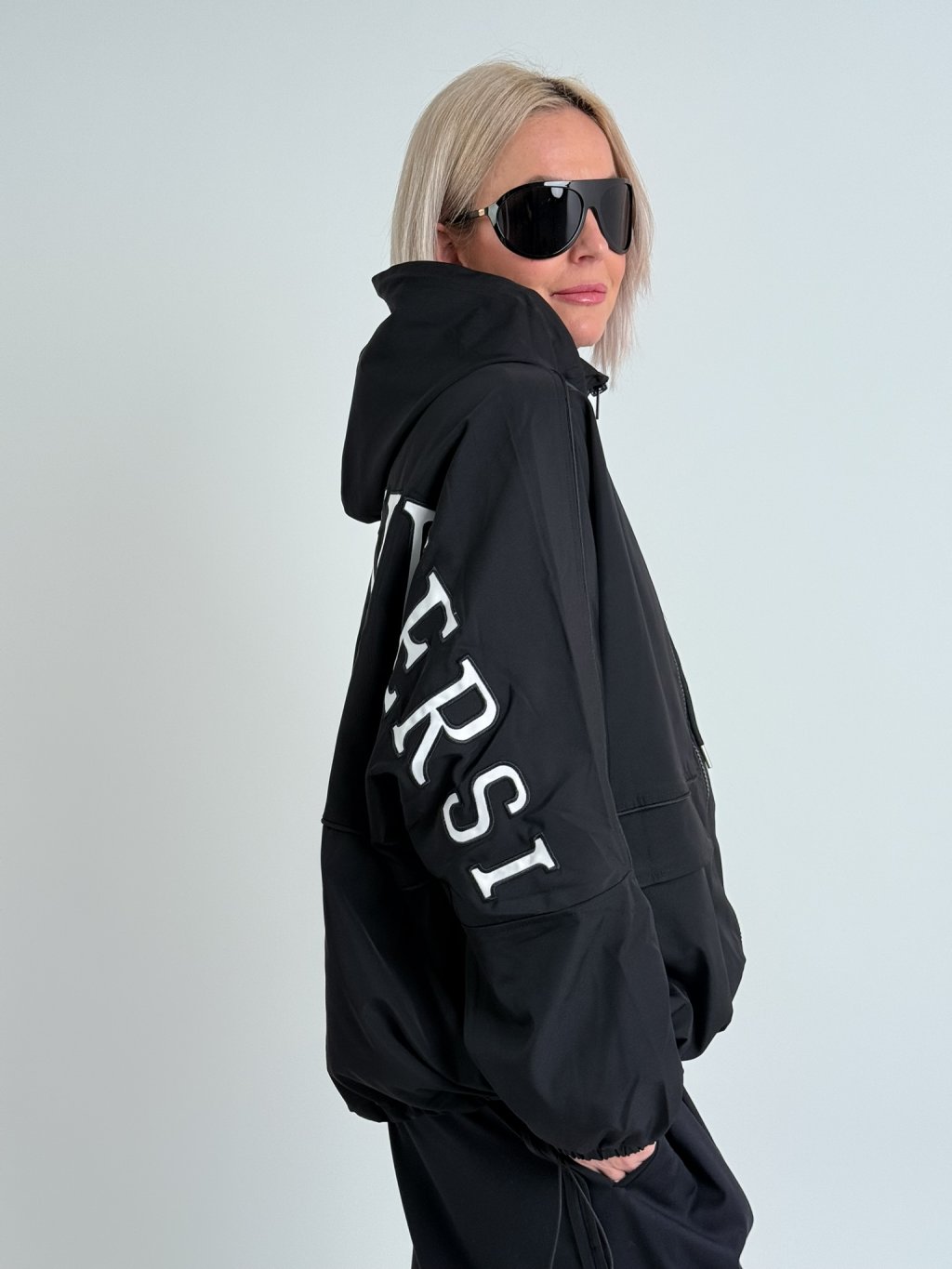 Bunda nadrozmernej veľkosti s podšívkou, veľká kapucňa so sťahovacou šnúrkou, predné vrecká s krytými chlopňami, spodný okraj možno stiahnuť šnúrkou so zátkami. Na zadnej strane, cez rukávy a chrbát, je nápis v inej farbe.