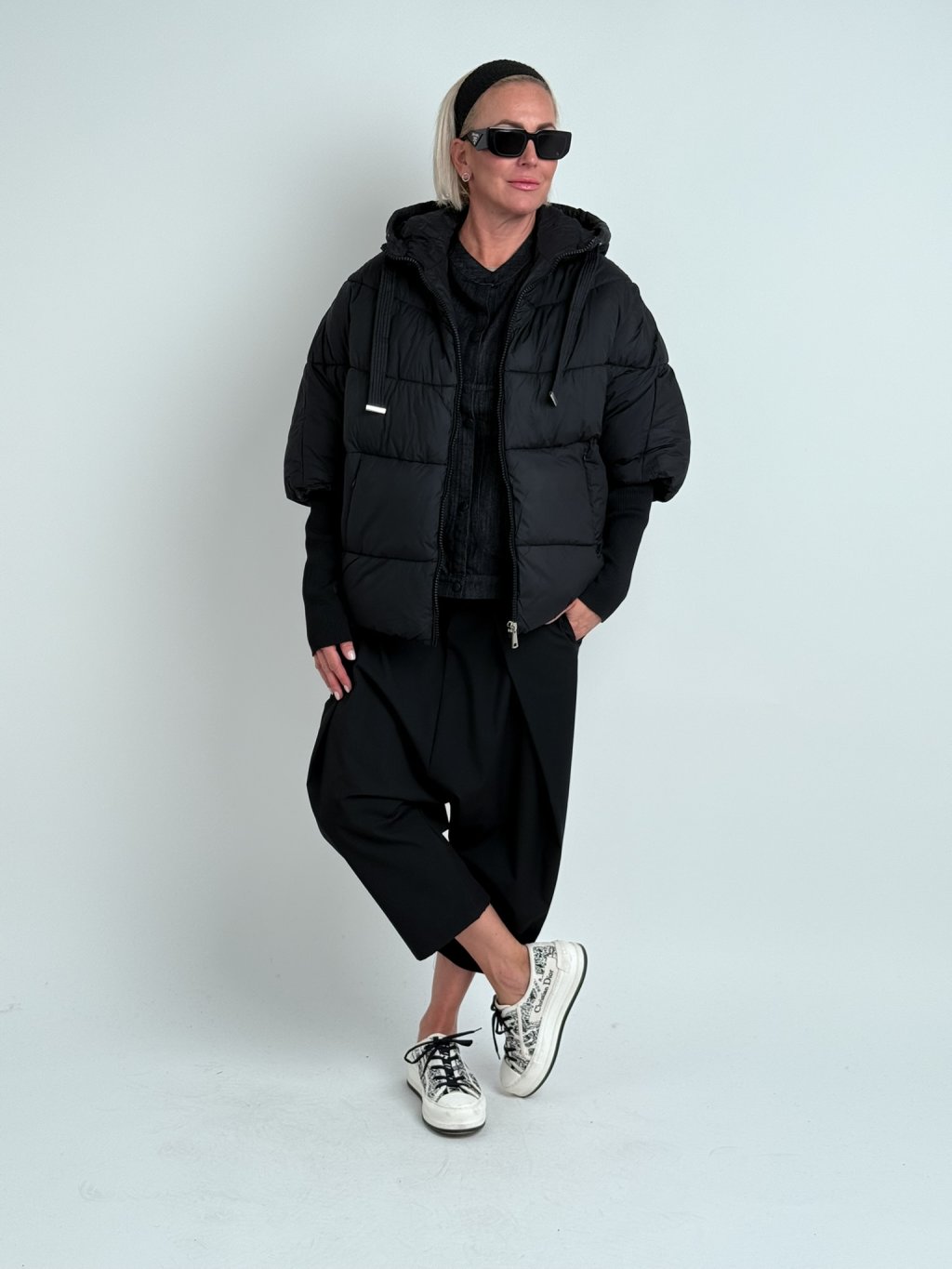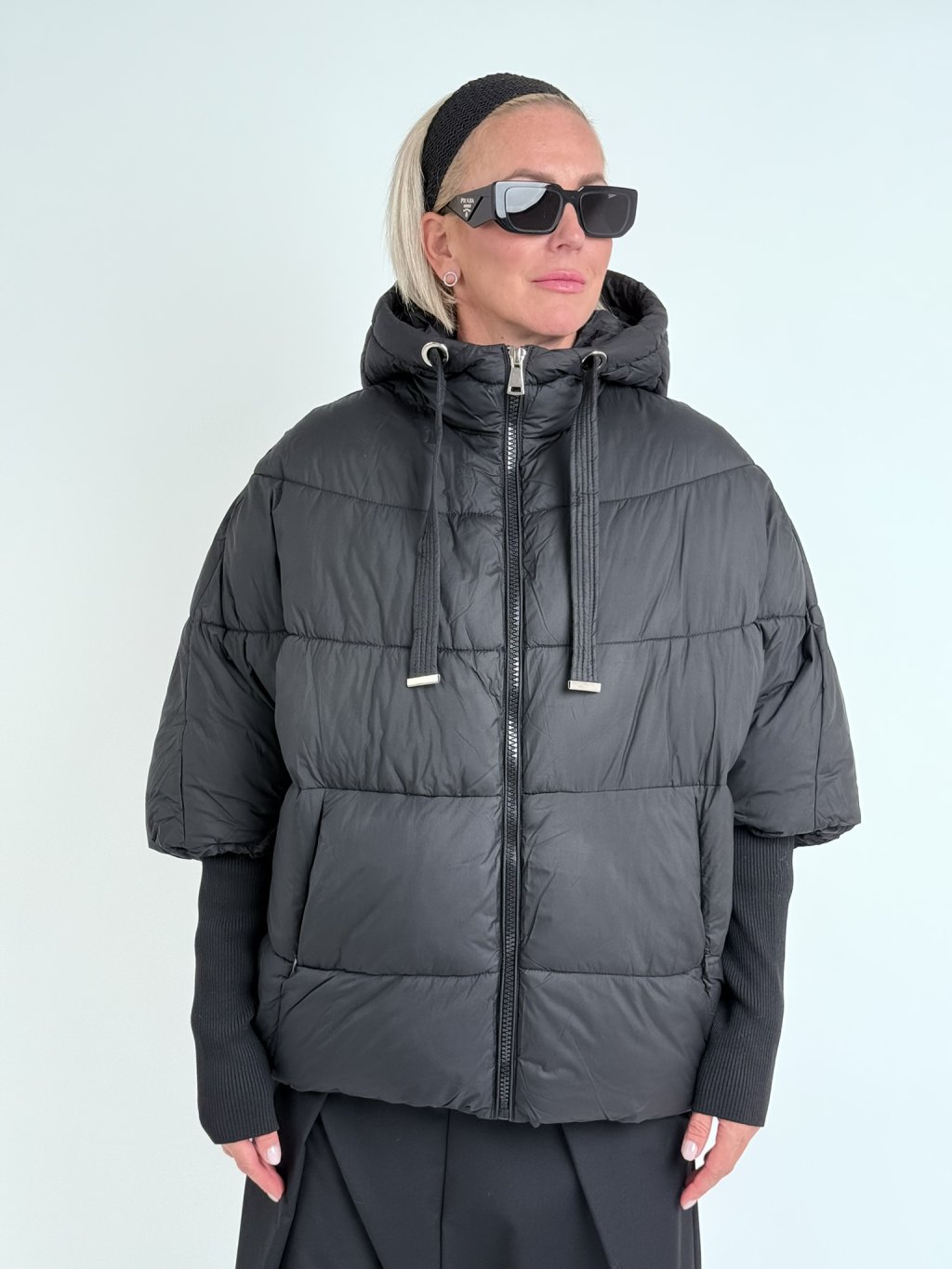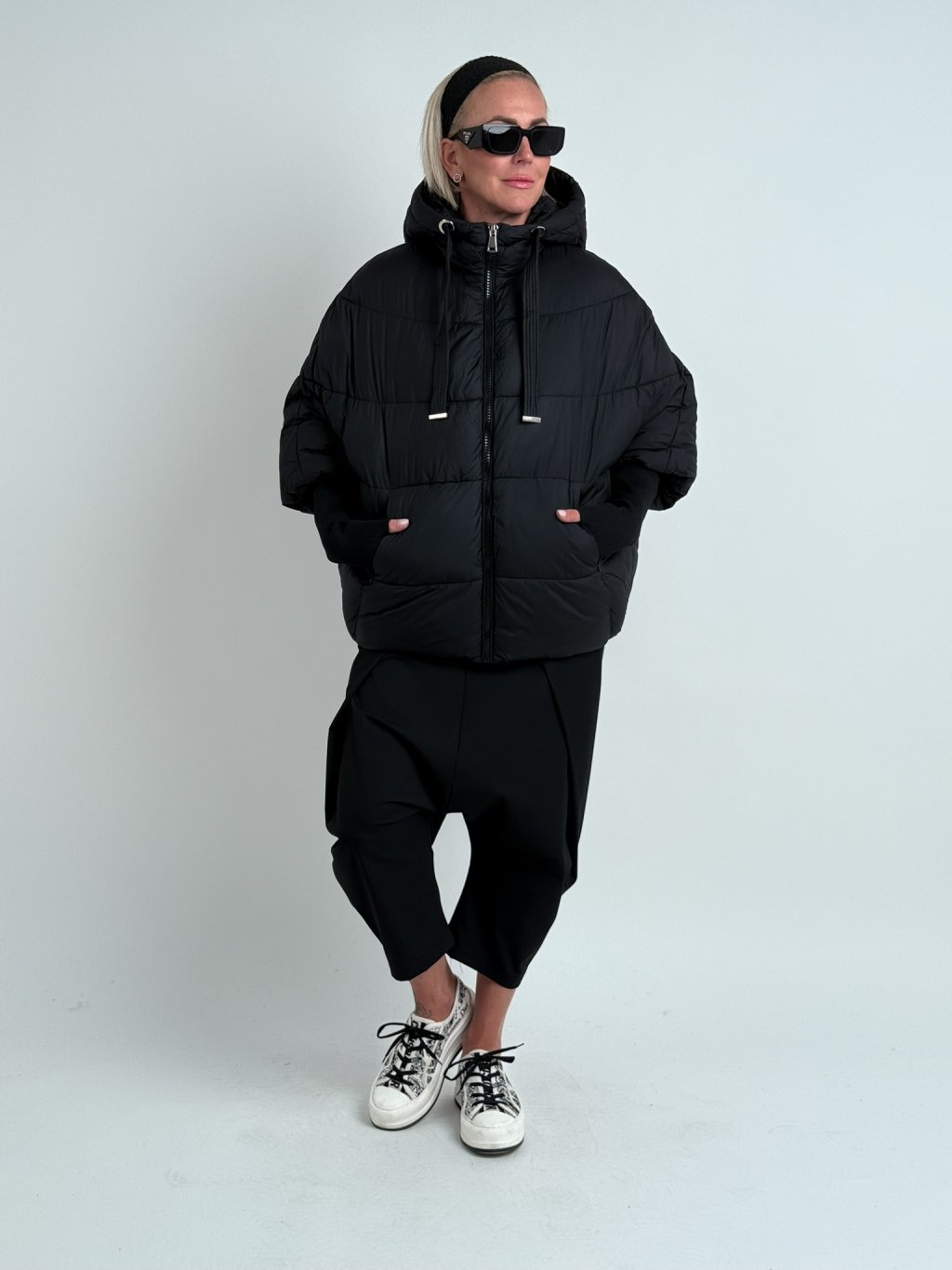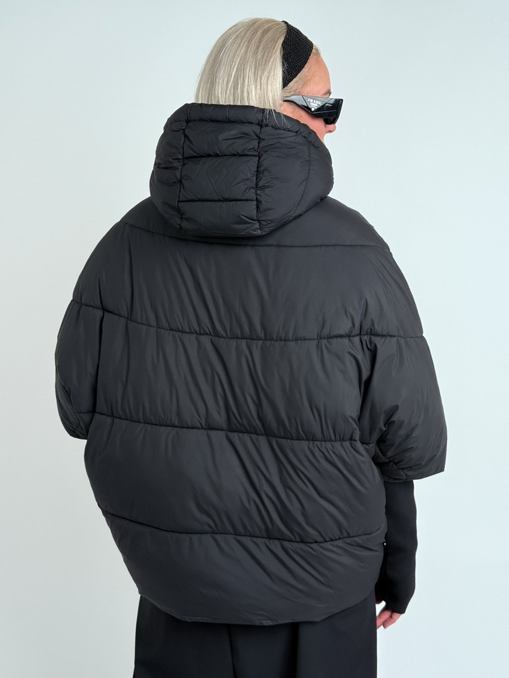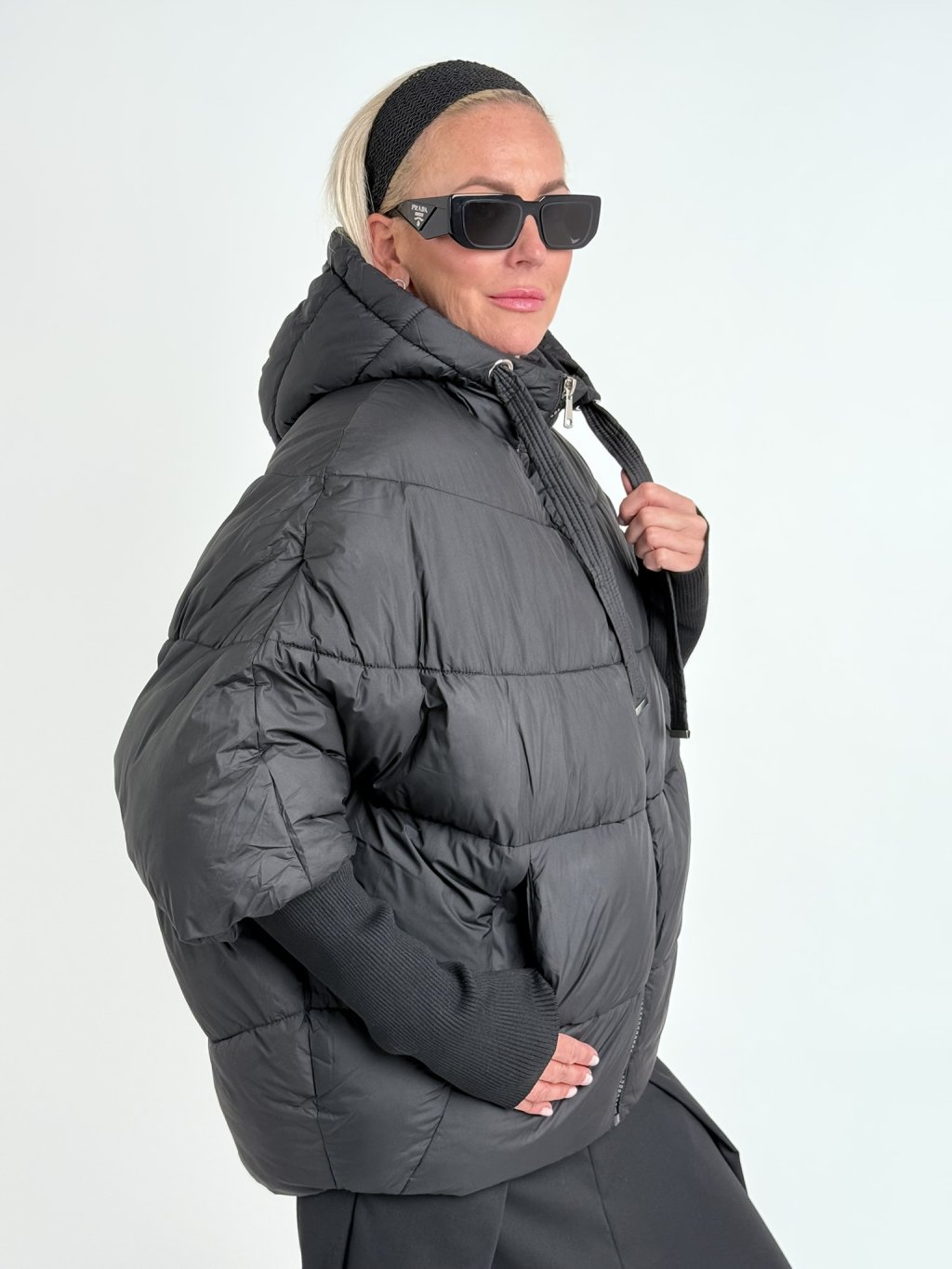 Krásna, ľahká bunda nadmernej veľkosti so zapínaním na zips, sťahovacou šnúrkou, veľkou kapucňou a nášivkami na rukávoch.