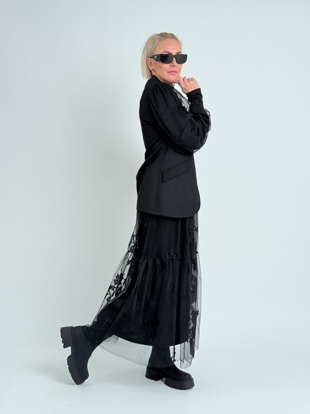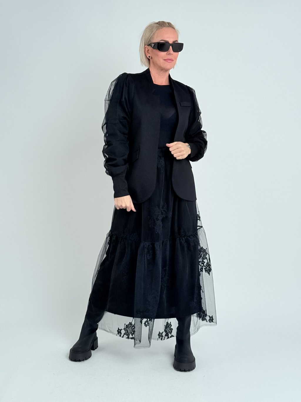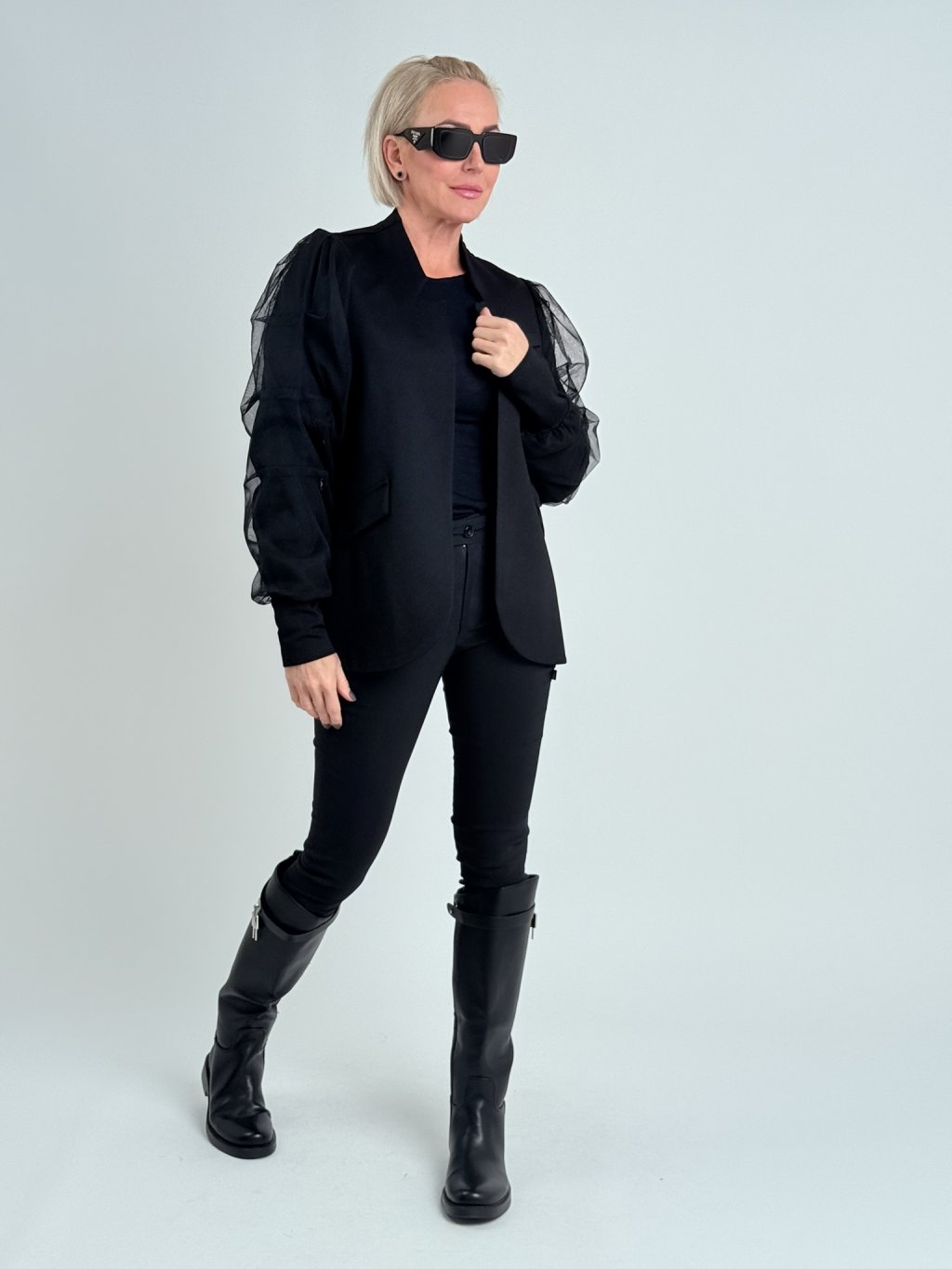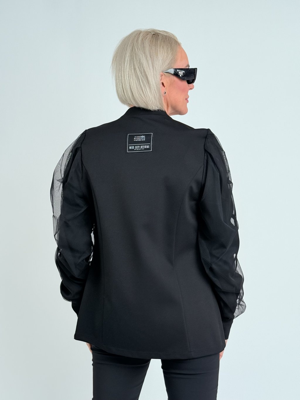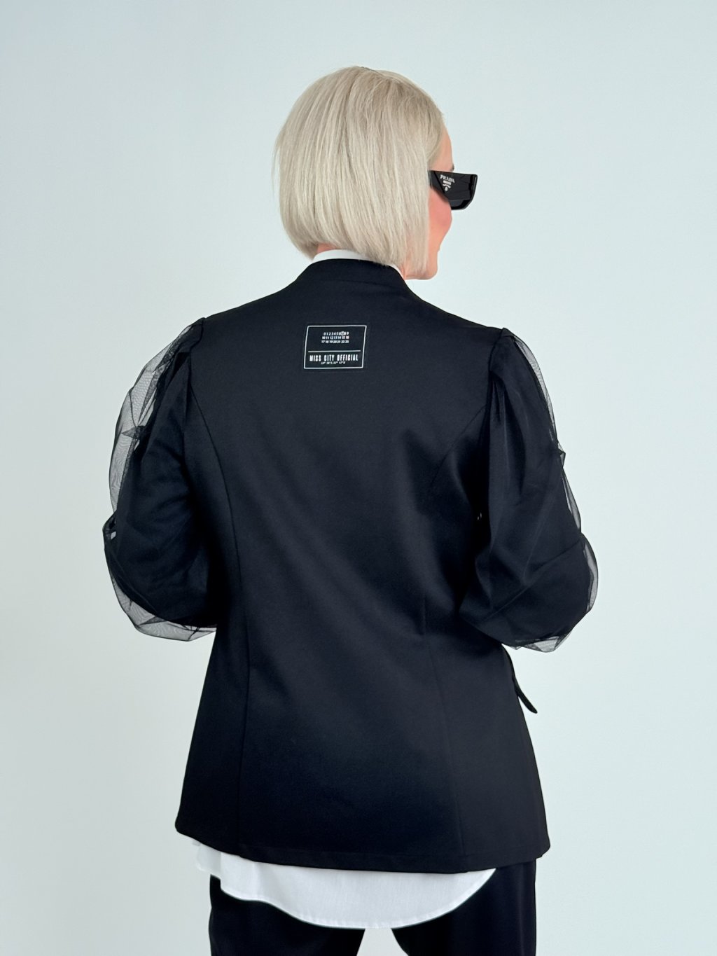Elegantné priliehavé sako s podšívkou, bez zapínania , s rukávmi kombinovanými s tylom.