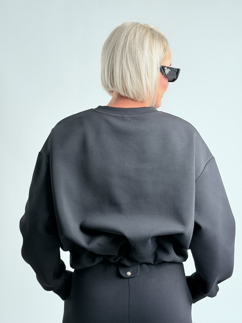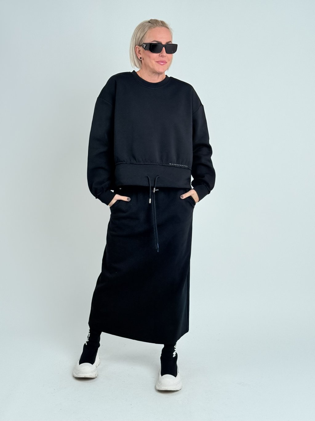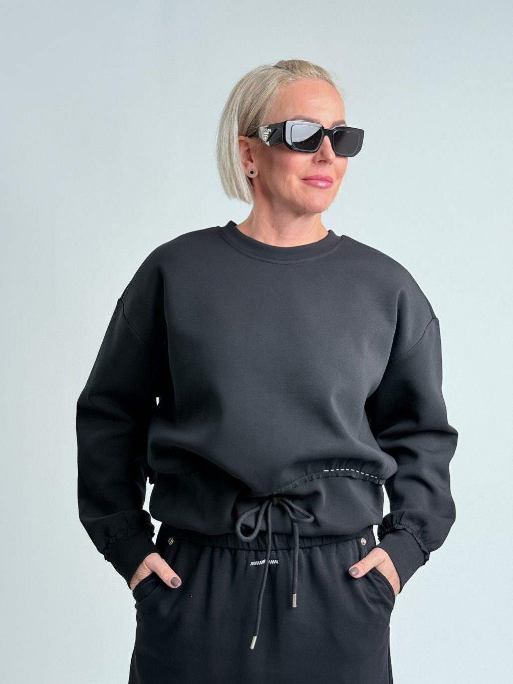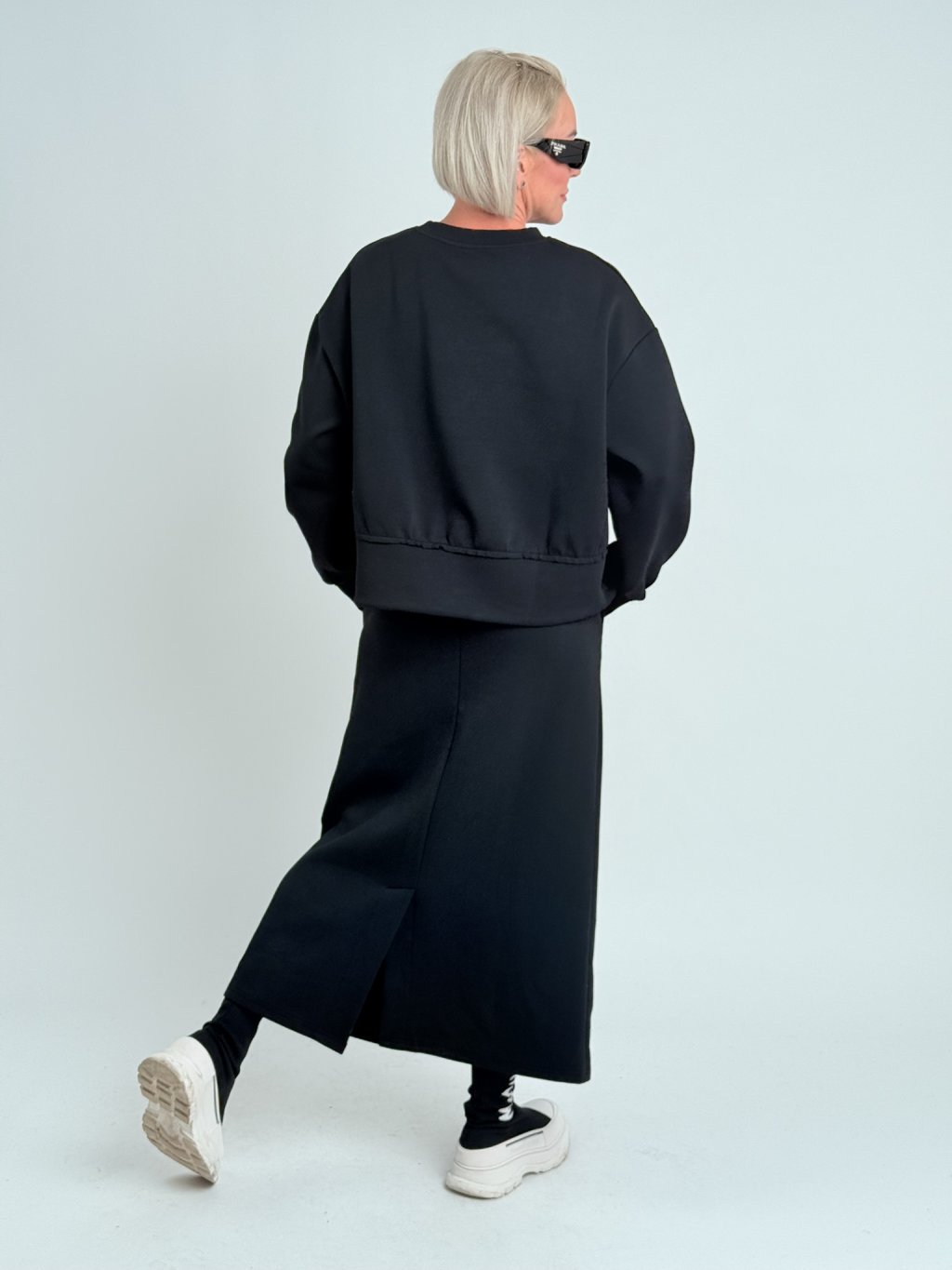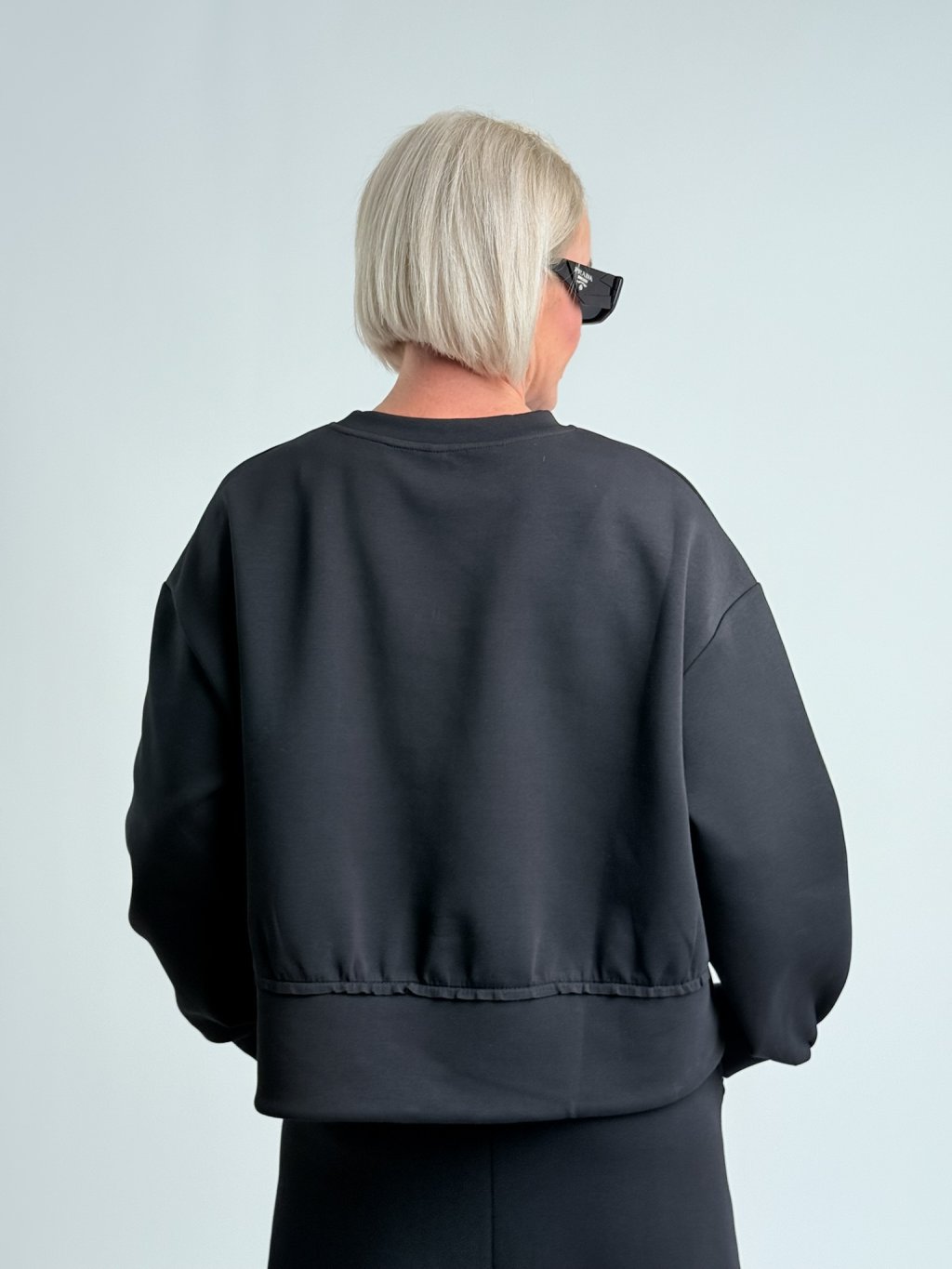 Krásna nadrozmerná mikina so stojačikom, zaujímavo riešeným spodným okrajom, ktorý sa dá stiahnuť vďaka šnúrke.