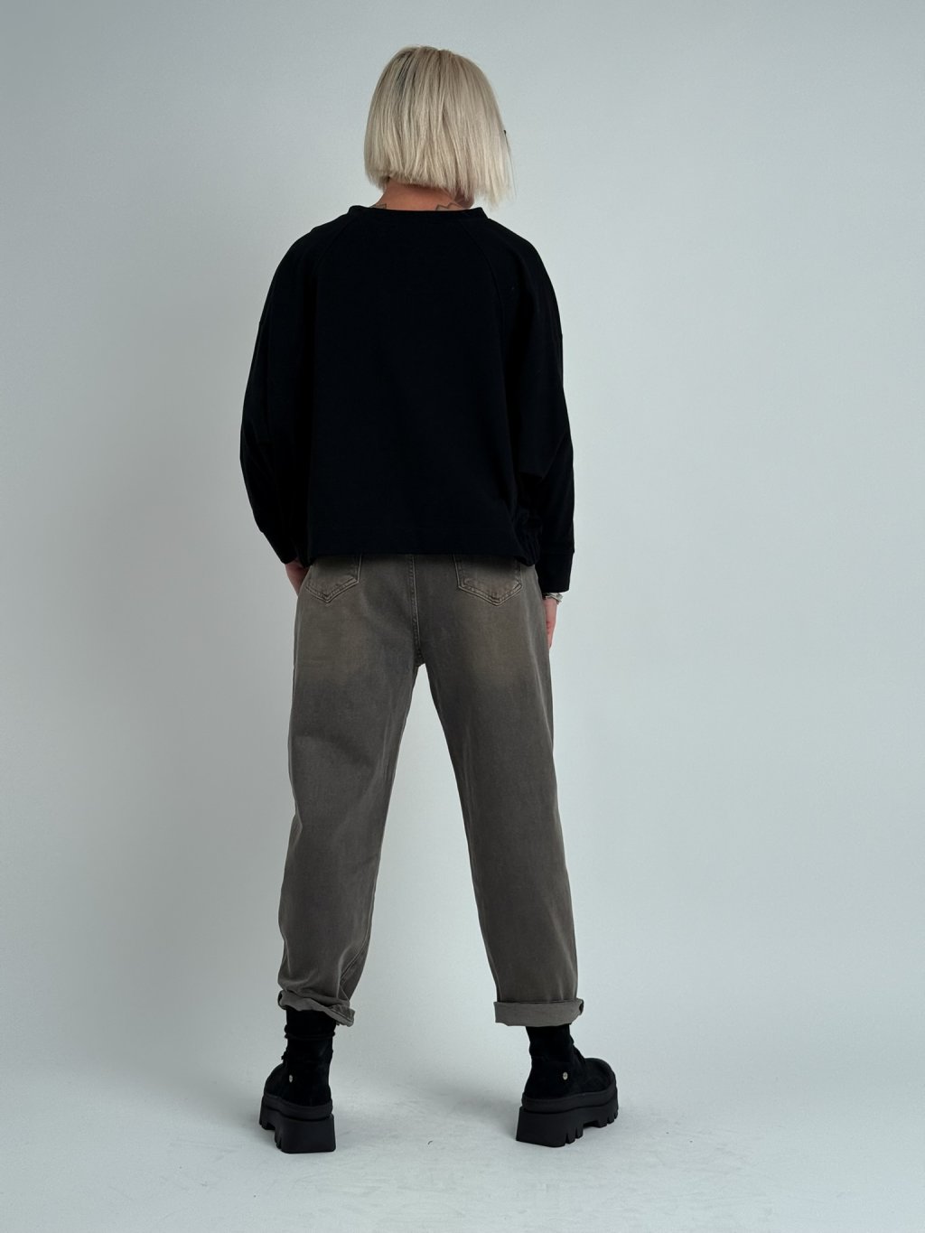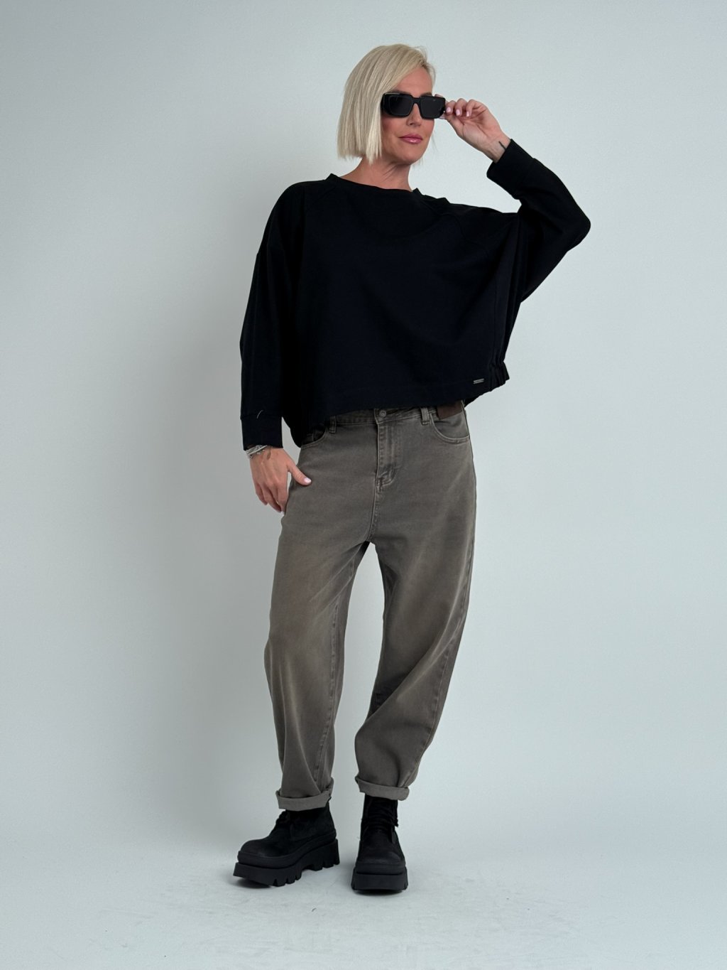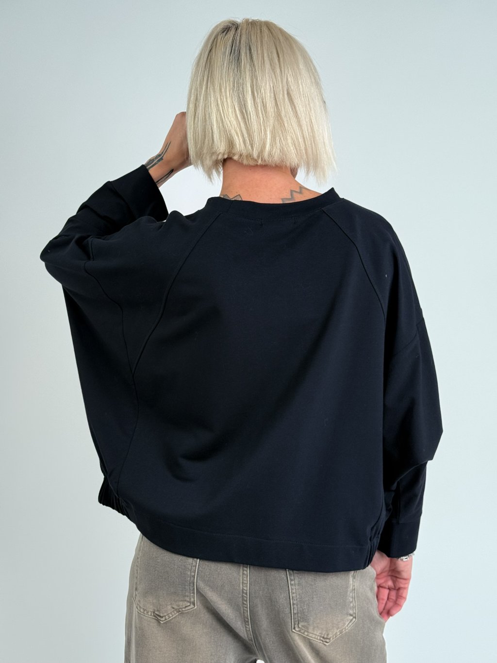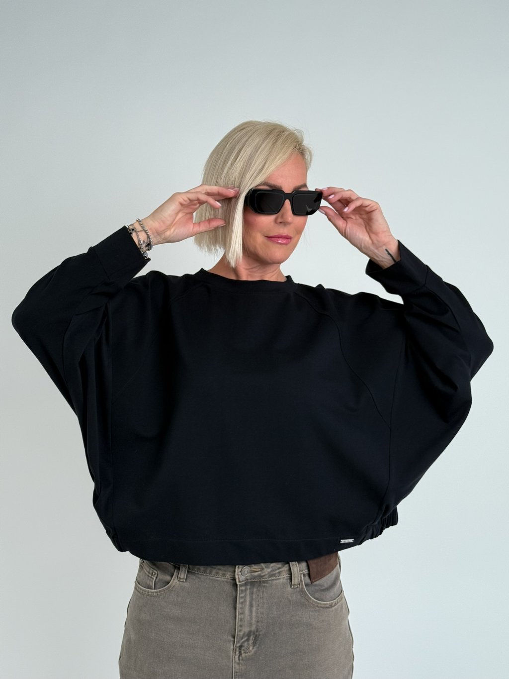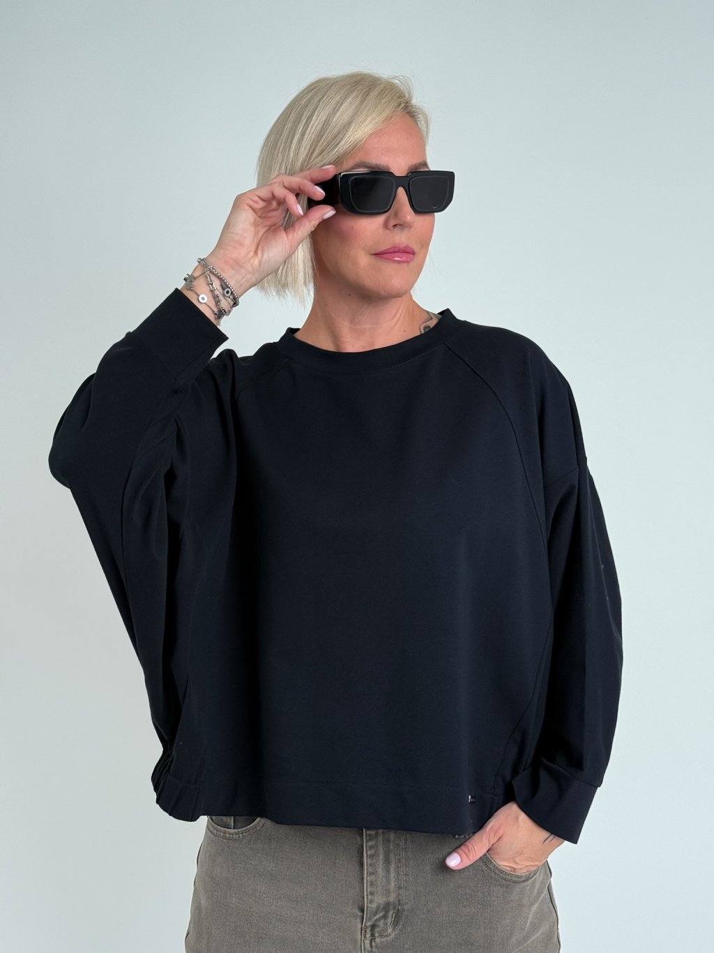 Krásna, ľahká mikina nadrozmernej veľkosti v netopierom strihu s elastickým spodným okrajom na bokoch a 7/8 dlhými rukávmi.