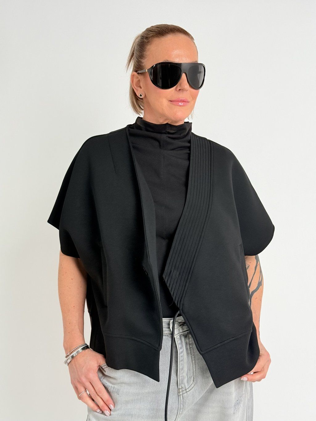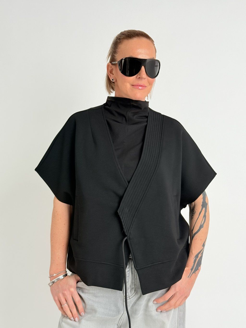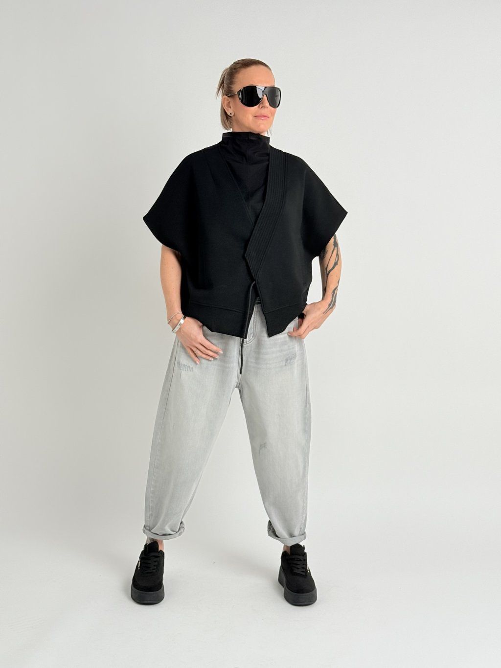 Mikinová vesta s výstrihom do V, spadnutými rukávmi a zapínaním na patentky.