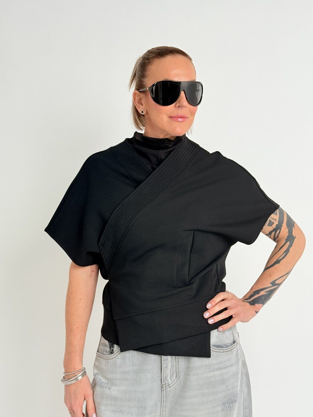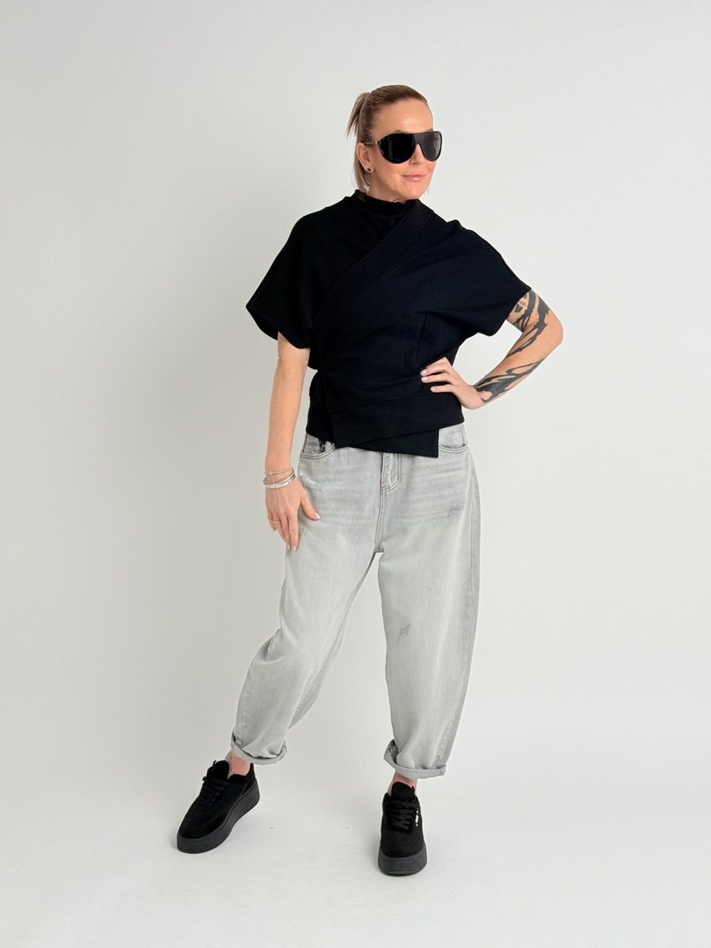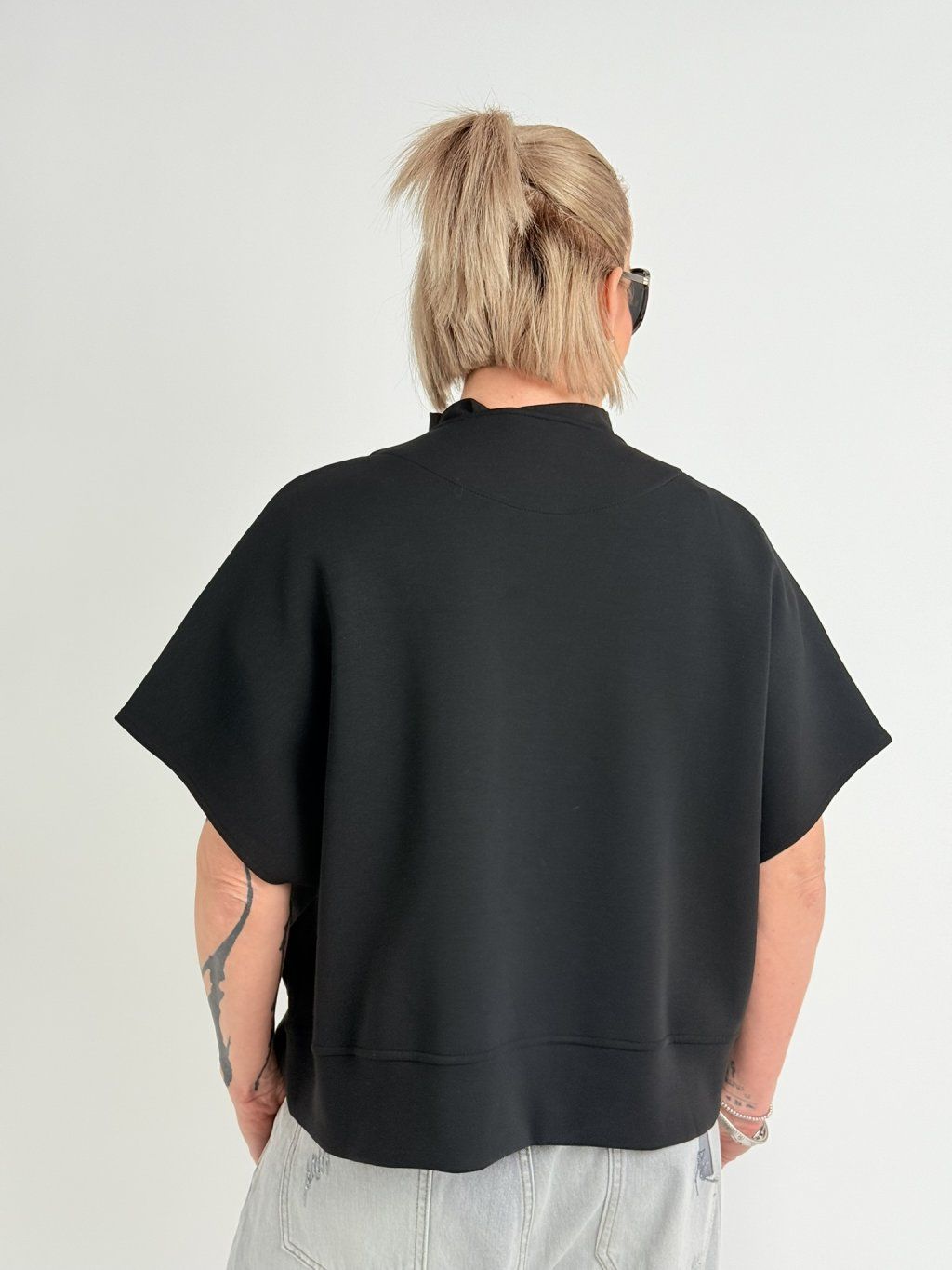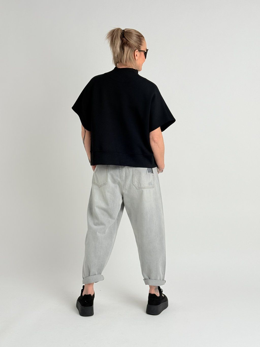 Mikinová vesta s výstrihom do V, spadnutými rukávmi a zapínaním na patentky.