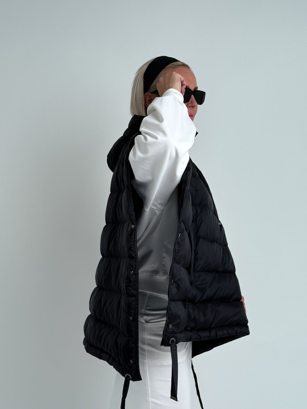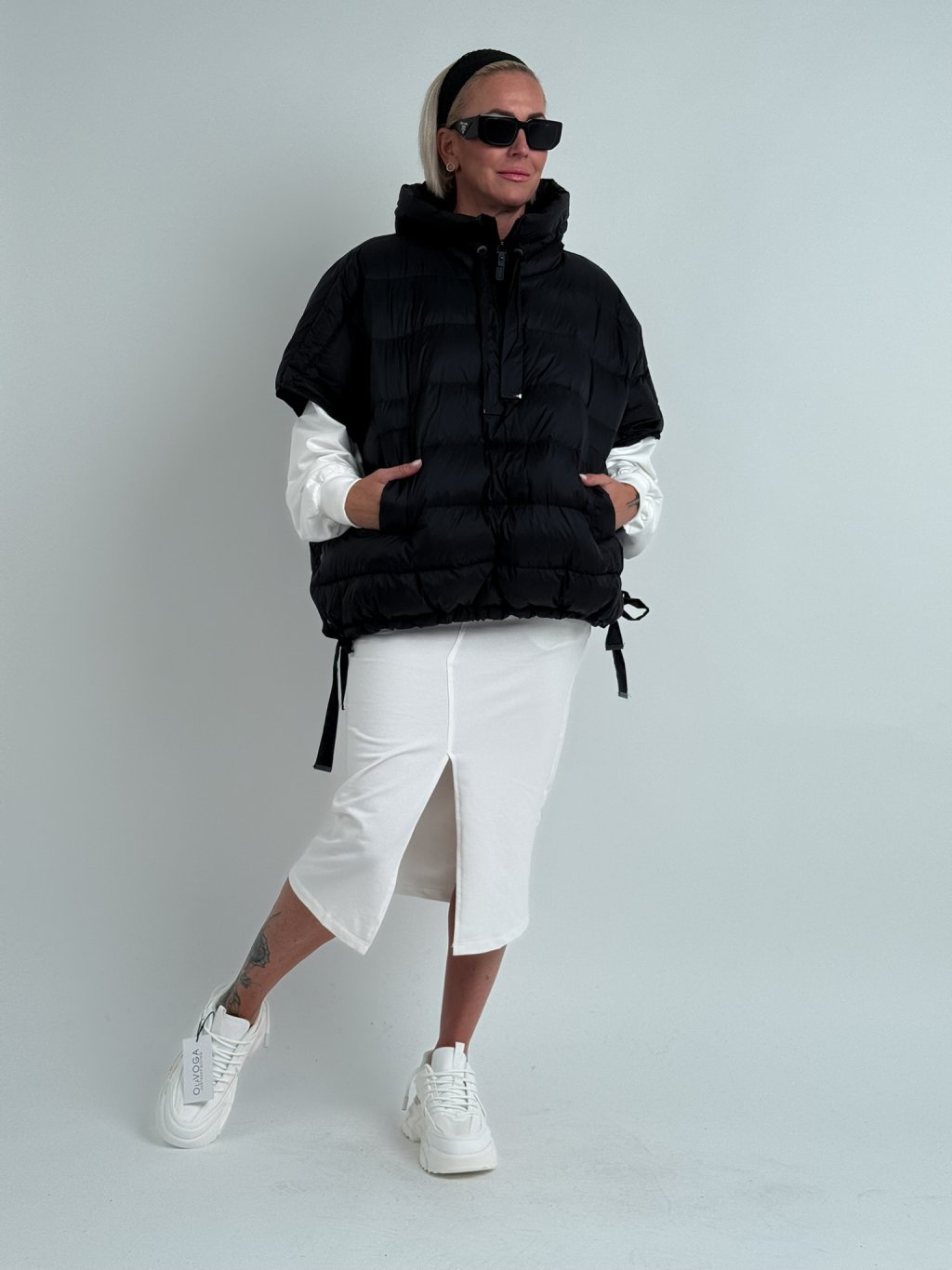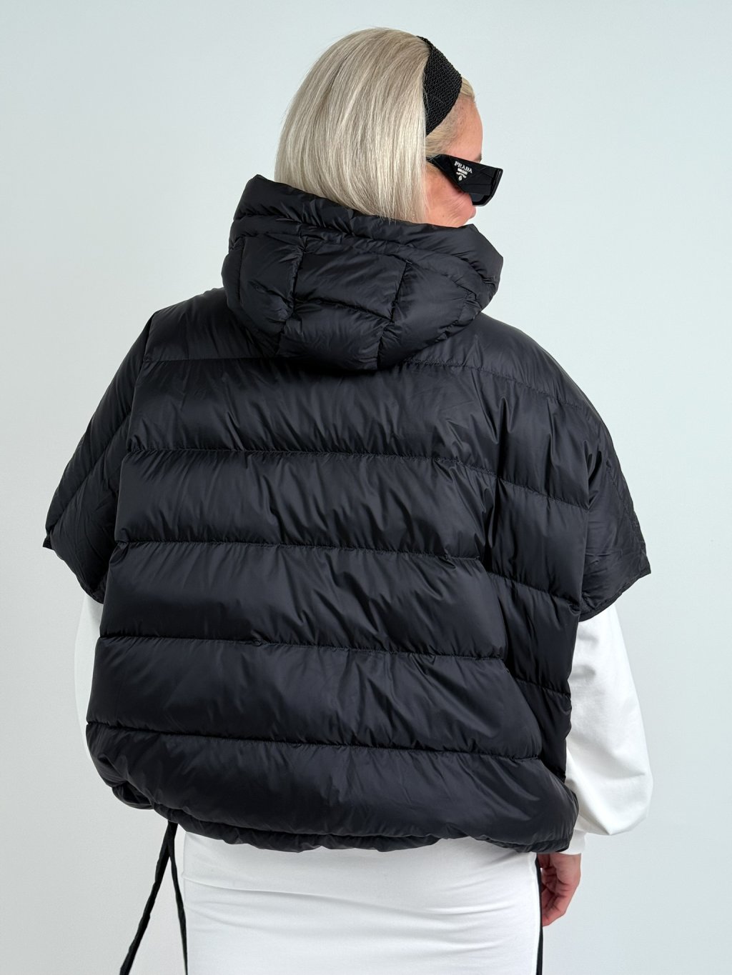 Krásna bunda nadrozmernej veľkosti s výplňou z kačacieho peria, bez rukávov, s bočným zapínaním na zips, sťahovacou šnúrkou v spodnej časti, vreckami, krátkym zipsom a kapucňou. Na hrubší sveter alebo koženú bundu.