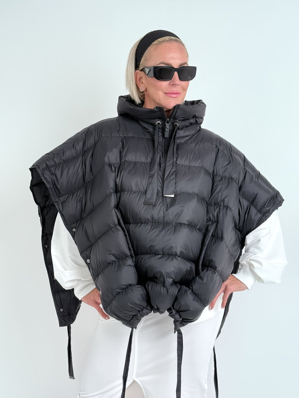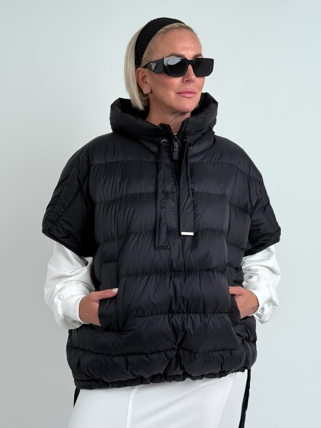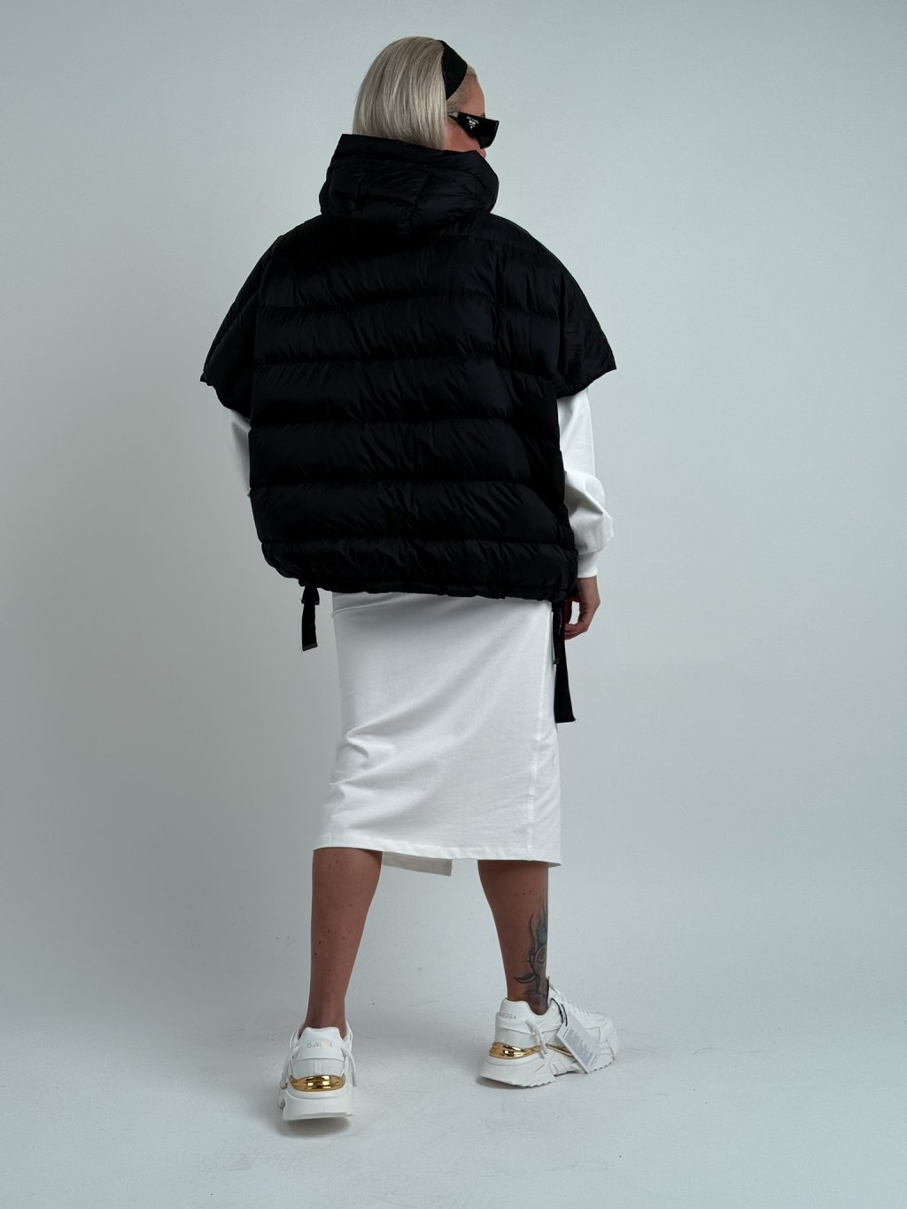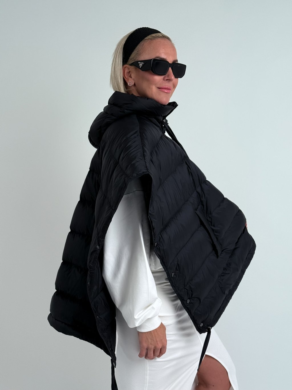 Krásna bunda nadrozmernej veľkosti s výplňou z kačacieho peria, bez rukávov, s bočným zapínaním na zips, sťahovacou šnúrkou v spodnej časti, vreckami, krátkym zipsom a kapucňou. Na hrubší sveter alebo koženú bundu.