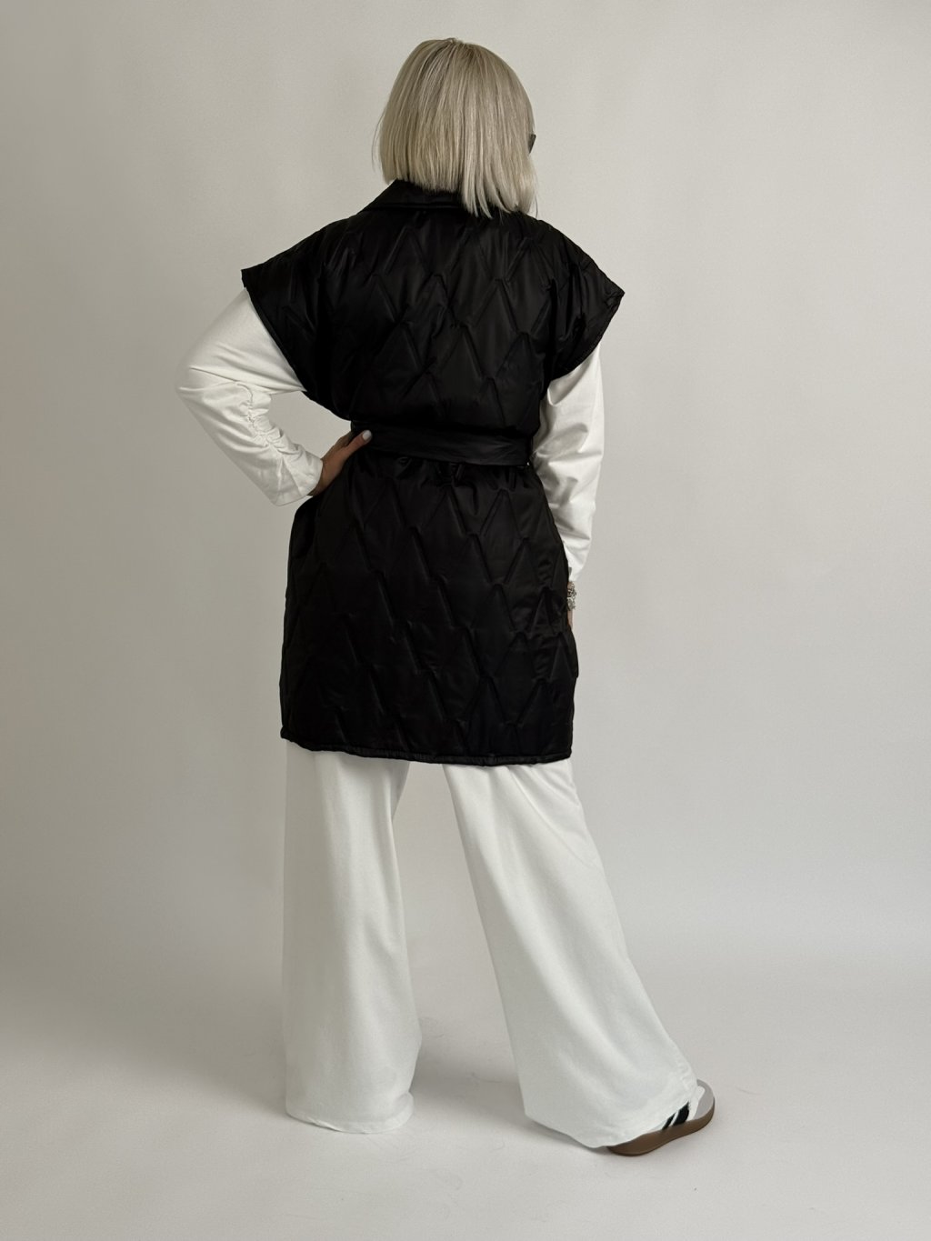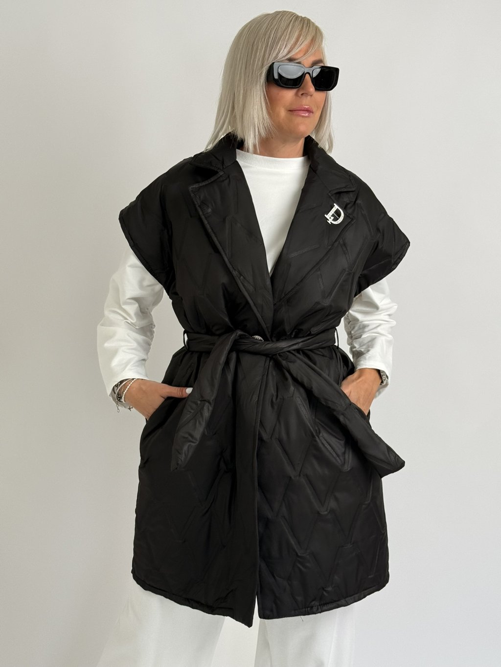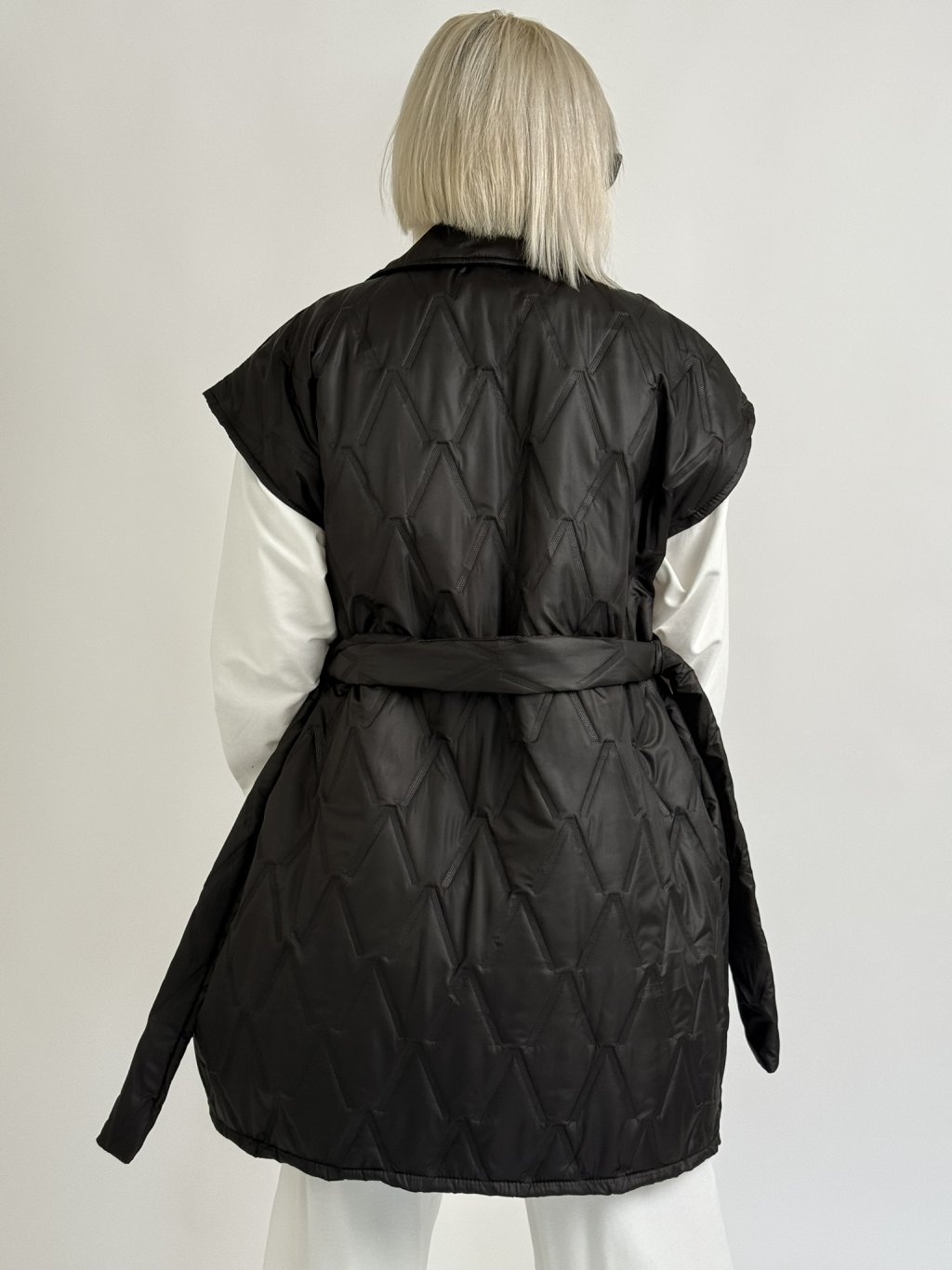 Ľahká prešívaná vesta s opaskom a zapínaním na gombíky.
