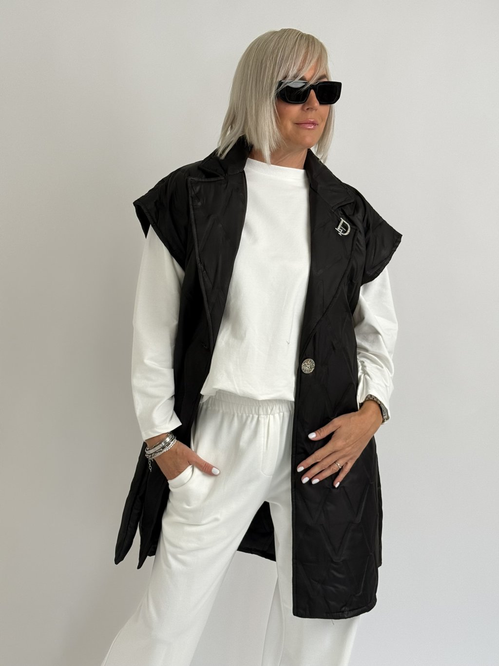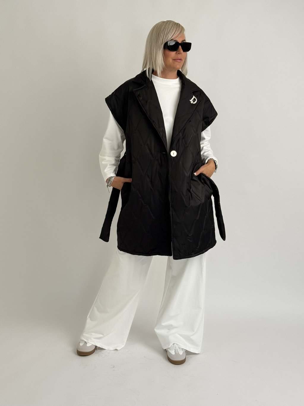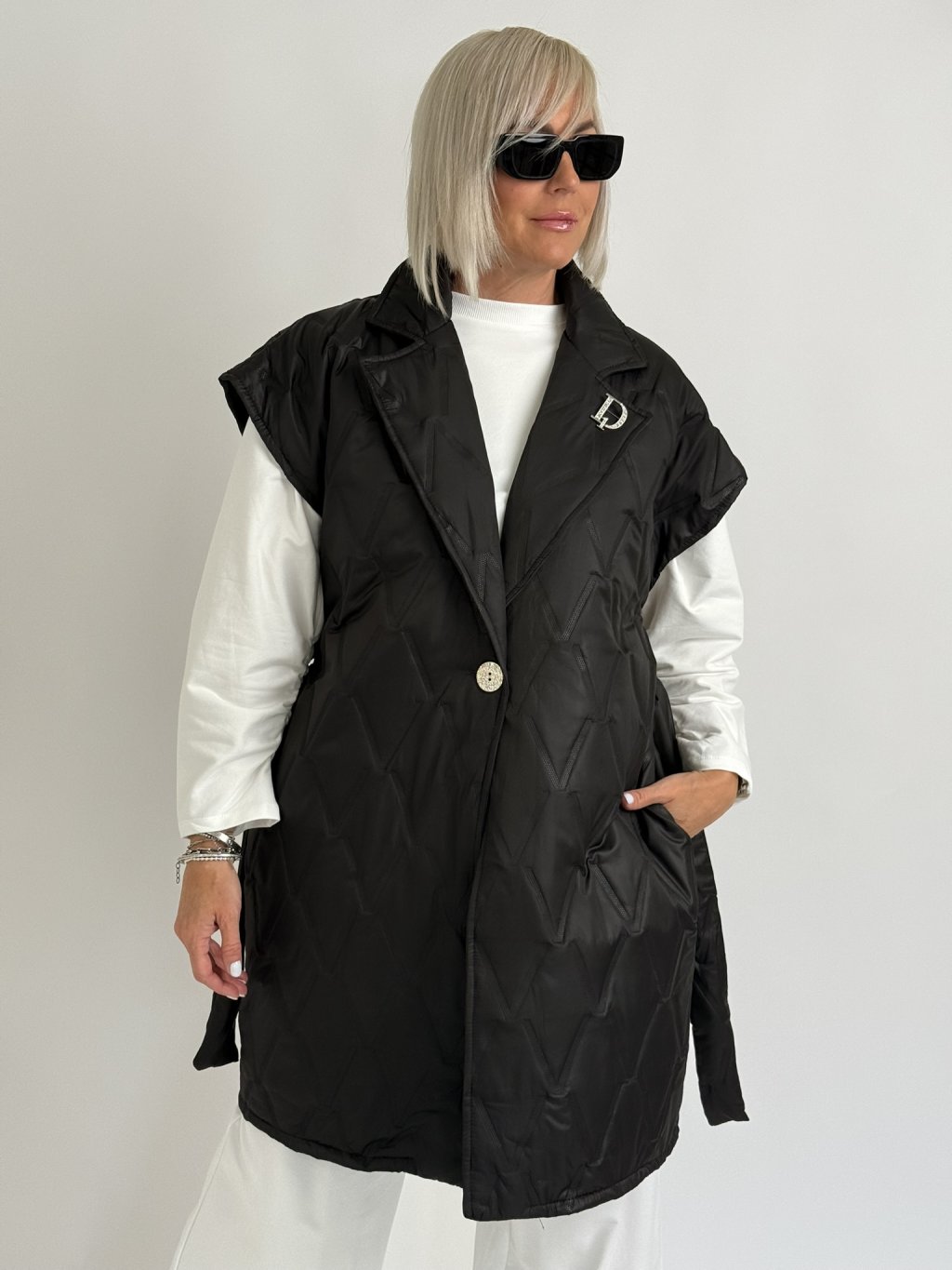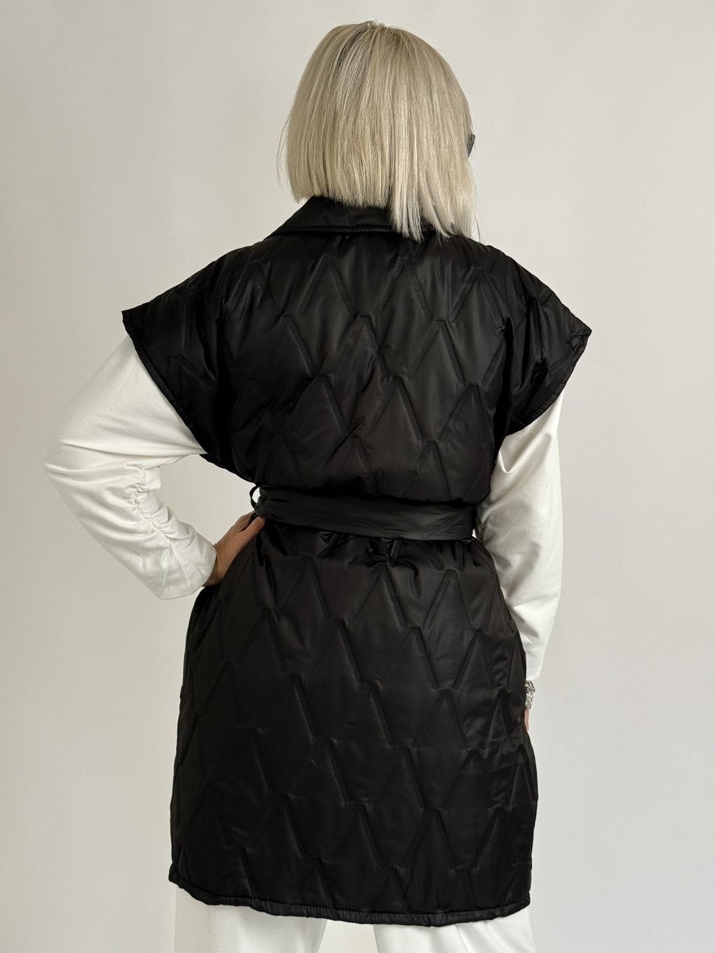 Ľahká prešívaná vesta s opaskom a zapínaním na gombíky.