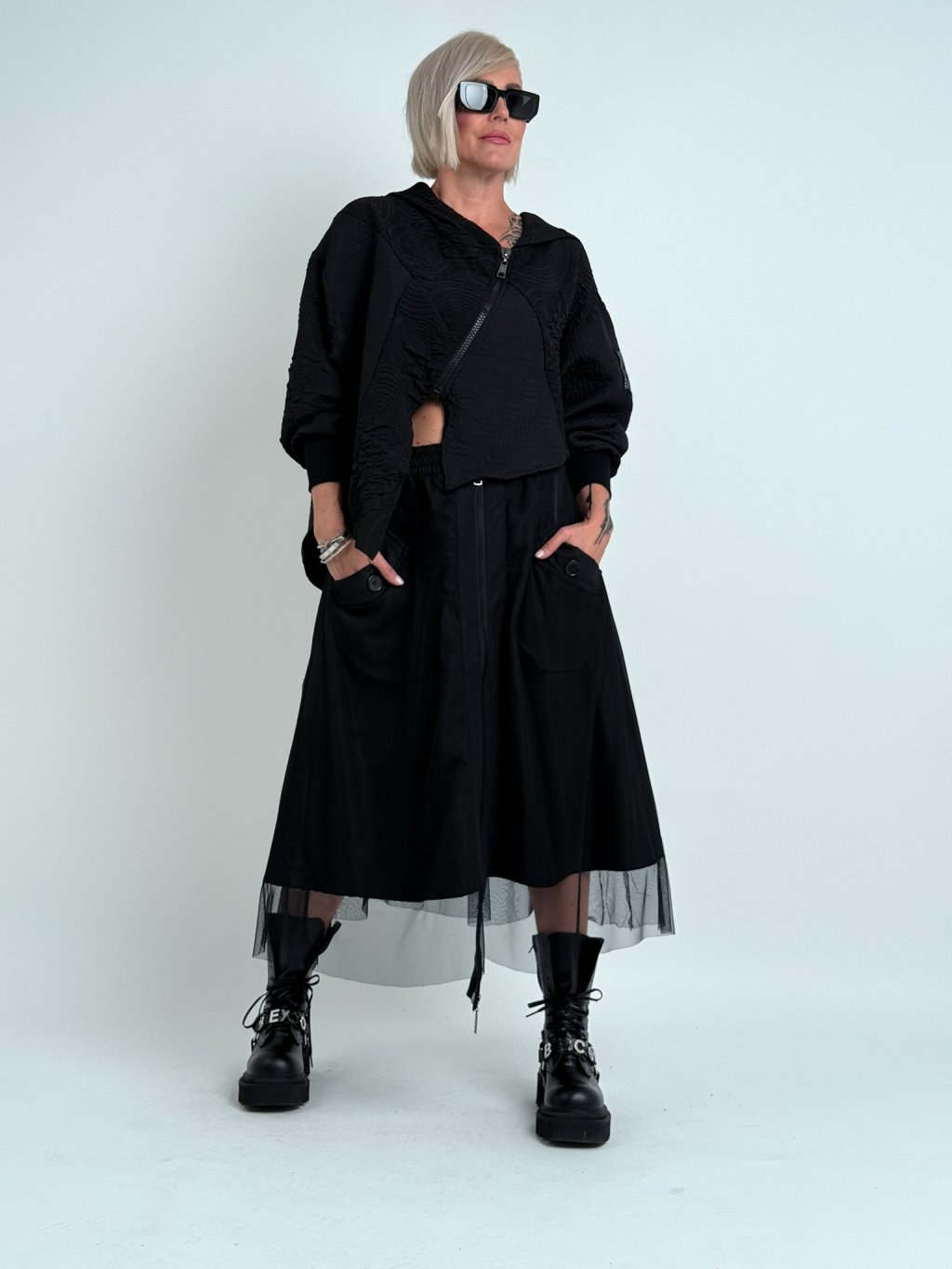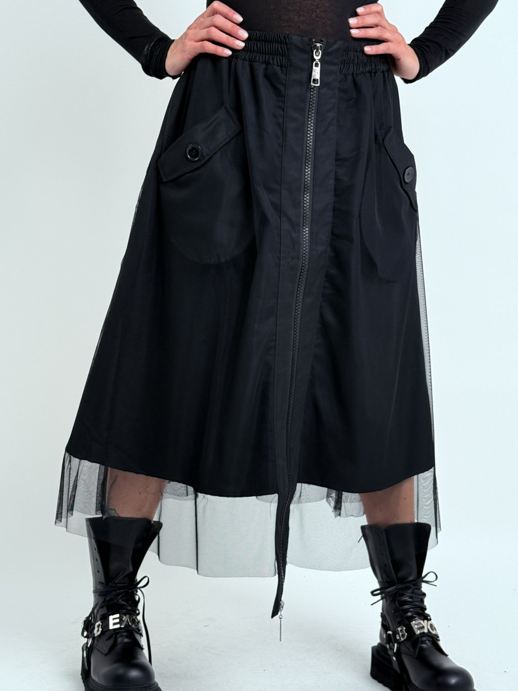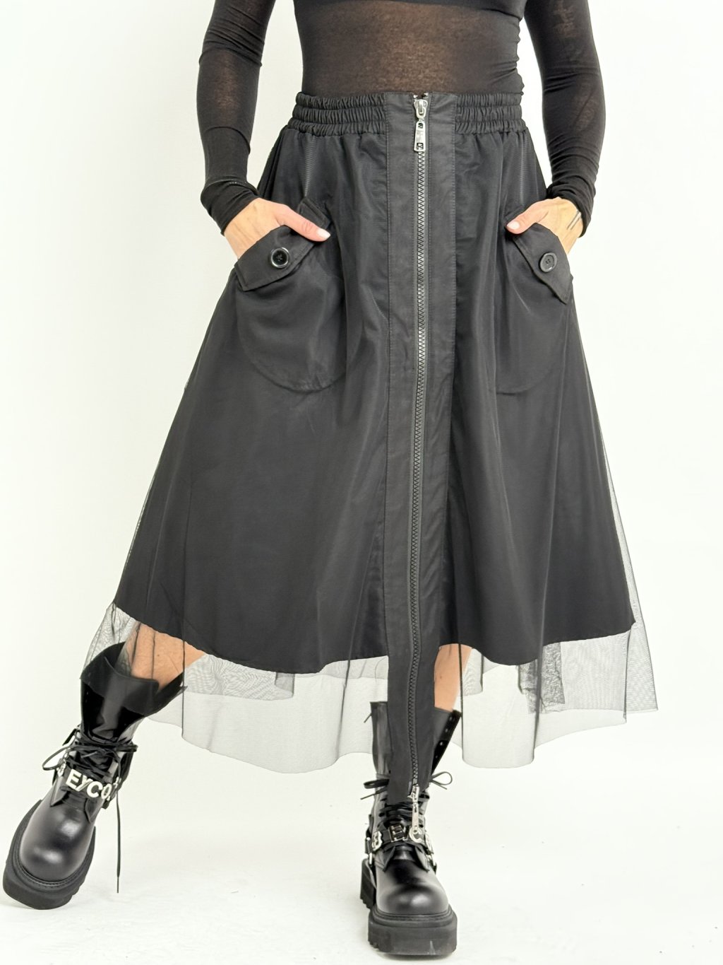 Krásna dvojitá sukňa v kombinácii s tylom, vpredu s vreckami a obojstranným zipsom.