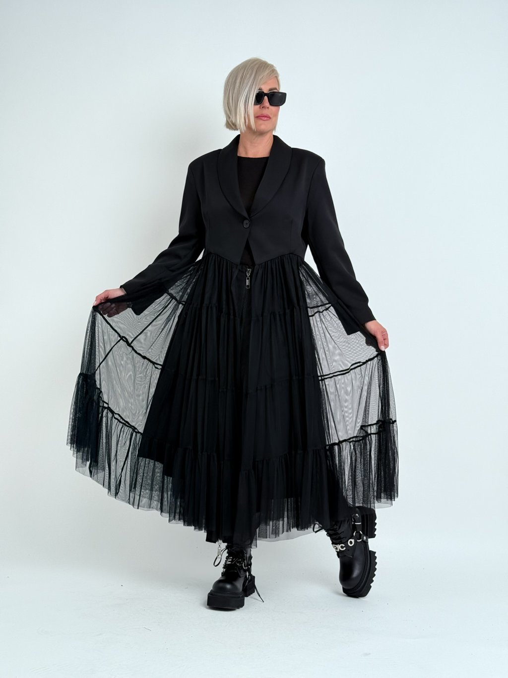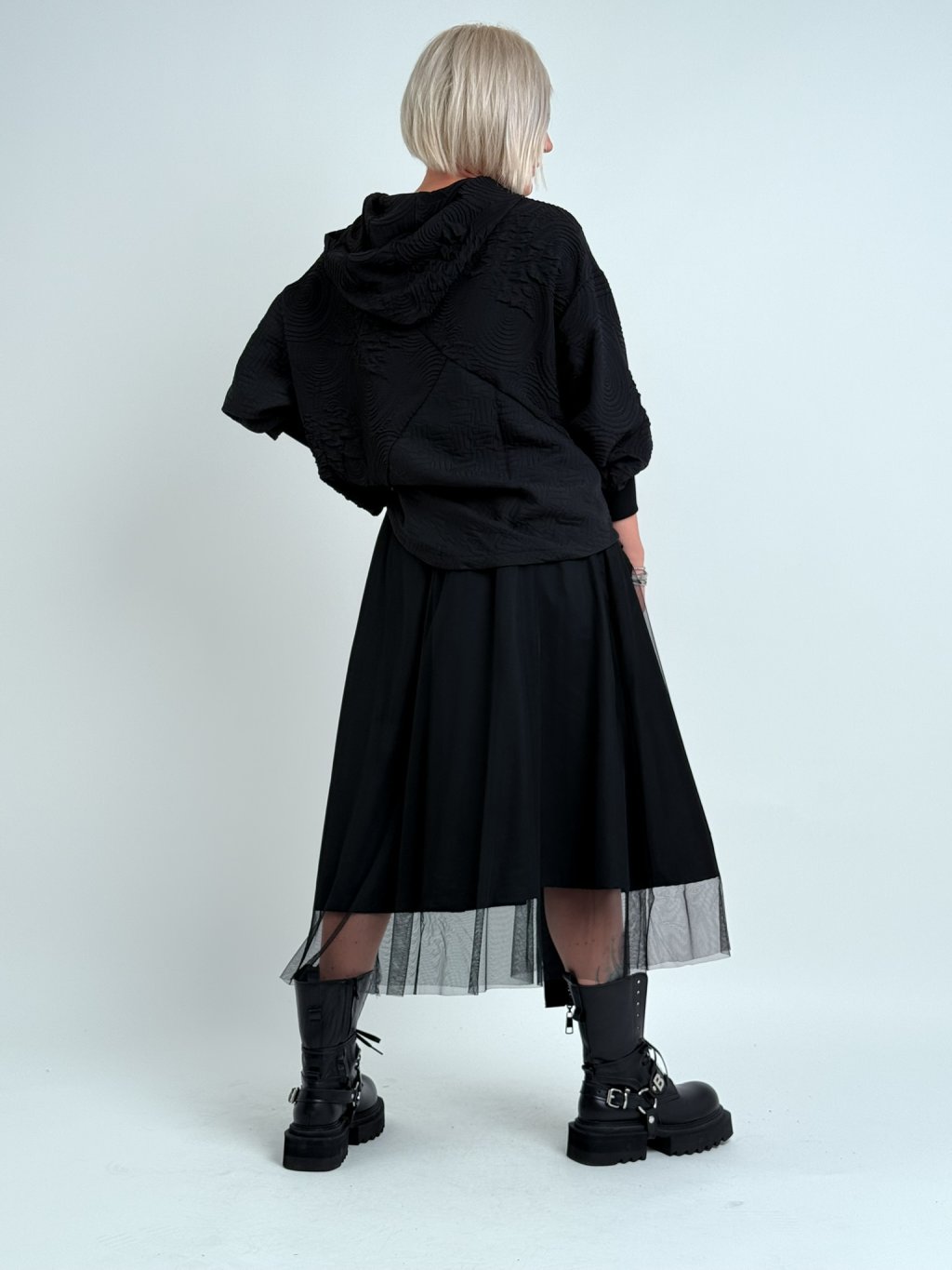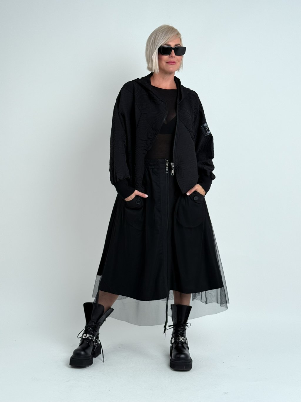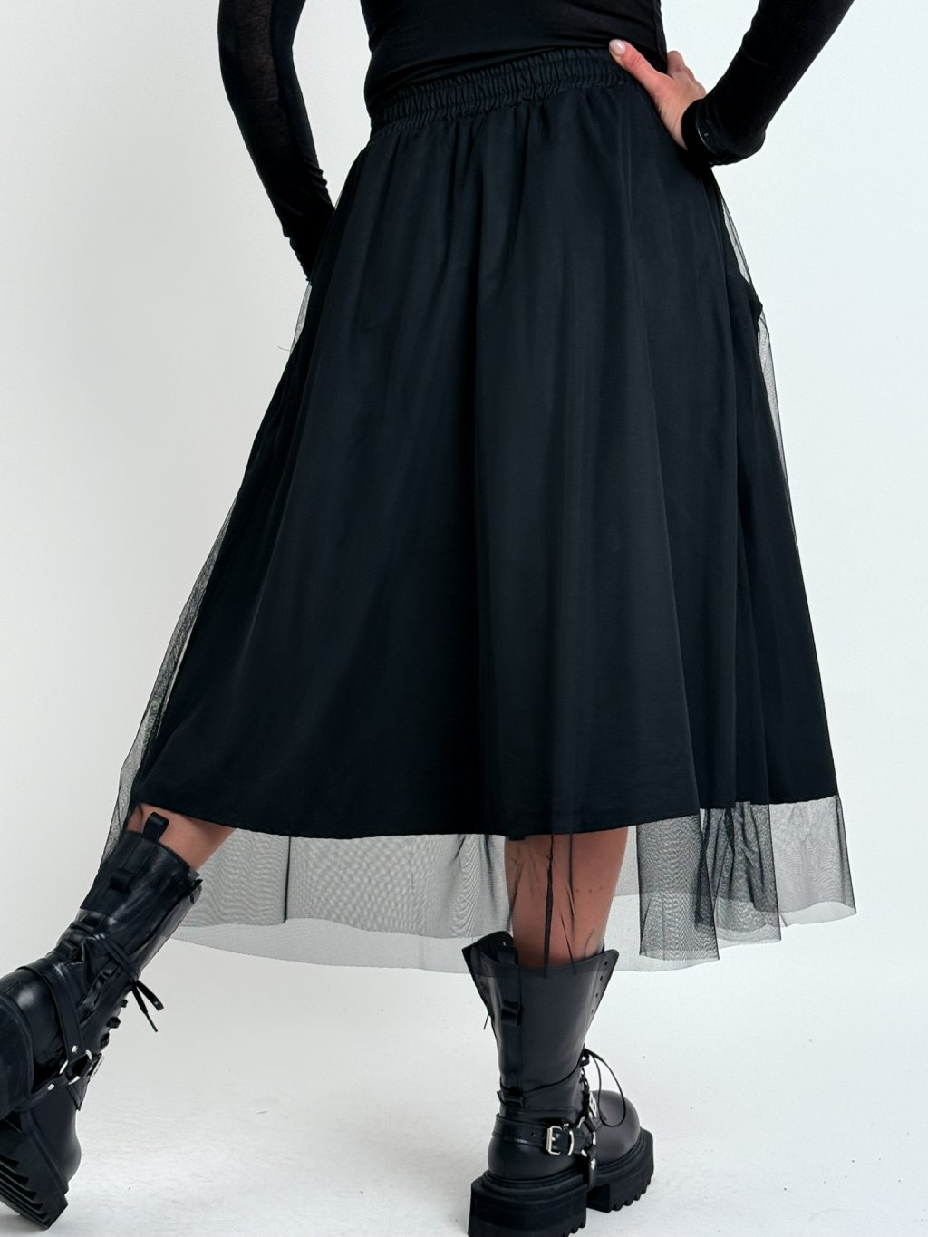Krásna dvojitá sukňa v kombinácii s tylom, vpredu s vreckami a obojstranným zipsom.