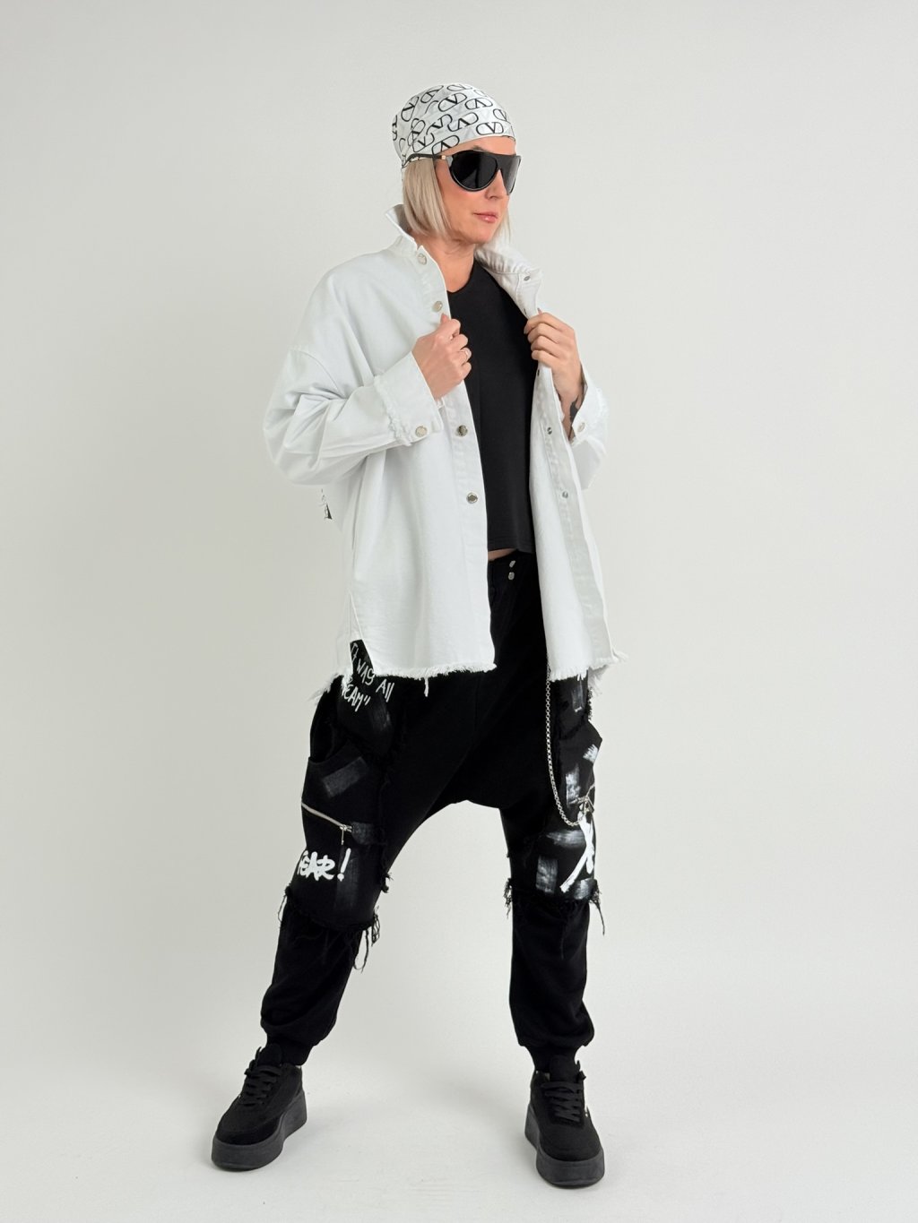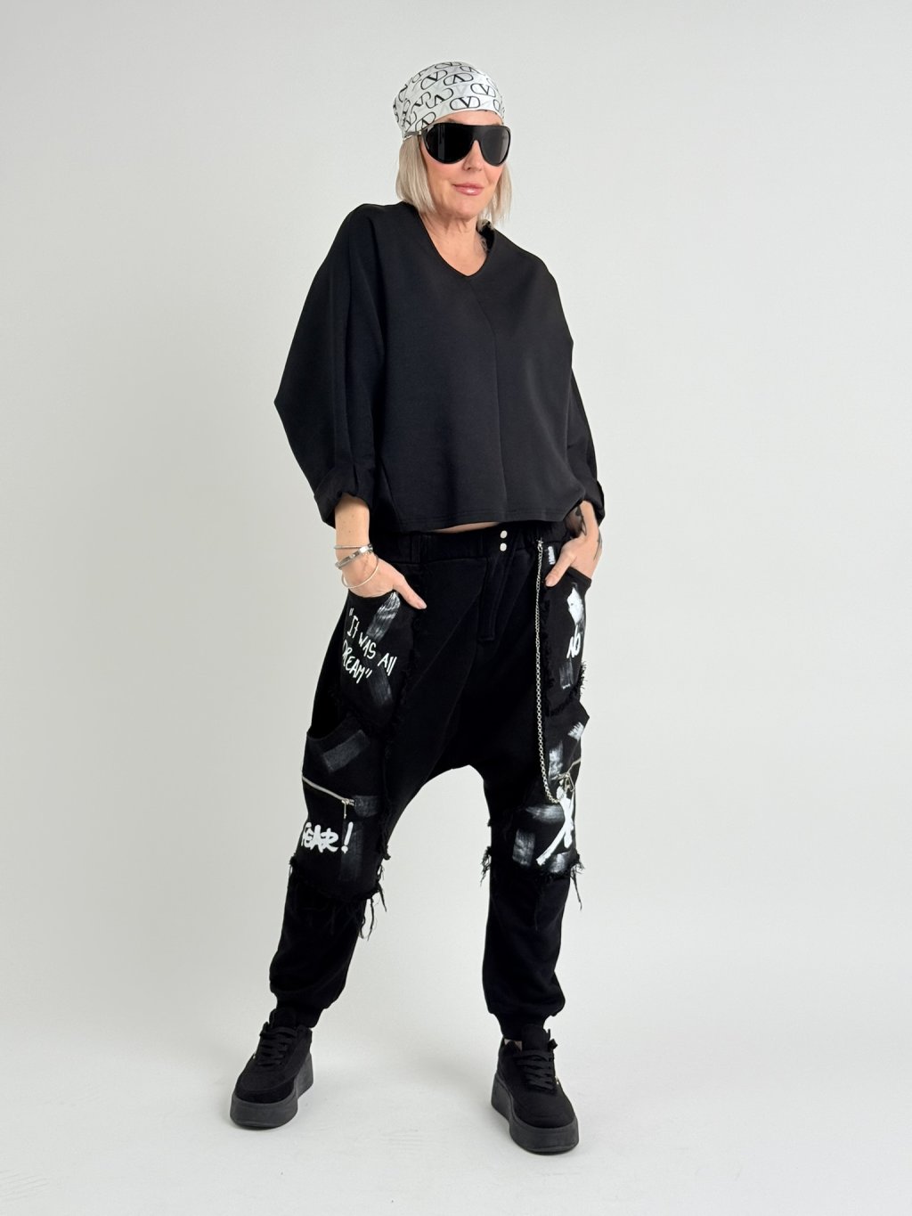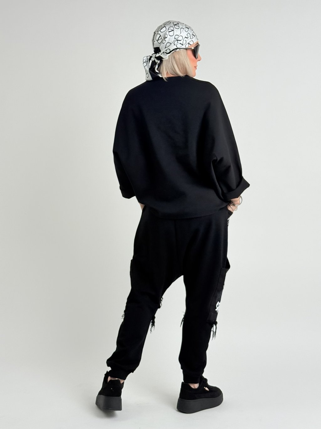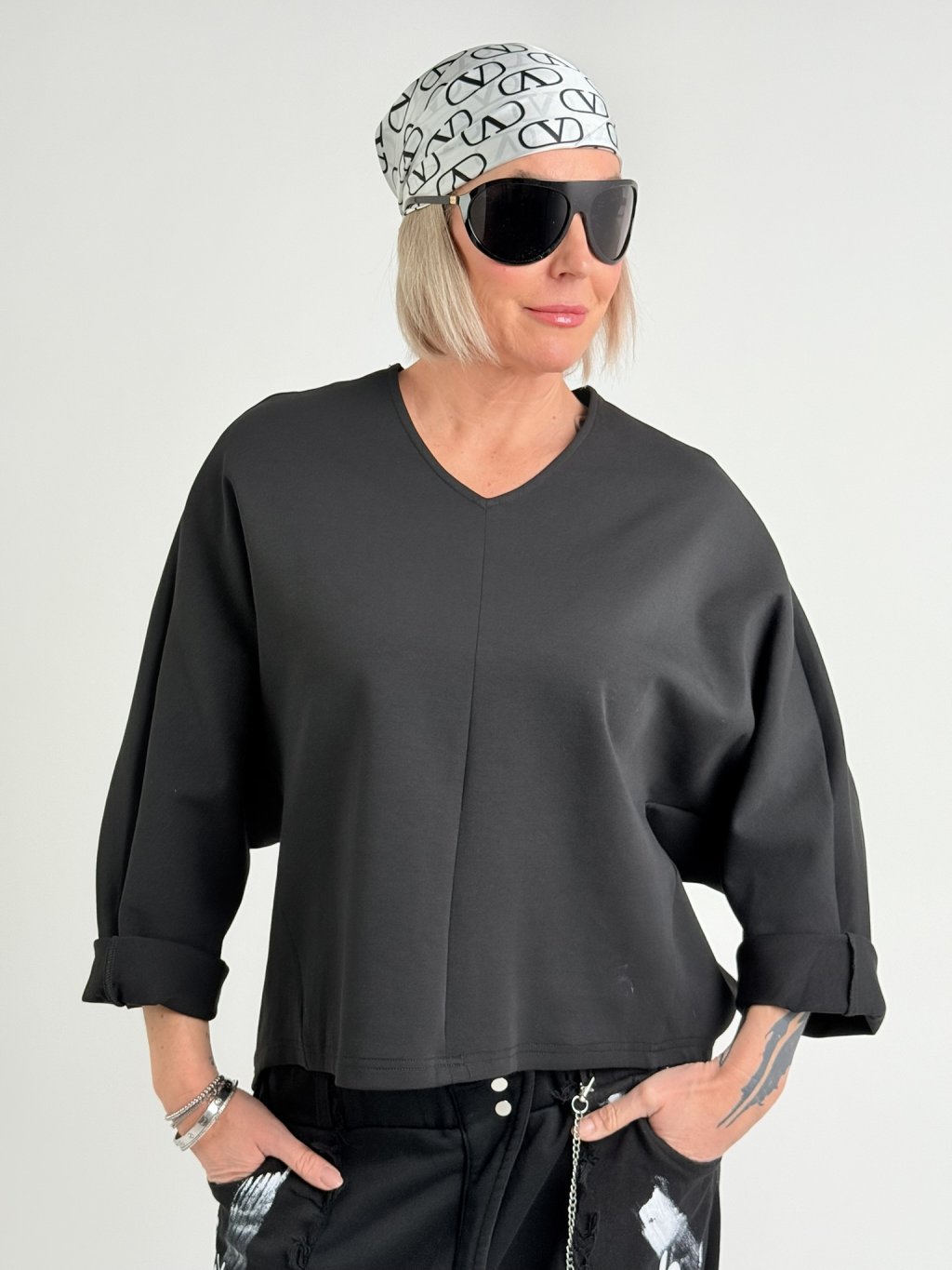 Silnejšia tunika netopierieho strihu s rukávmi po zápästie, ktoré sa dajú nosiť aj vyhrnuté, s výstrihom do V a mierne predĺženým chrbtom.