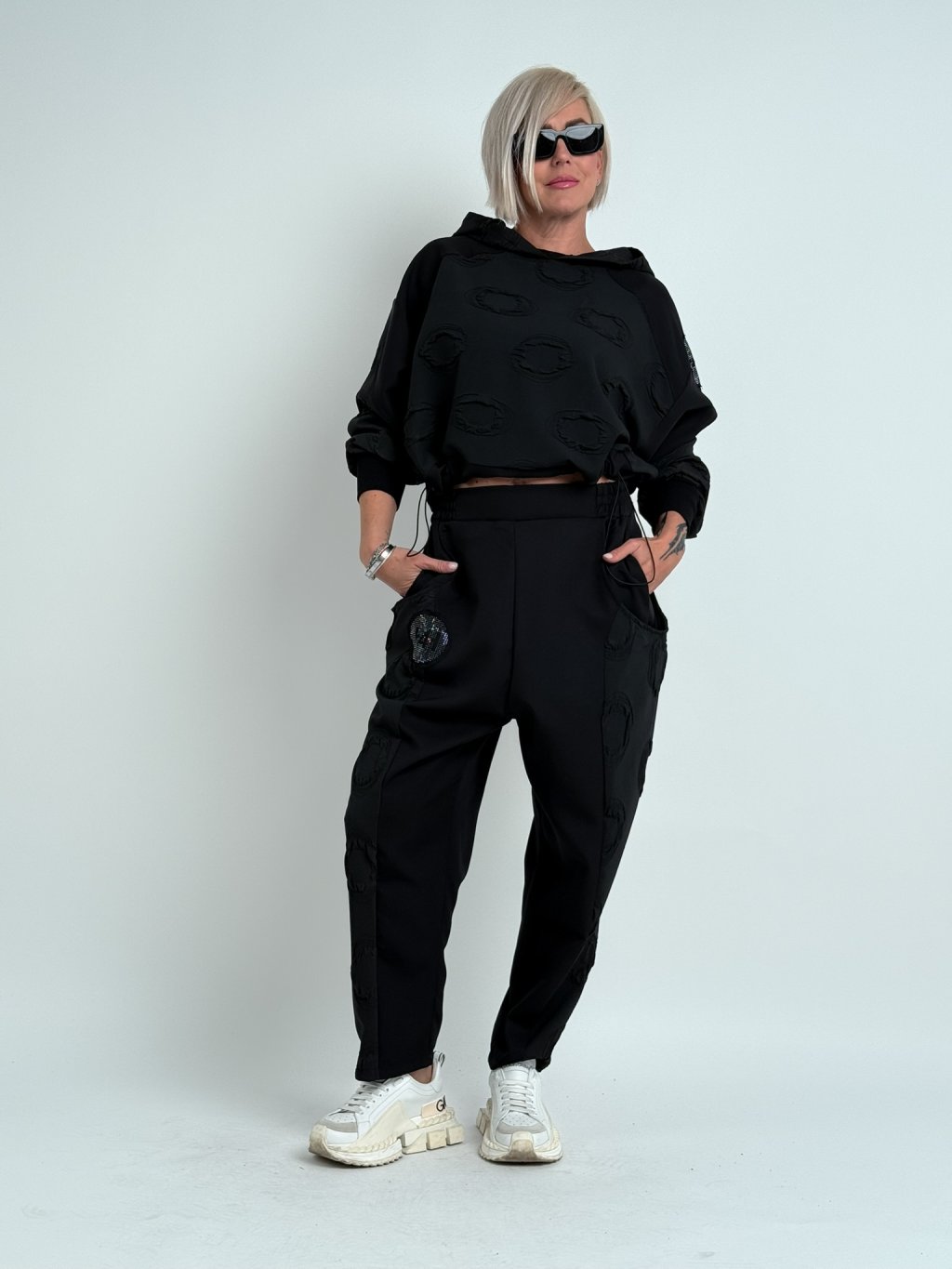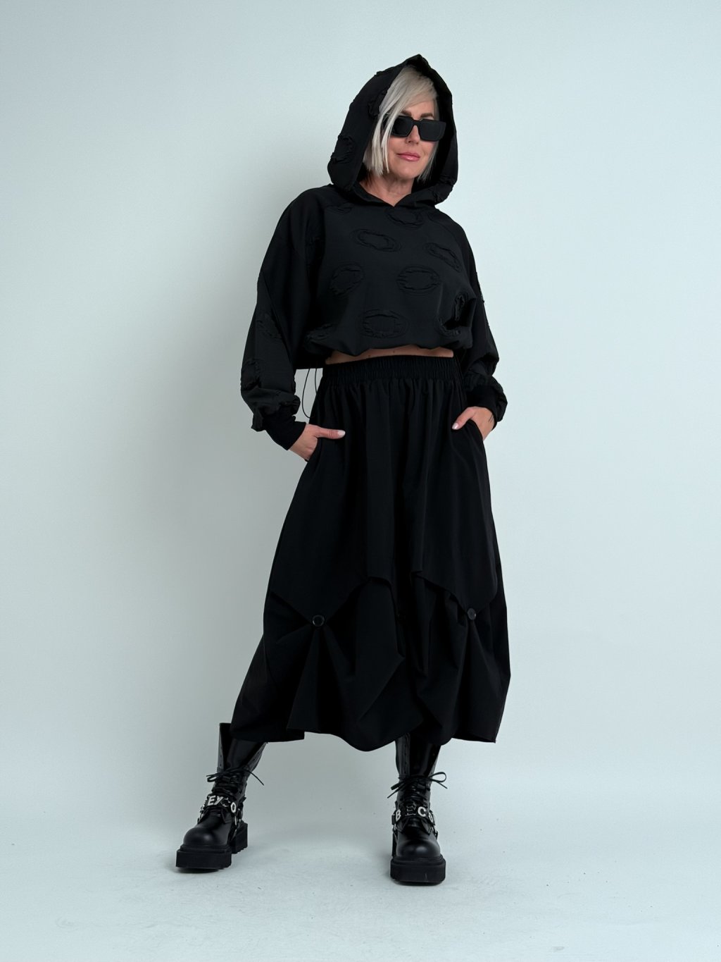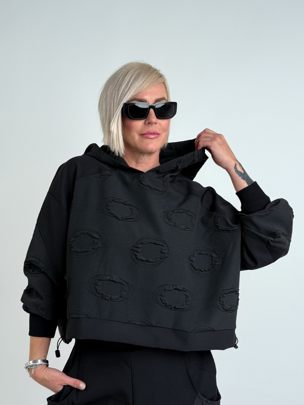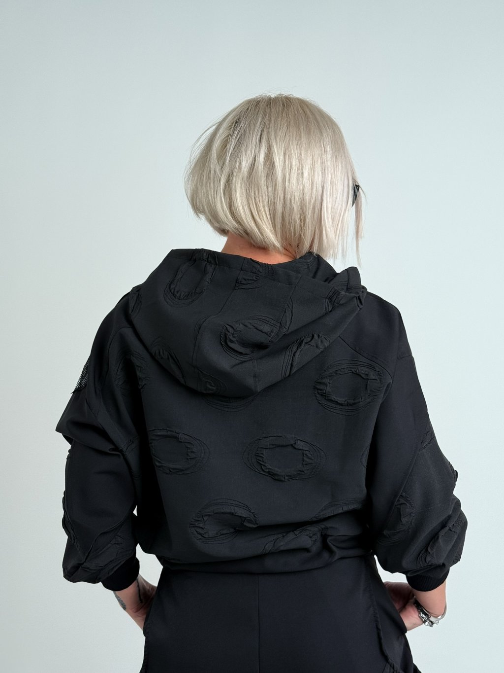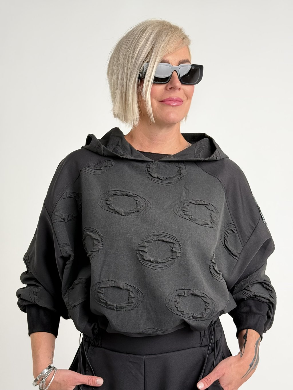 Super mikina v kombinácii viacerých vzorov látok, s dlhými rukávmi v náplete, kapucňou a spodným okrajom s možnosťou úpravy šírky.MIERKA, TIPY VHODNÉ PRE VEĽKÉ VELIČINY.