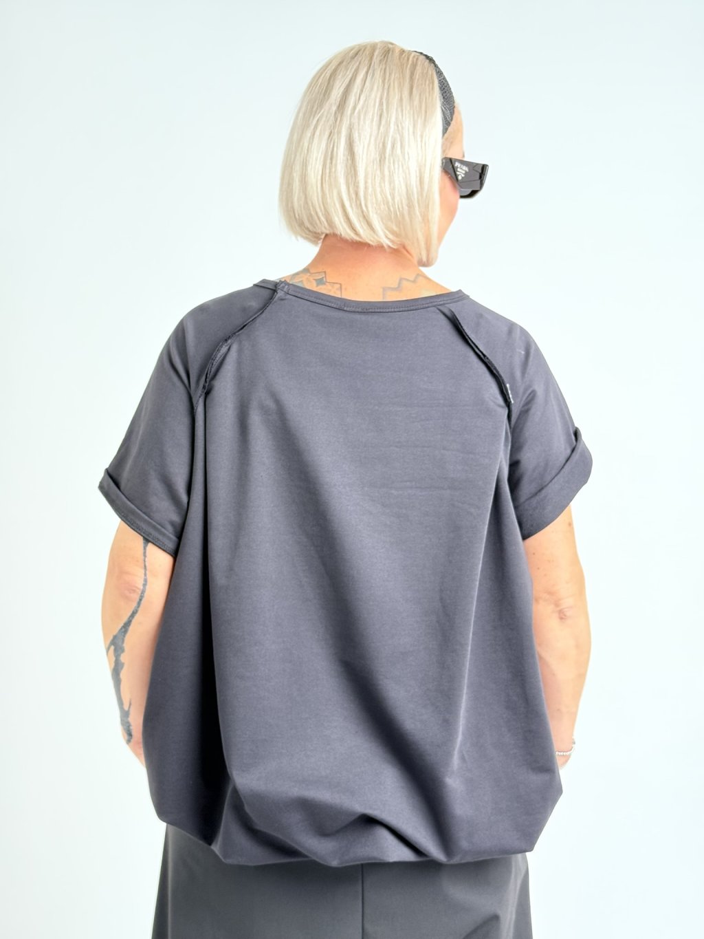 Jednoduchá tunika s elastickým pásom a krátkymi ohrnutými rukávmi.