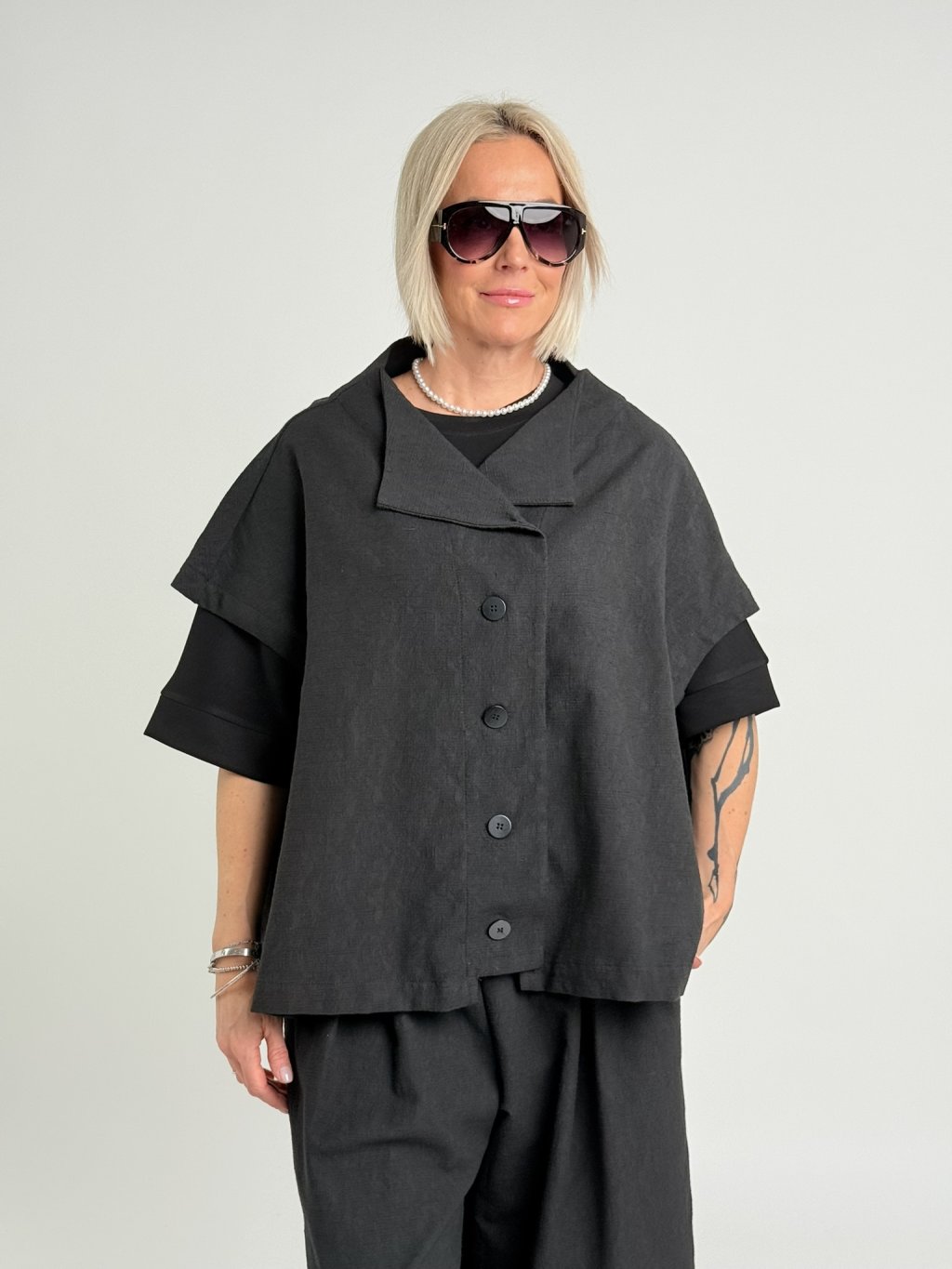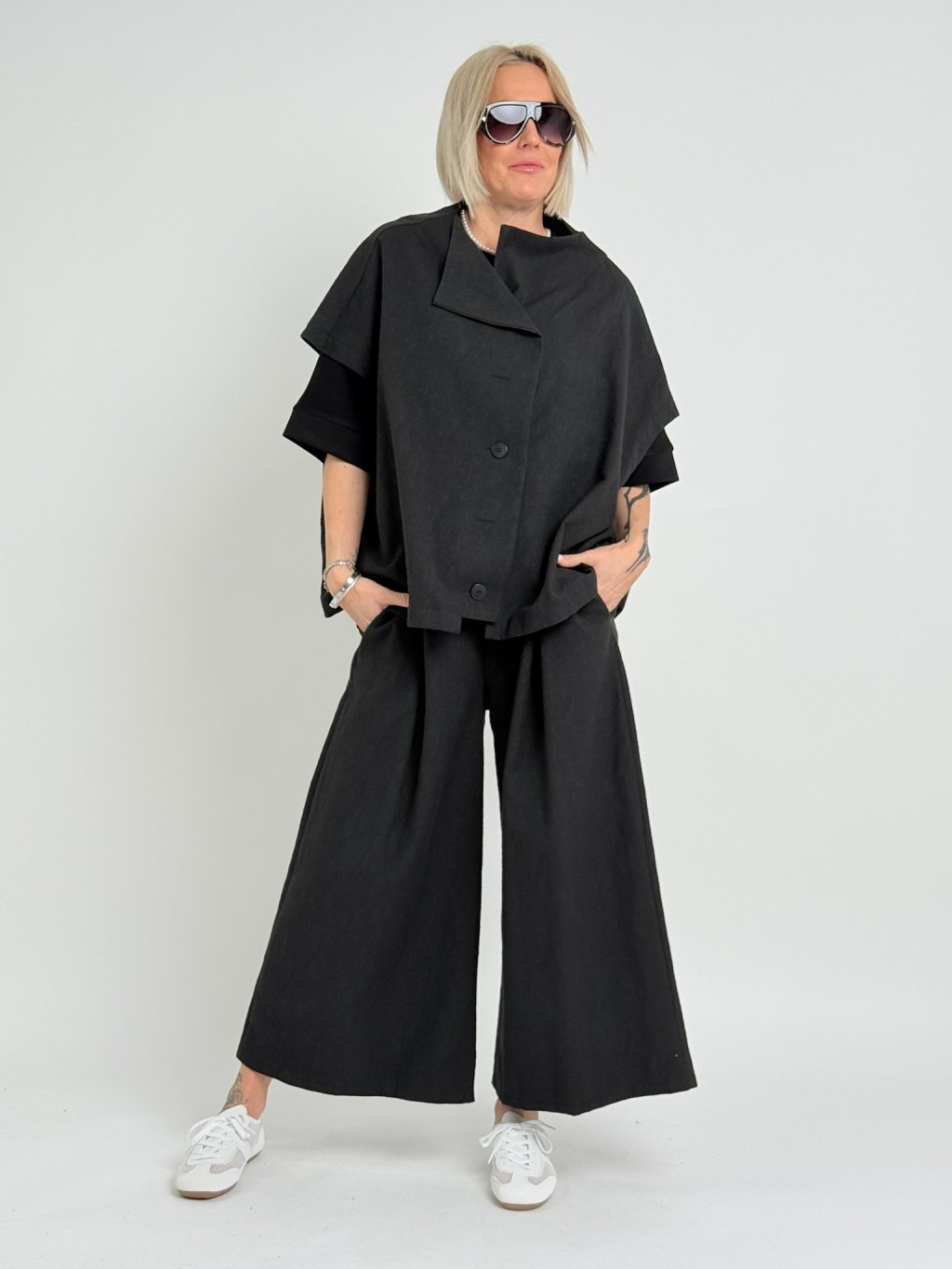 Dokonalá nadrozmerná vesta so zapínaním na gombíky, spadnutými rukávmi a rozšíreným výstrihom Super do páru s nohavicami WAYO. Krásny, plastický materiál.