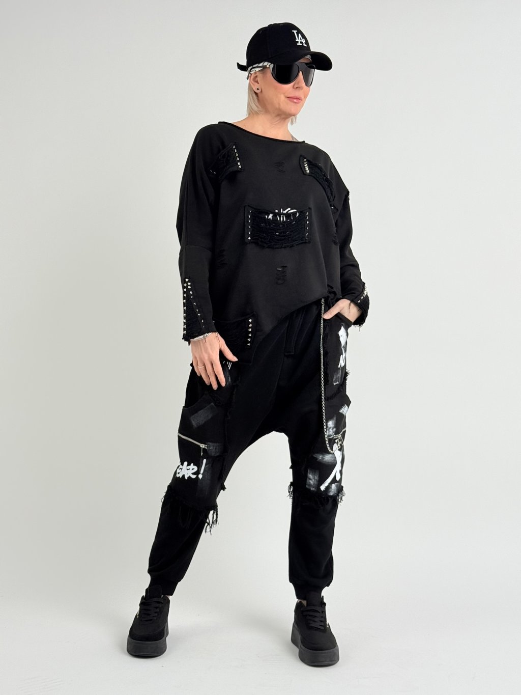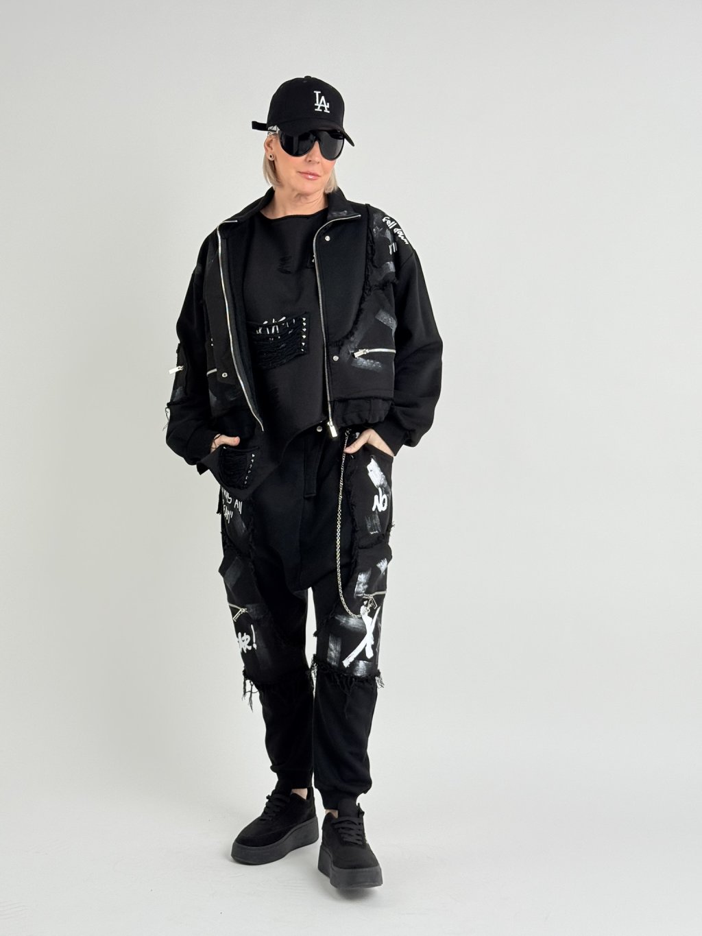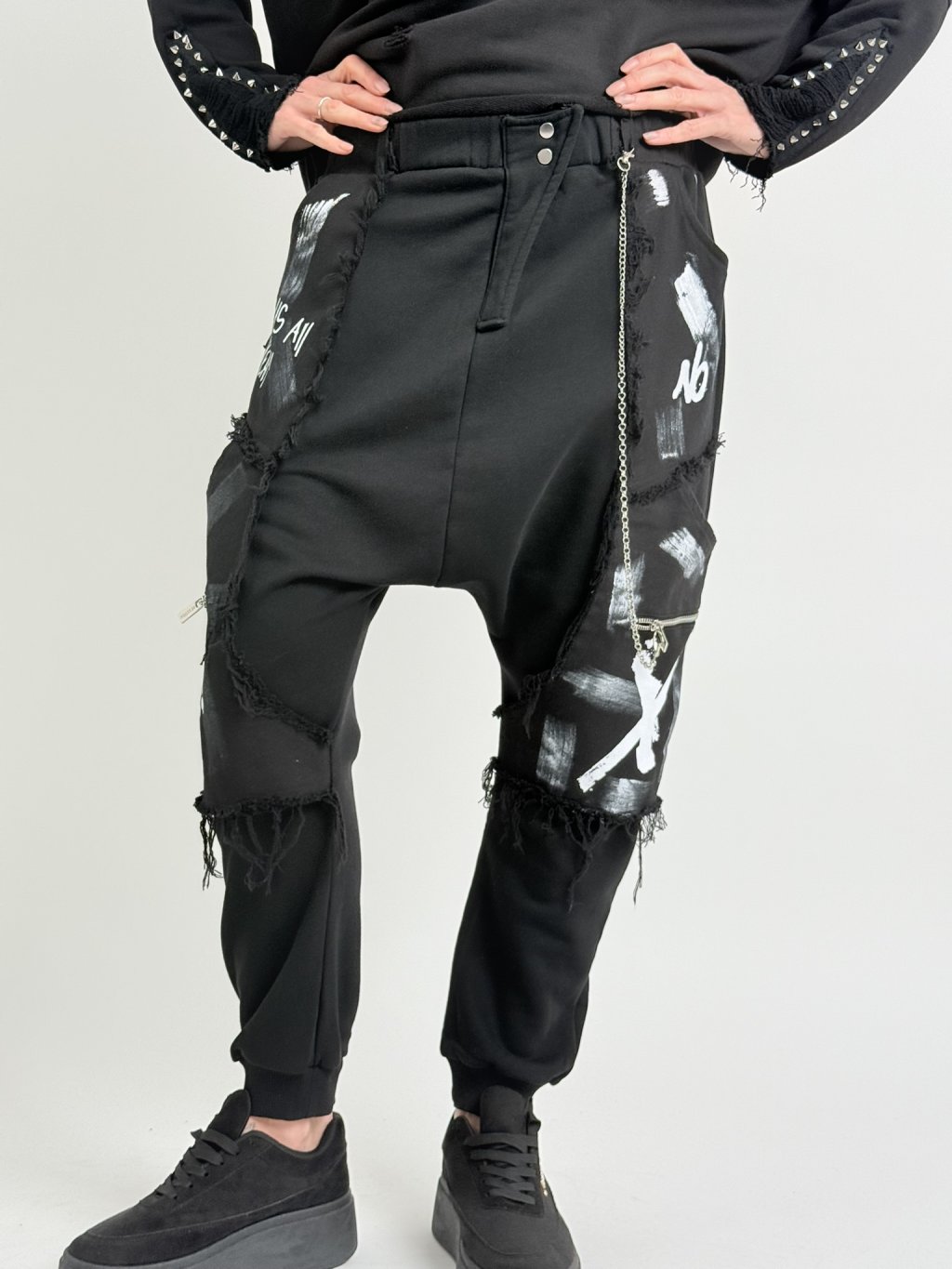 Vrecovité nohavice s elastickým pásom, čiernobielou potlačou, naznačeným poklopcom a ozdobnou retiazkou.