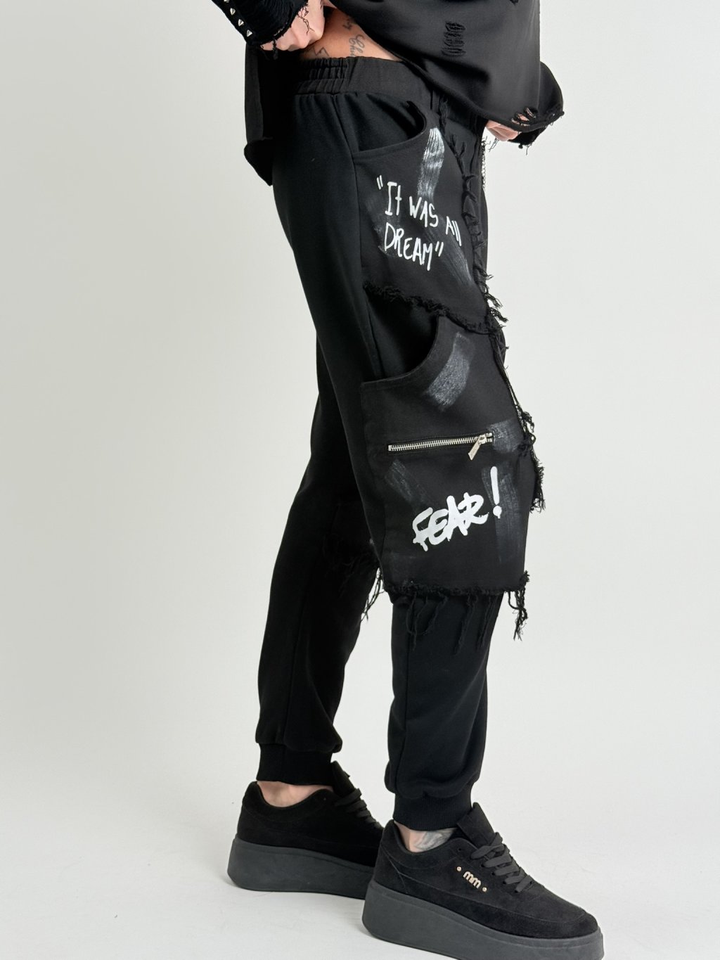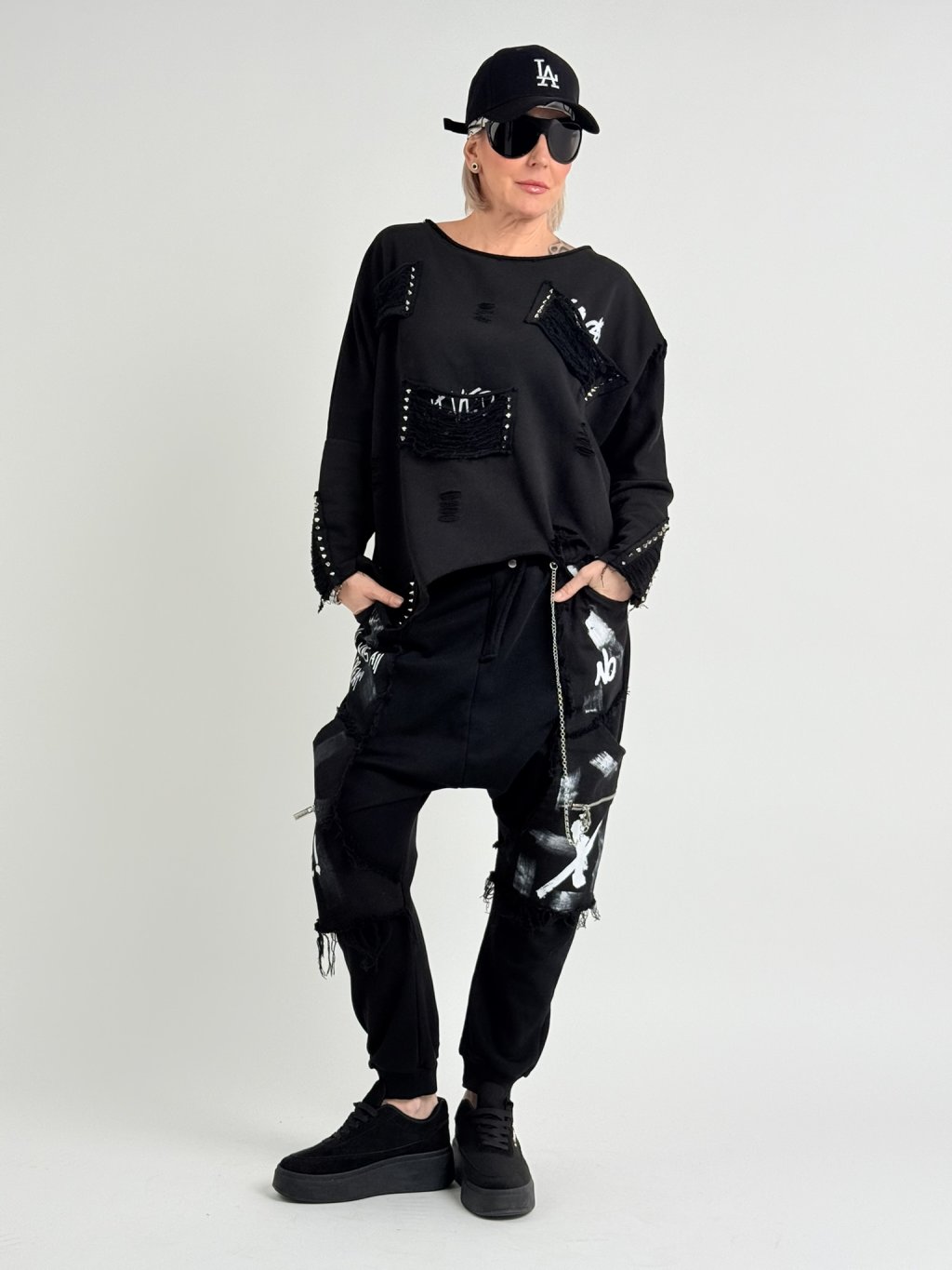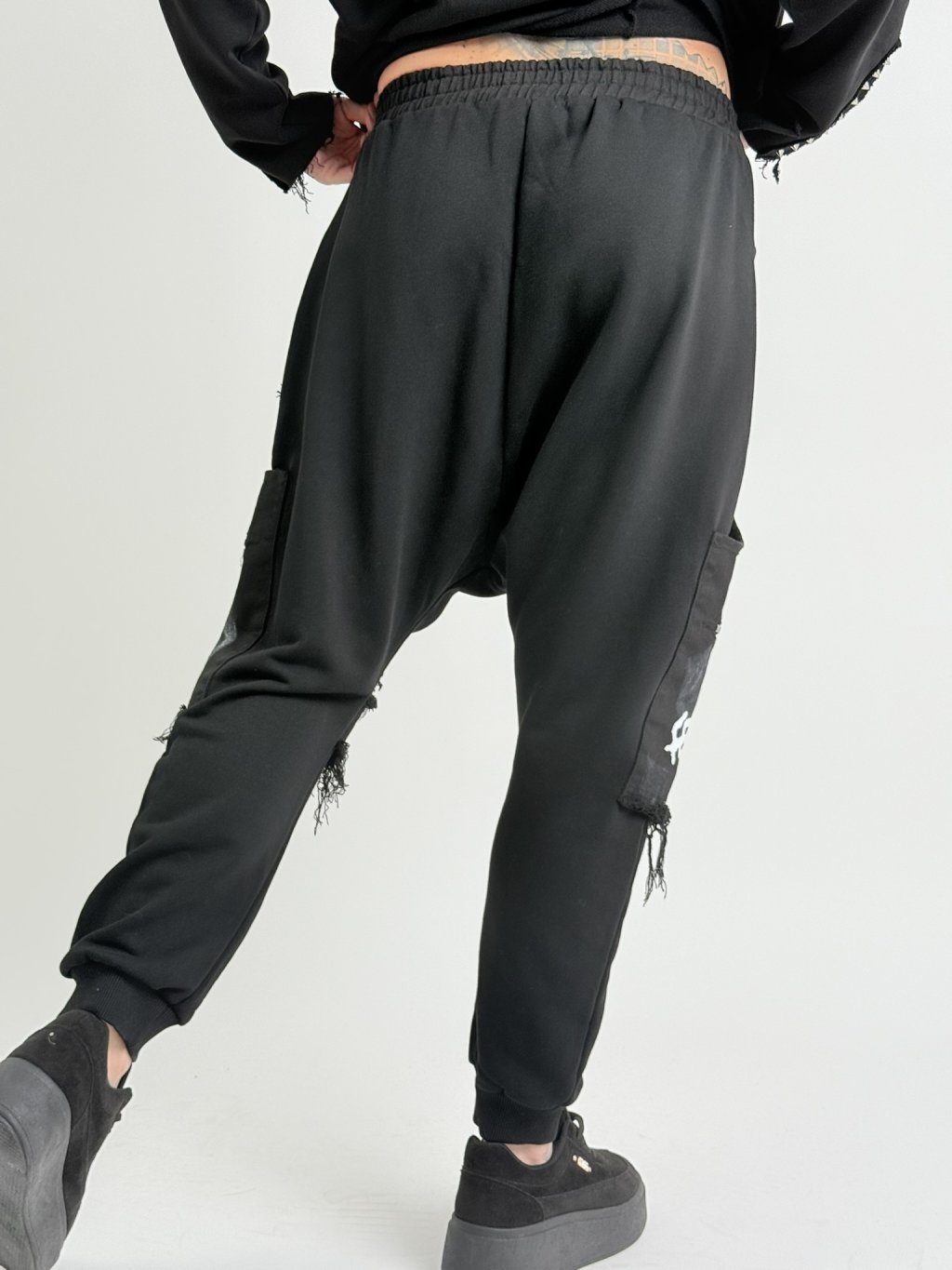 Vrecovité nohavice s elastickým pásom, čiernobielou potlačou, naznačeným poklopcom a ozdobnou retiazkou.