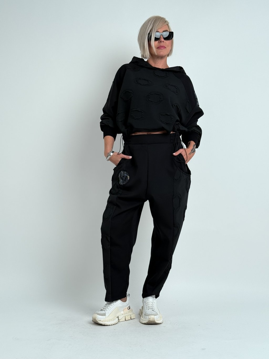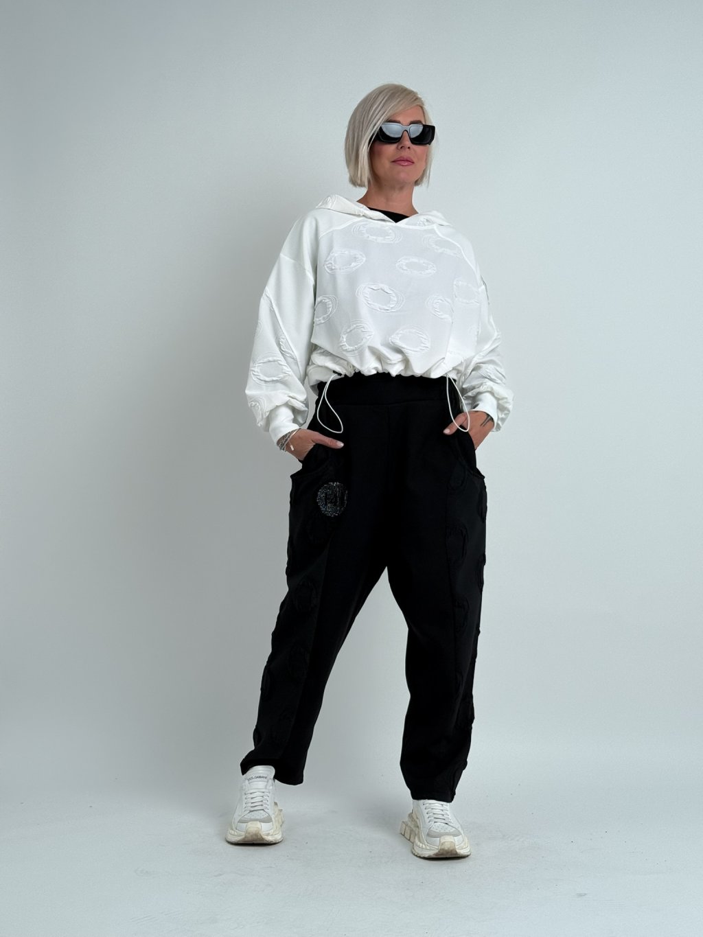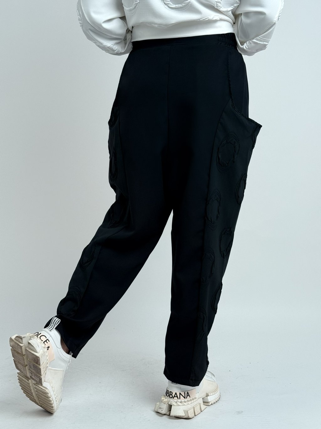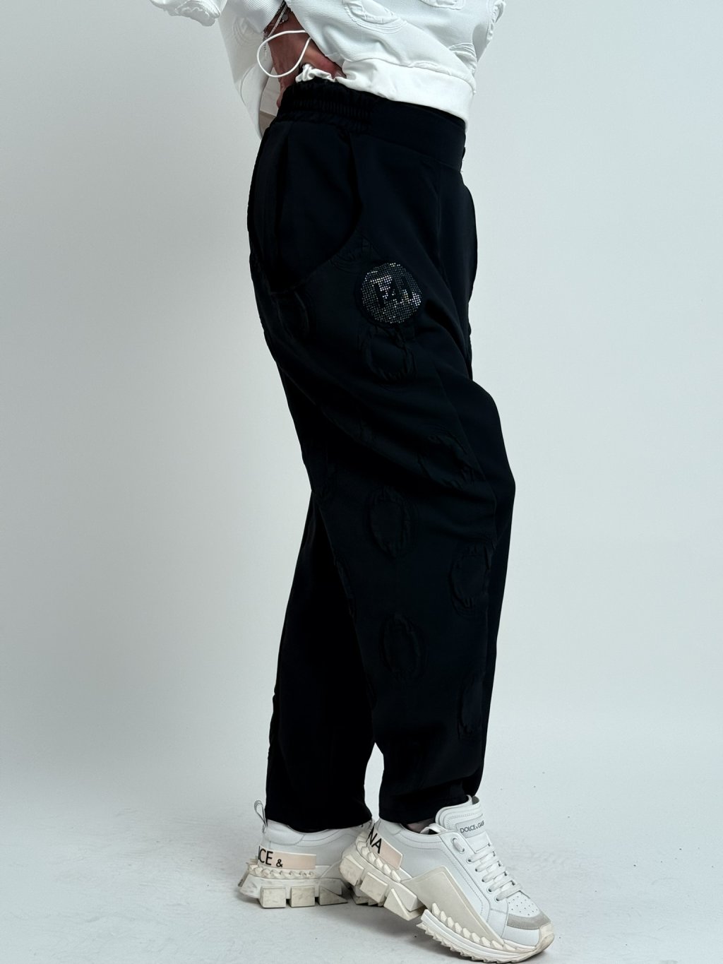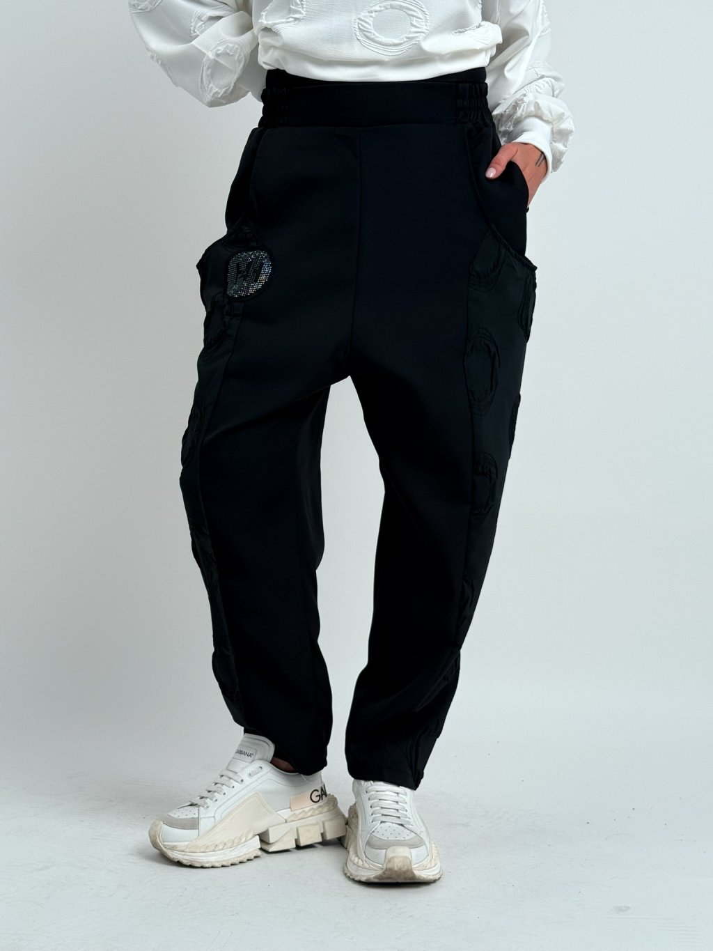 Luxusné nohavice so zníženým sedom, v kombinácii viacerých vzorov látok v elastickom páse a väčších vreciek.