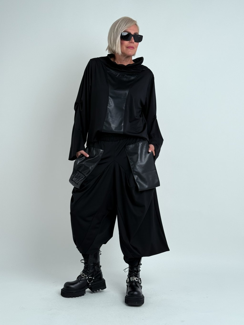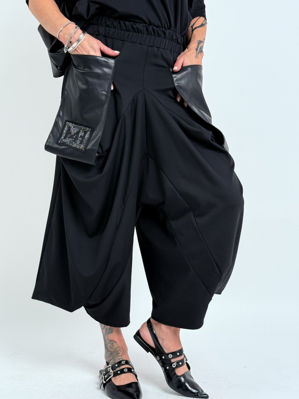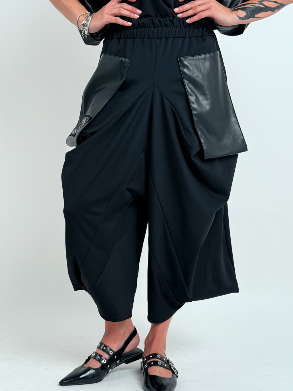 Luxusné, zaujímavo navrhnuté, pohodlné baggies v modernom strihu, elastický pás, kombinované s koženkou.
