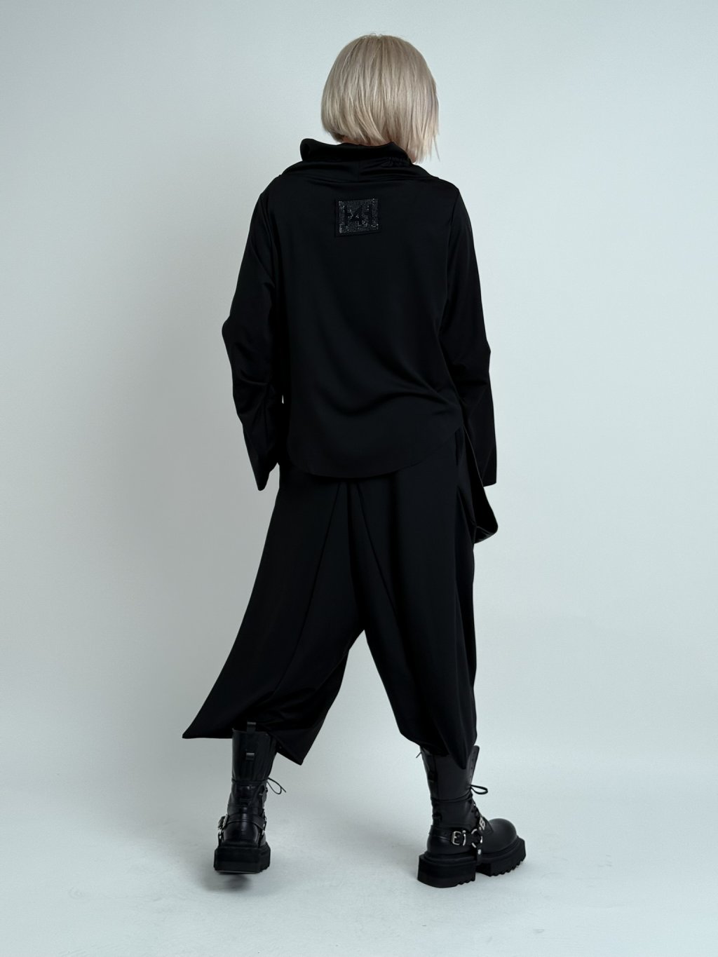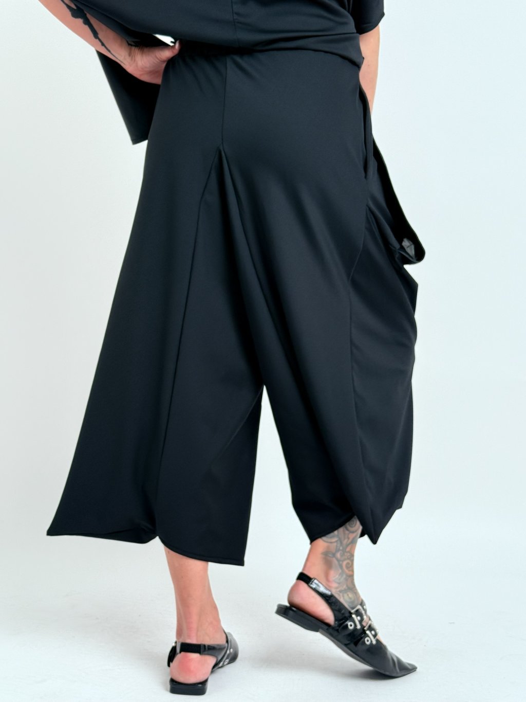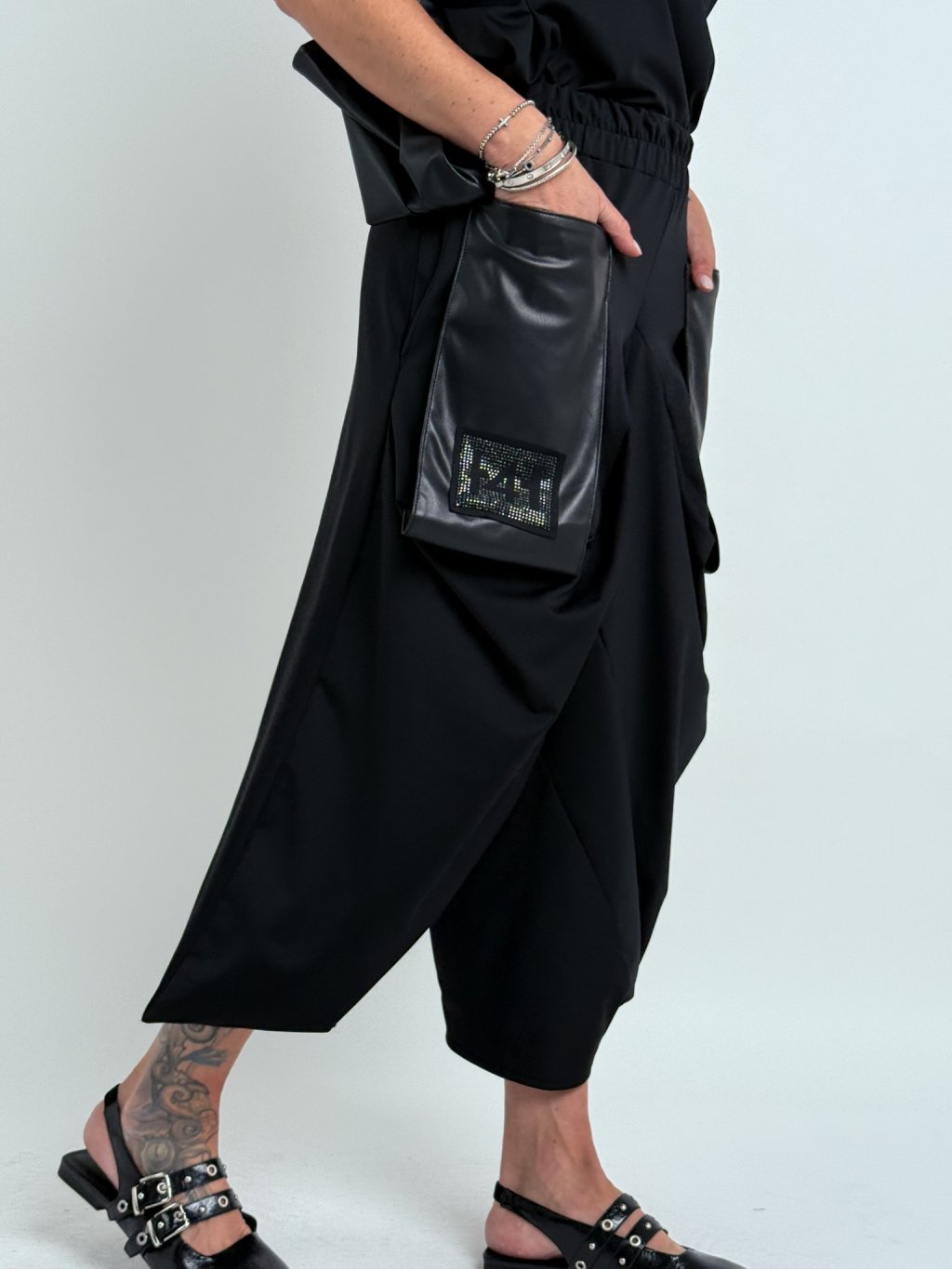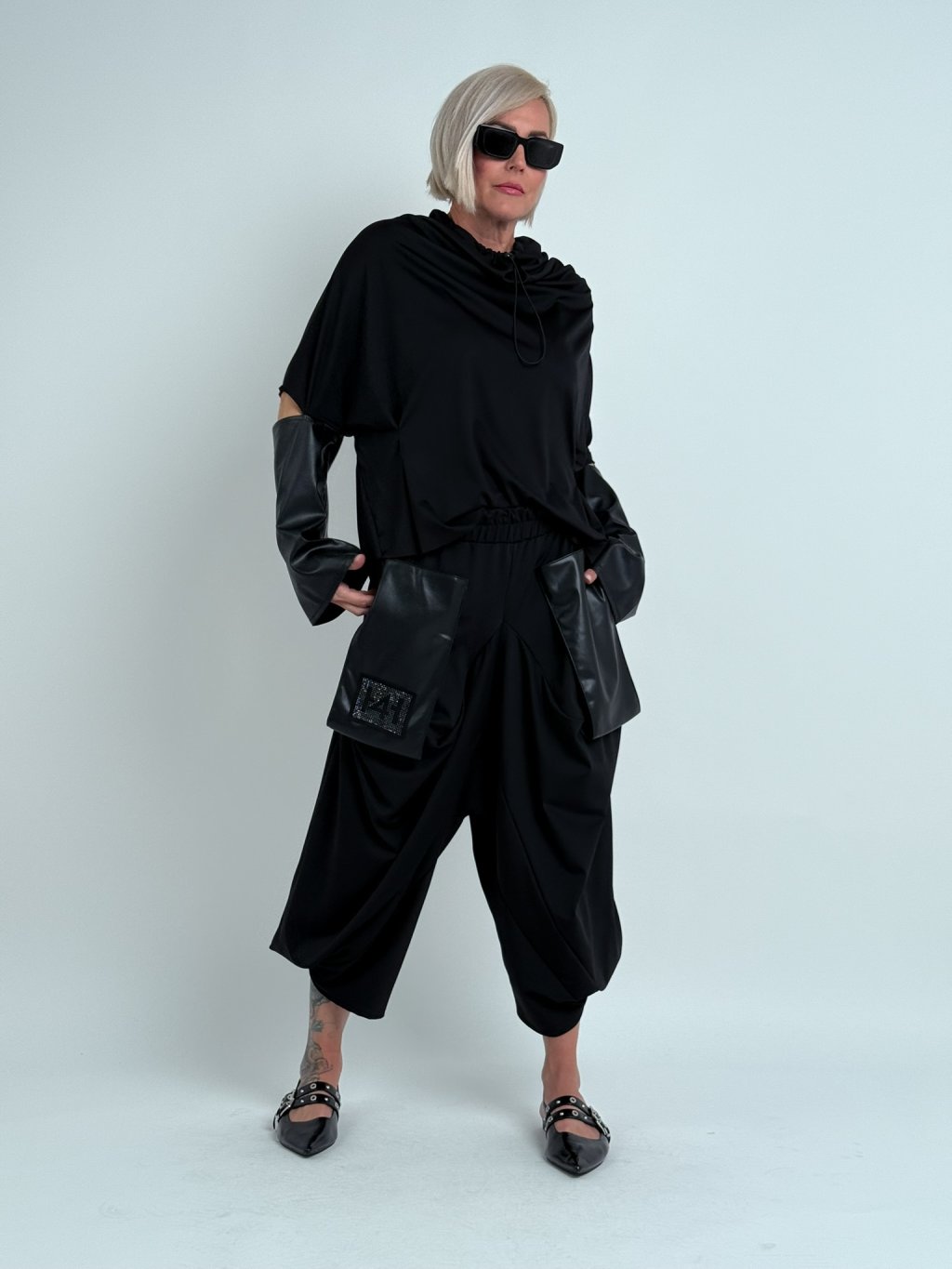 Luxusné, zaujímavo navrhnuté, pohodlné baggies v modernom strihu, elastický pás, kombinované s koženkou.
