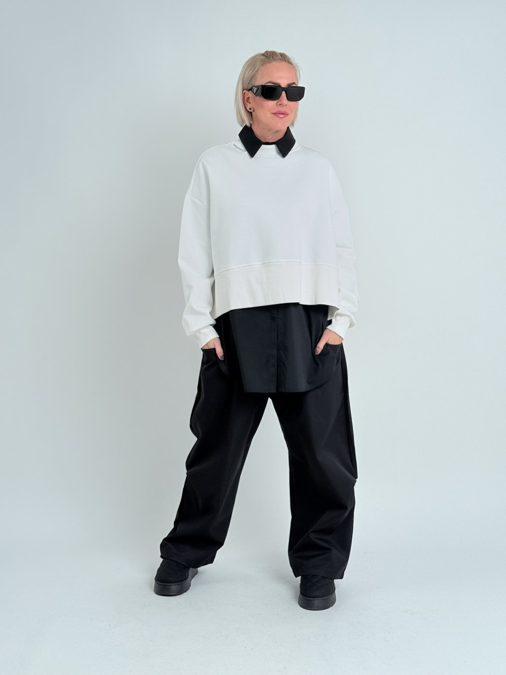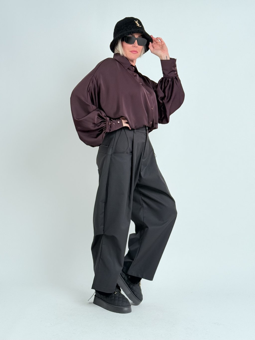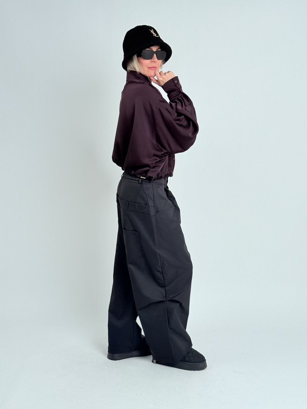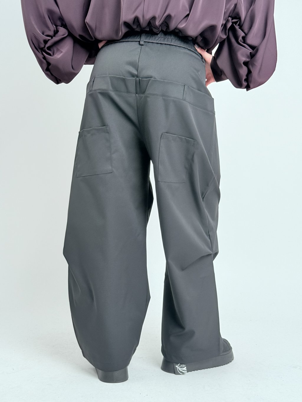 Super nohavice v zaujímavom strihu, s gumou v zadnej časti a dvojitým pásom s pútkami na opasok. S hlbokými vreckami vpredu a samodržiacimi vreckami na nohaviciach.