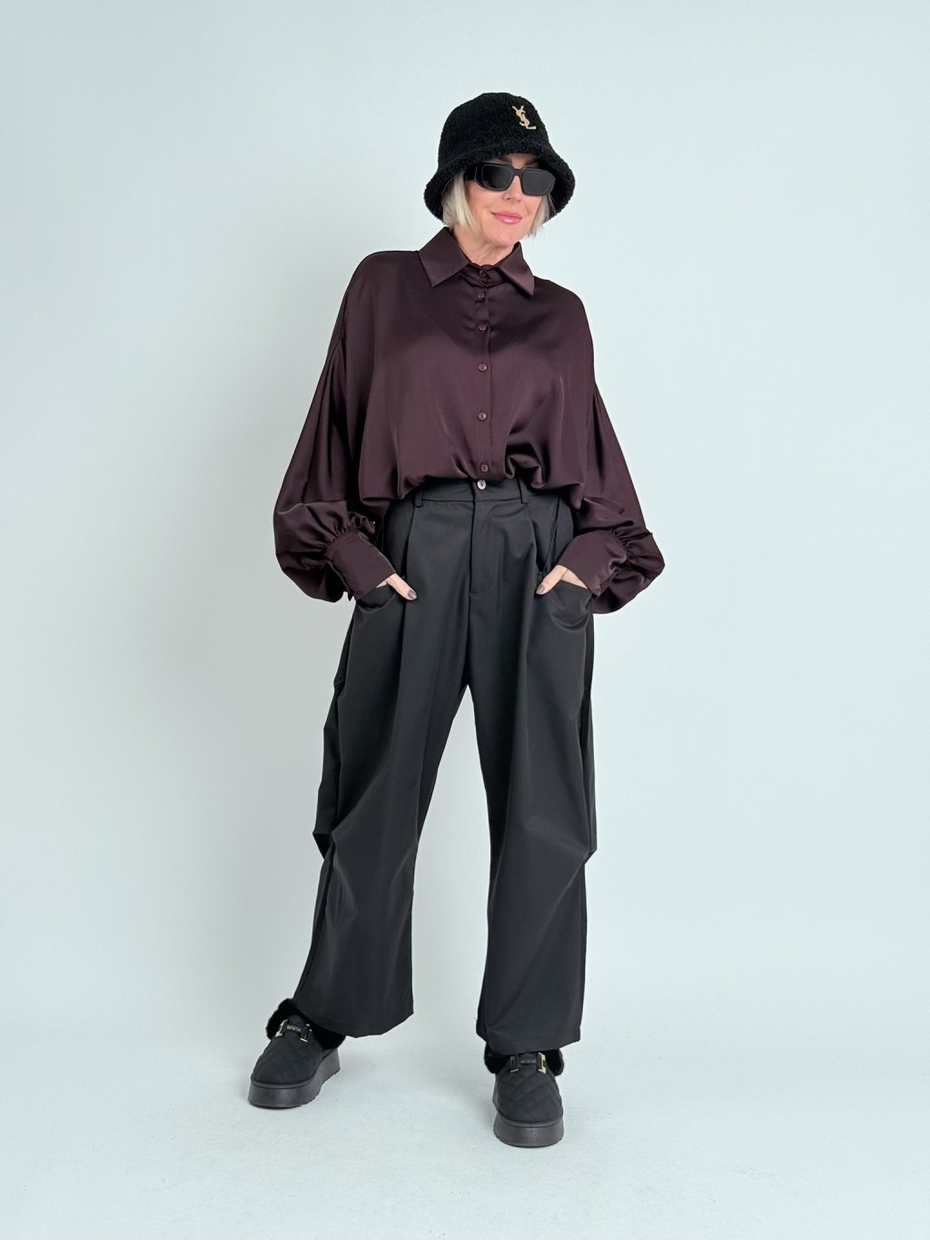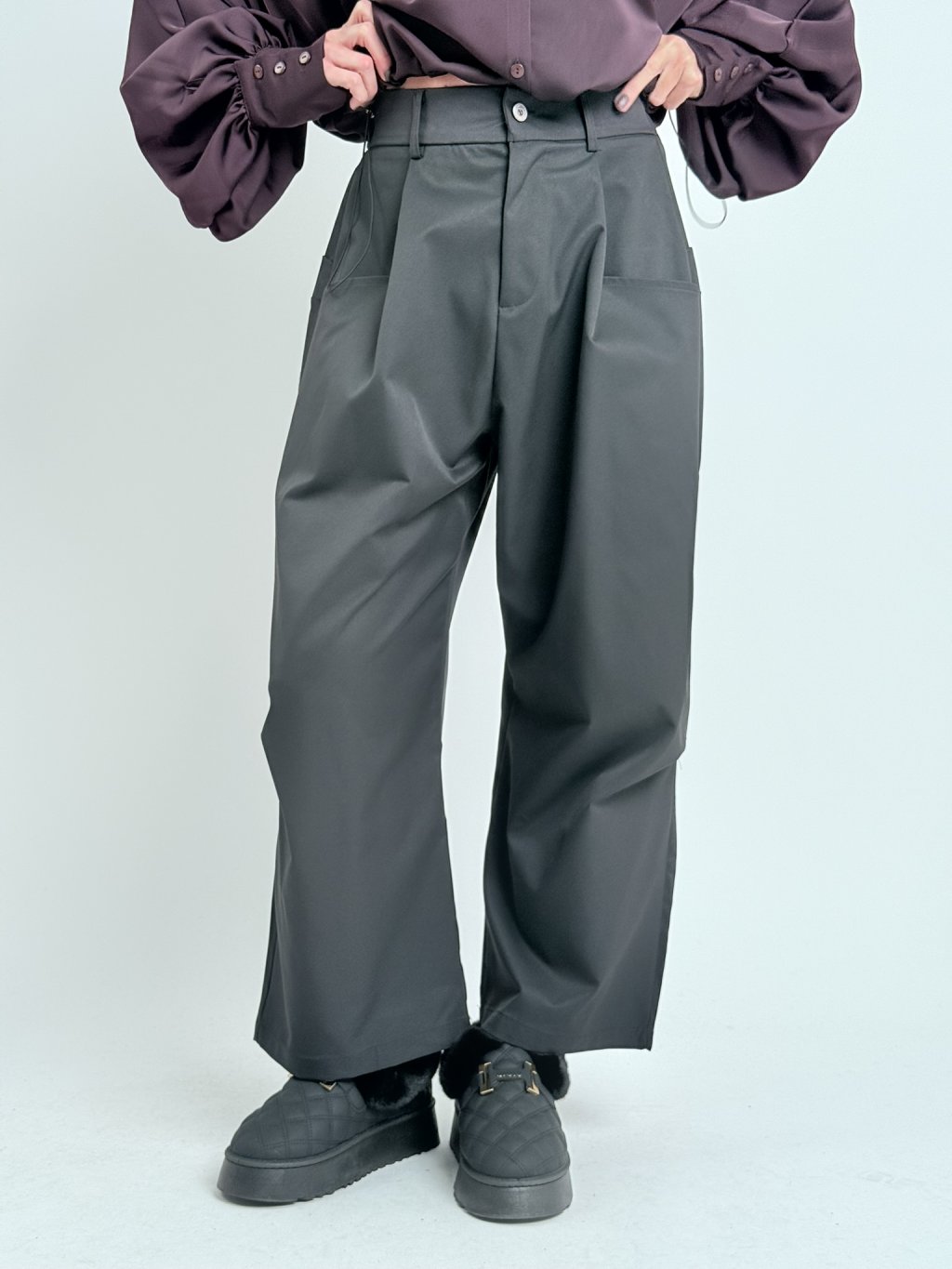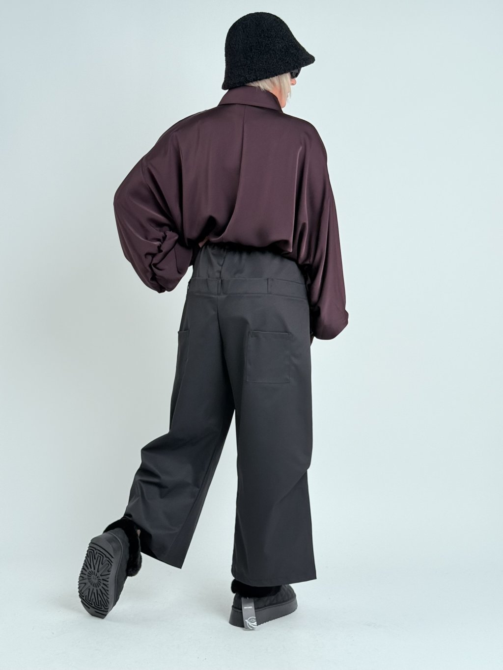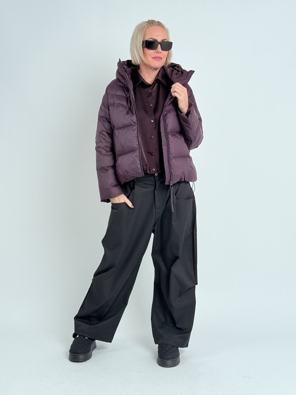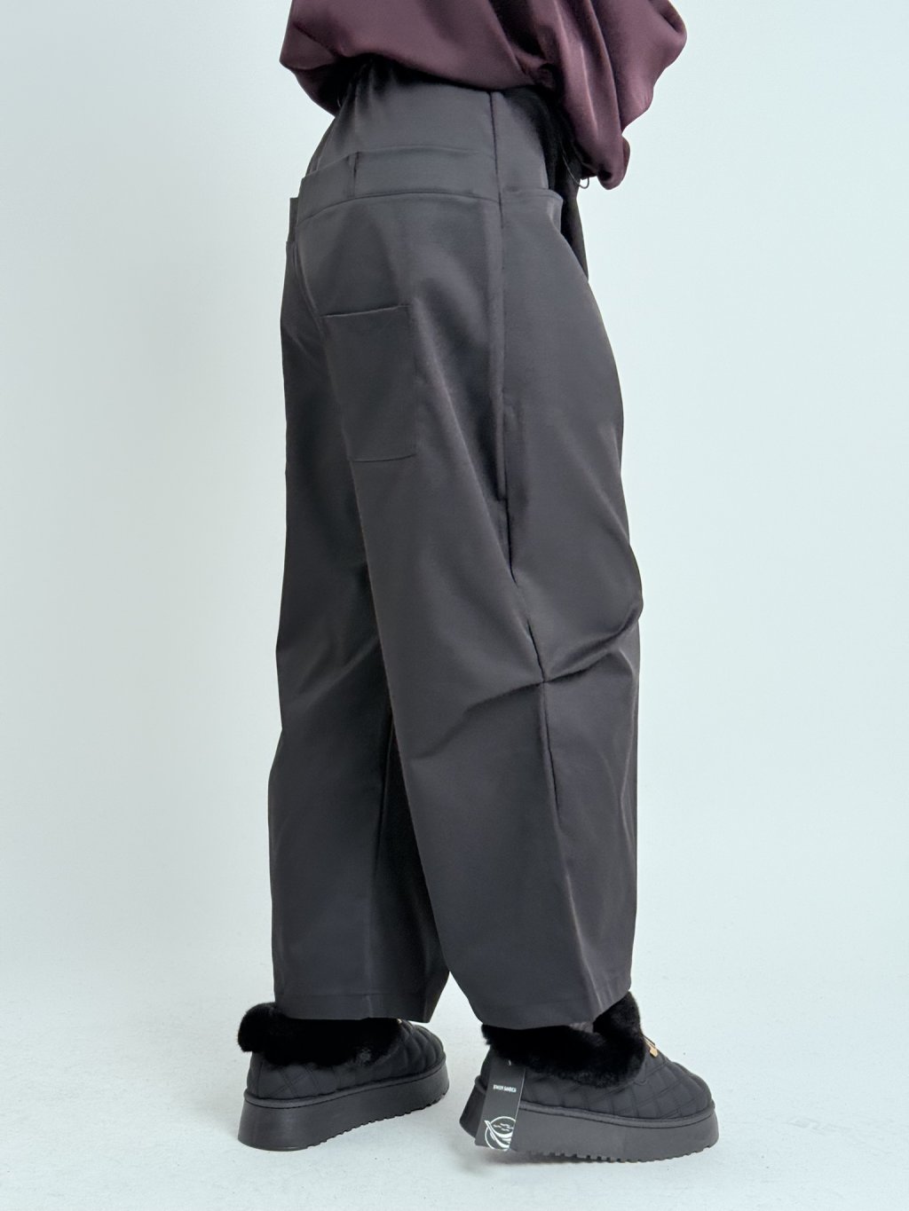 Super nohavice v zaujímavom strihu, s gumou v zadnej časti a dvojitým pásom s pútkami na opasok. S hlbokými vreckami vpredu a samodržiacimi vreckami na nohaviciach.