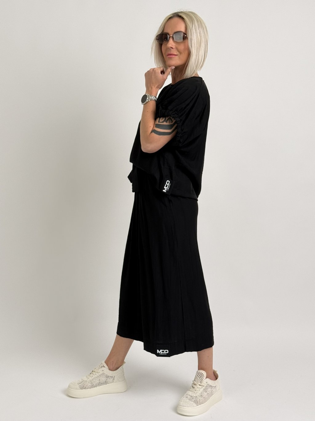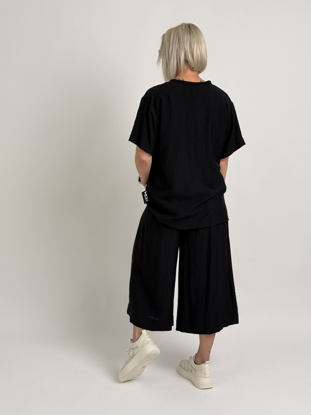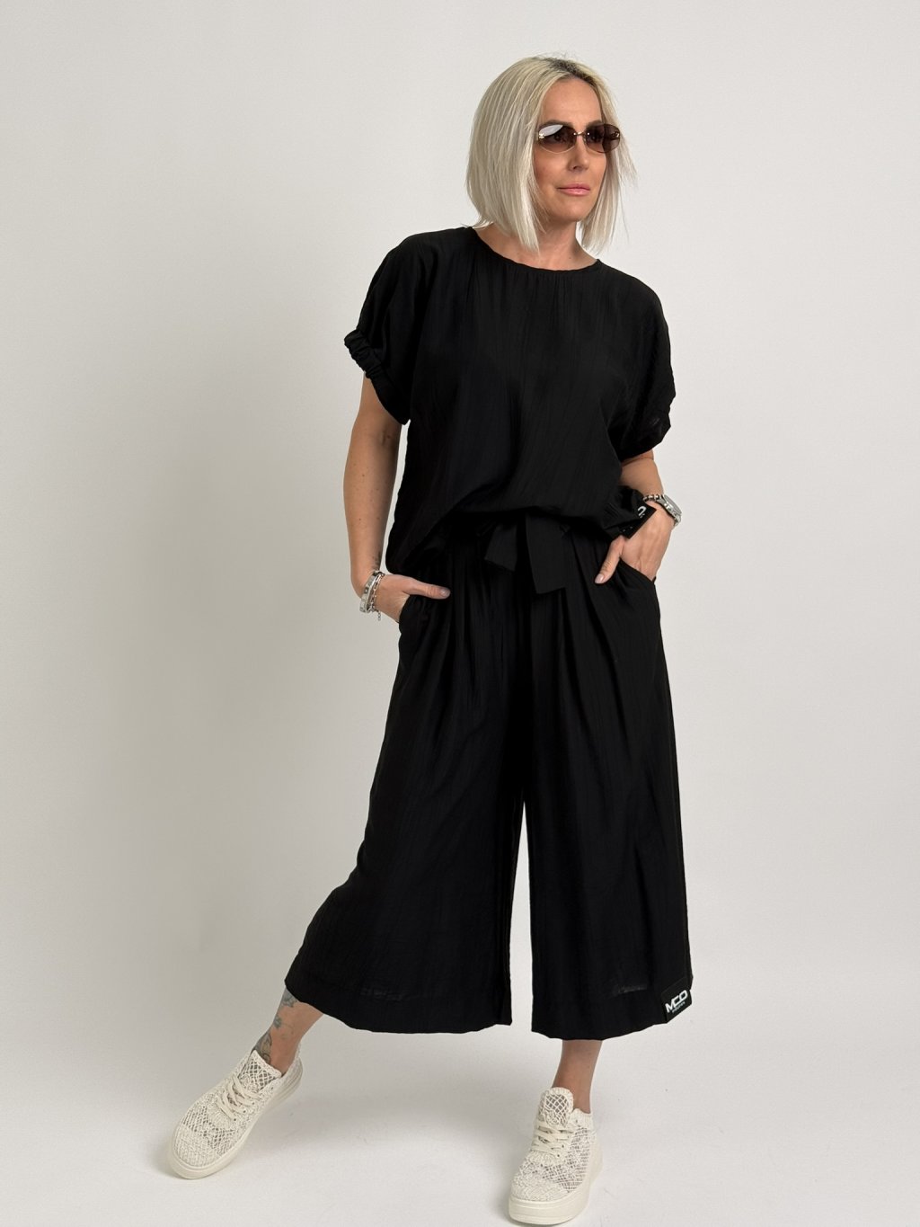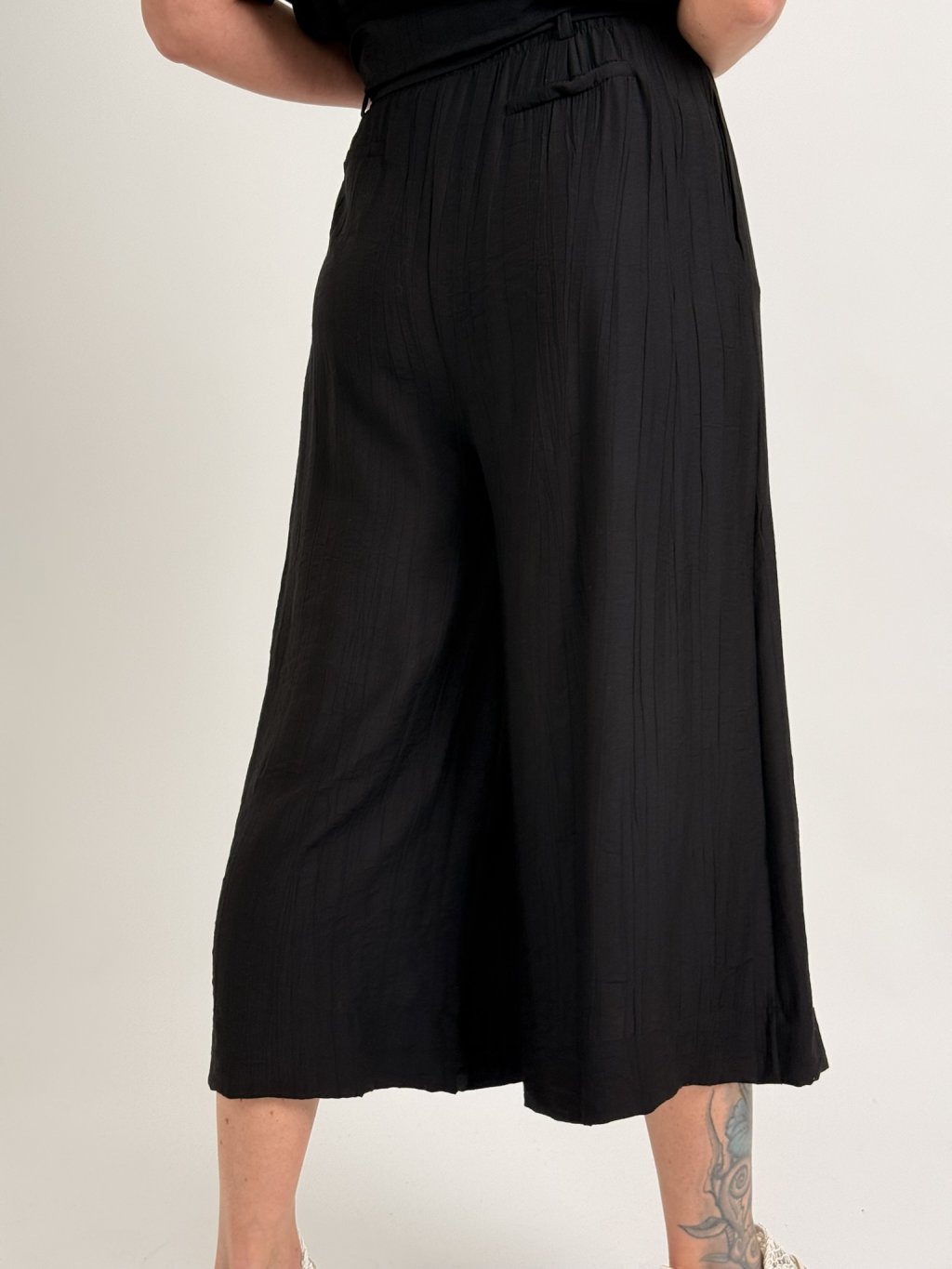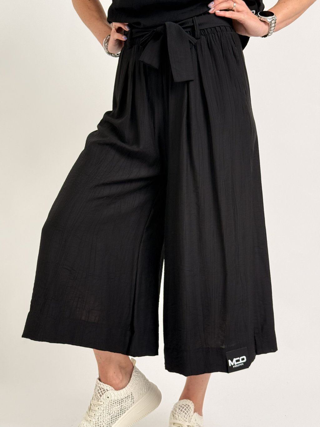 Dokonalé, široké 7/8 nohavice, elastický pás a opasok s motýlikom. Krásny, ľahký, takmer nemačkavý materiál.